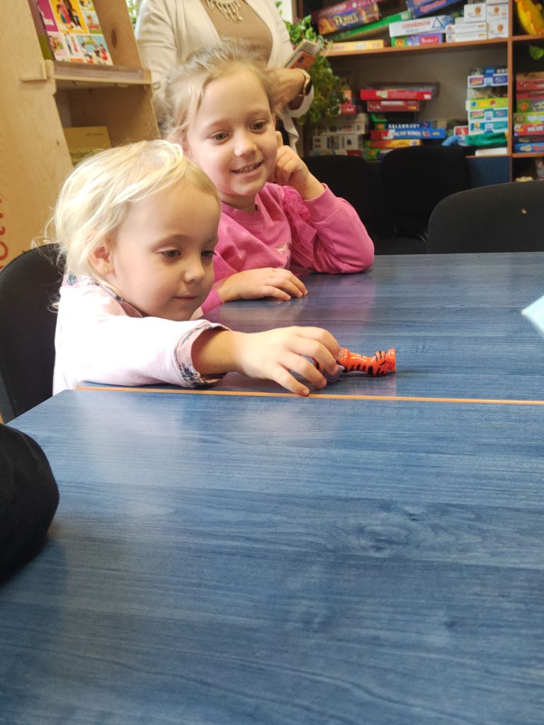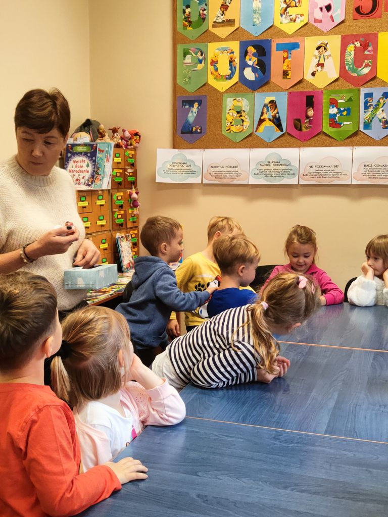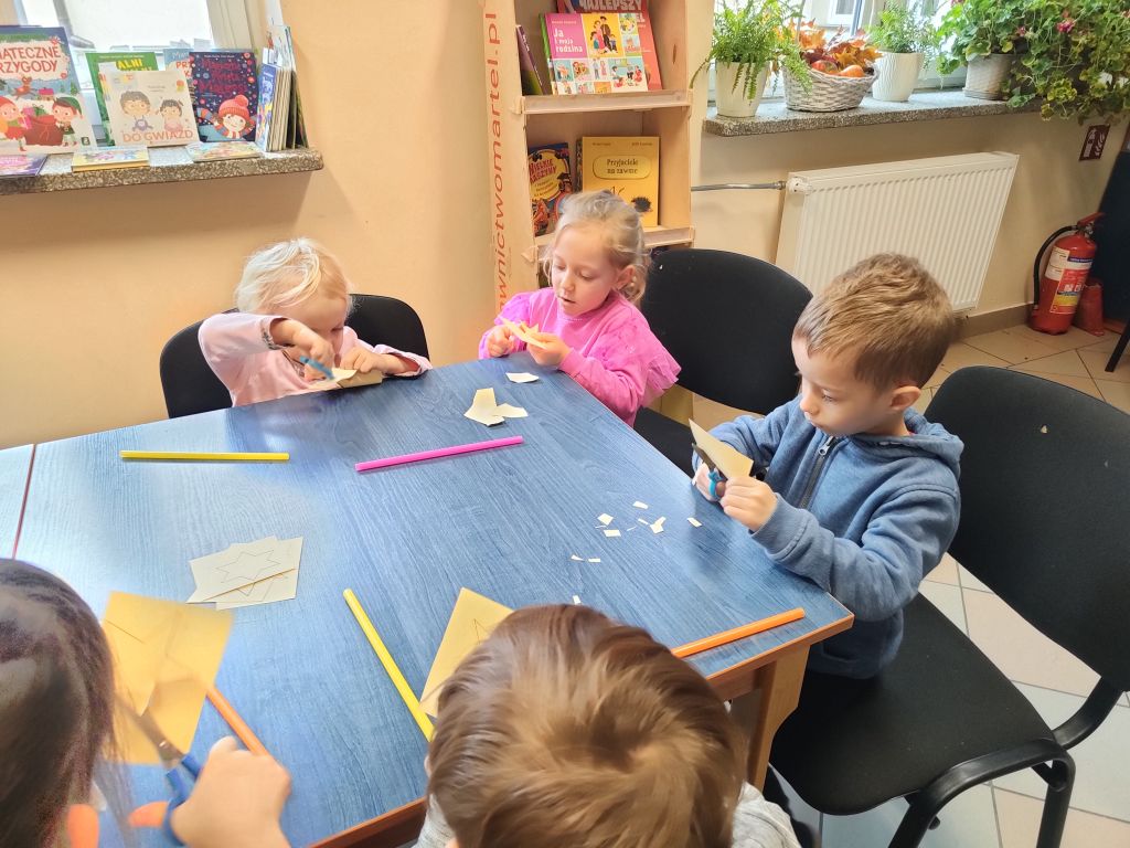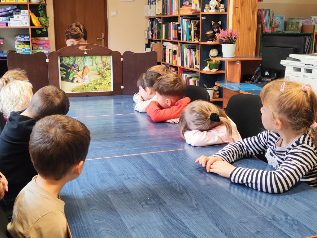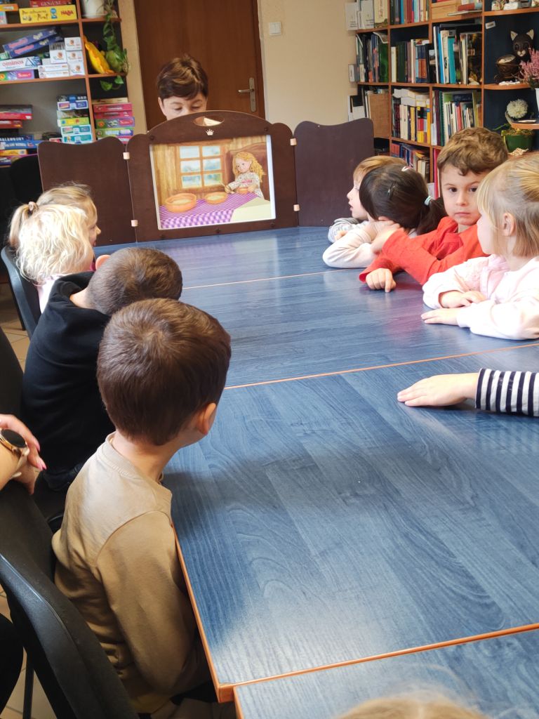 Dzieci z grupy Sówki na zajęciach w szkolnej bibliotece
