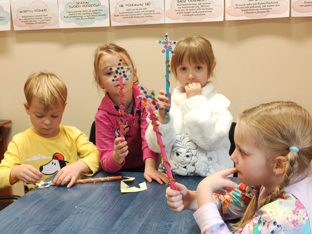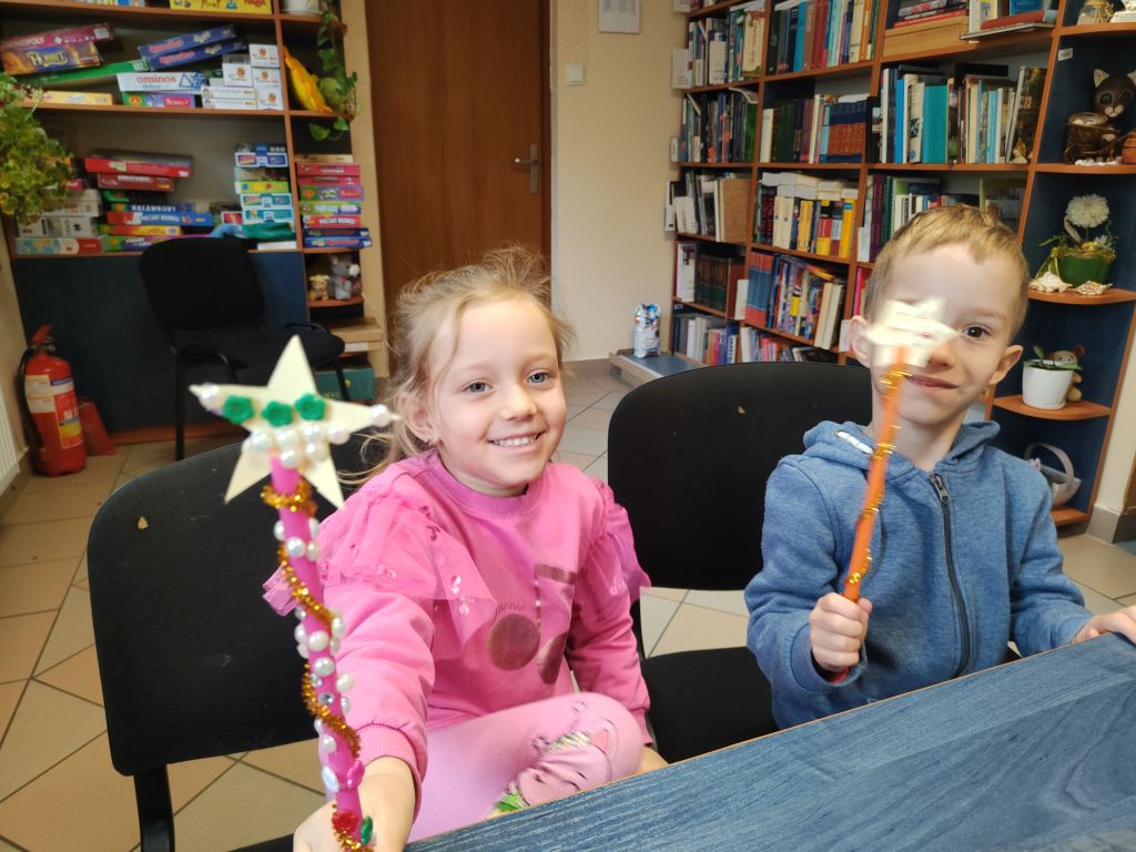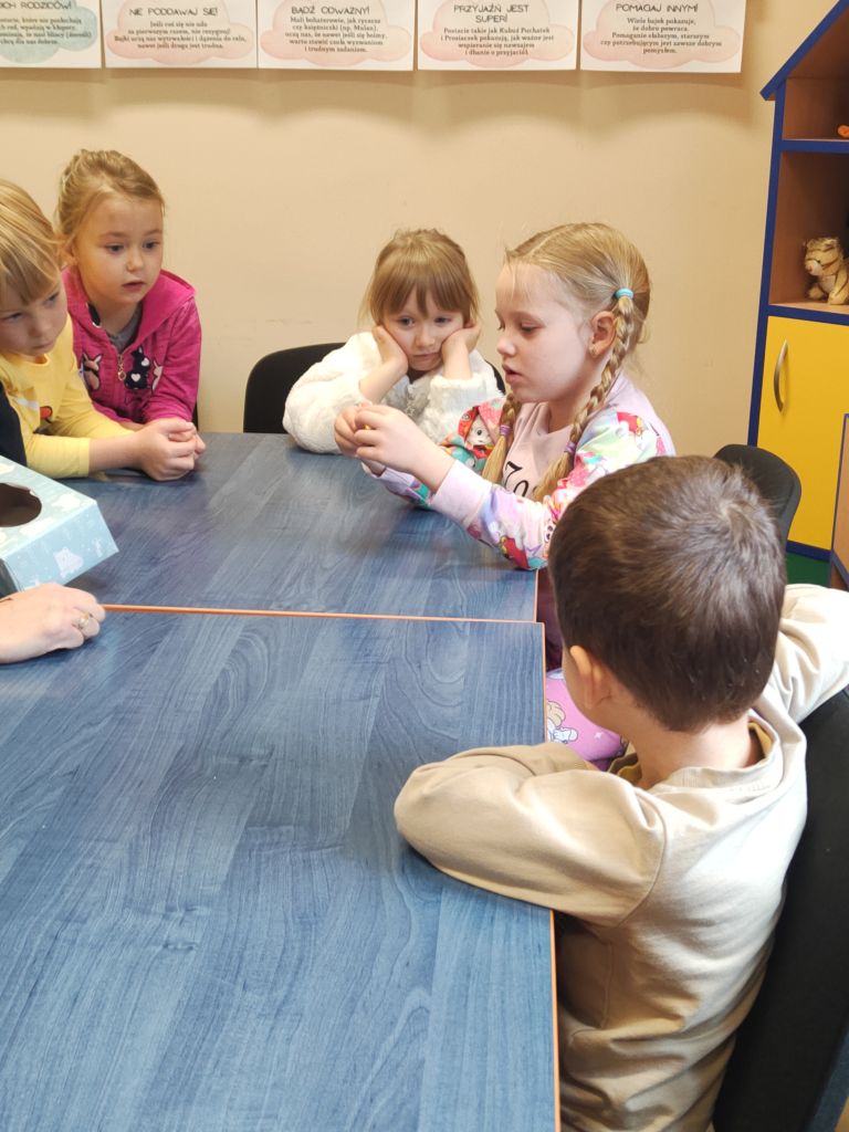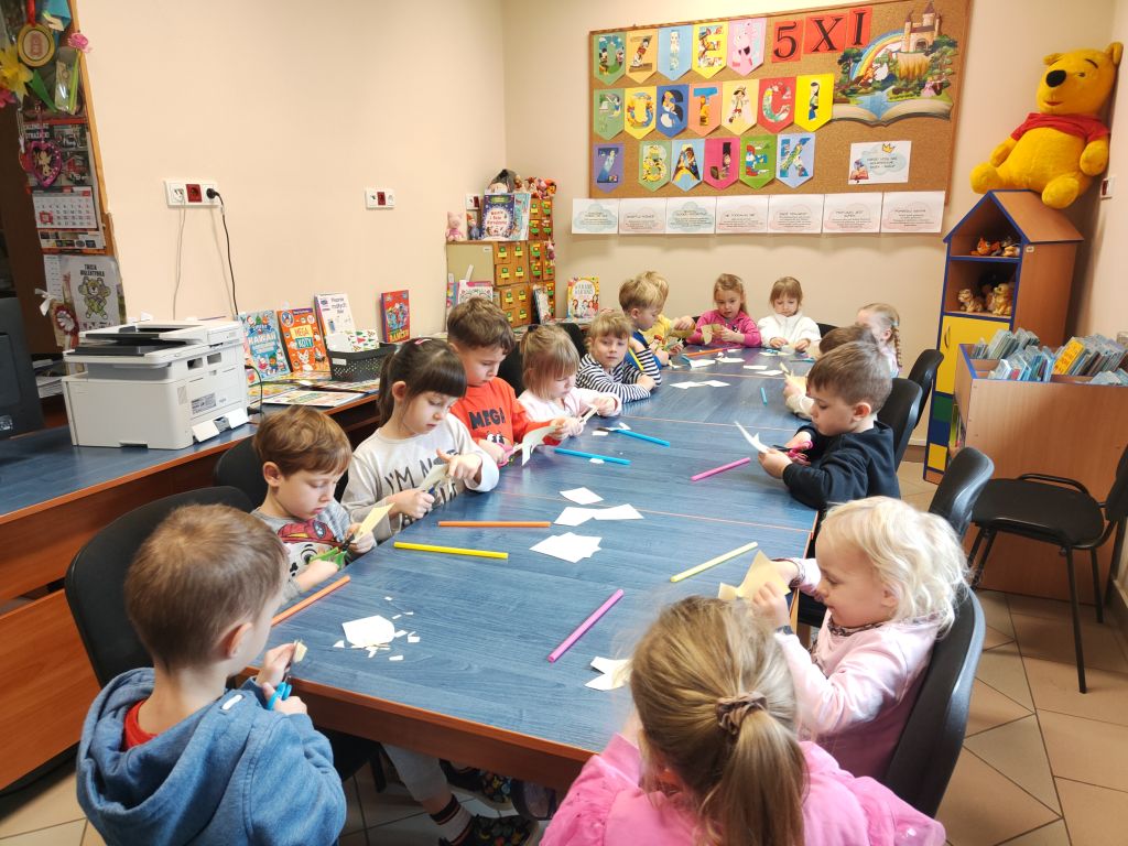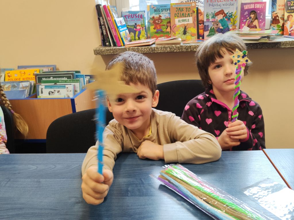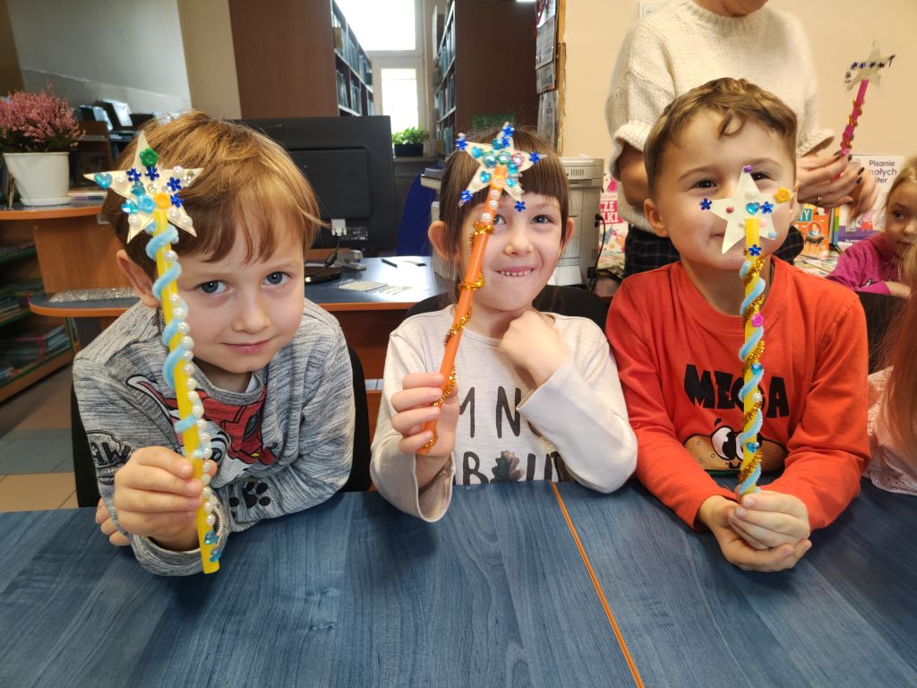 Dzieci z grupy Sówki na zajęciach w szkolnej bibliotece