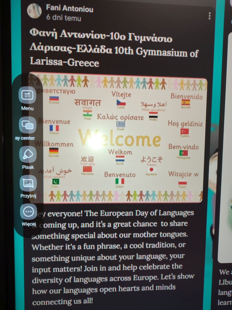 Tego dnia w naszej szkole odbyła się wyjątkowa audycja z okazji Europejskiego Dnia Języków Obcych, będąca jednym z działań Szkolnego Klubu Europejskiego. Już od rana szkolne korytarze wypełniła muzyka – na przerwach uczniowie z zaciekawieniem słuchali fragmentów piosenek w różnych językach i odgadywali tytuły utworów oraz języki, w których były śpiewane. Dodatkowo rozbrzmiewały tradycyjne powitania w wielu językach, co jeszcze bardziej przyciągało uwagę i budowało wyjątkową, międzynarodową atmosferę.