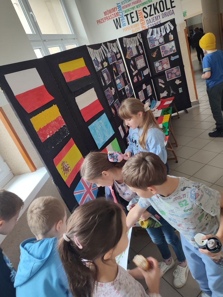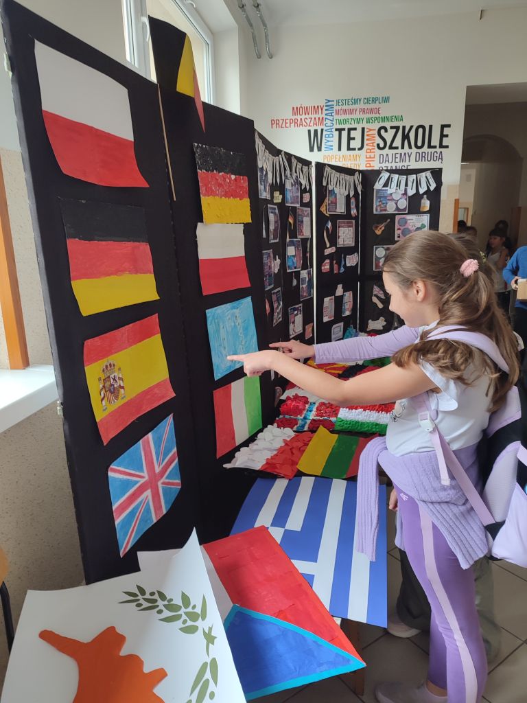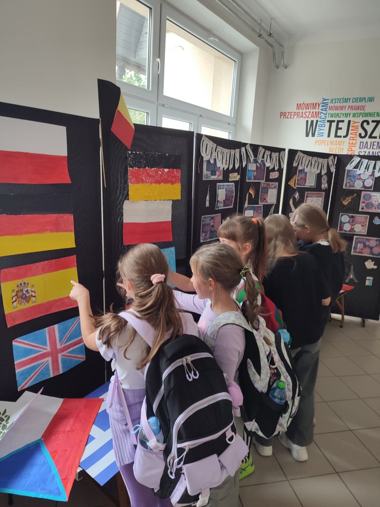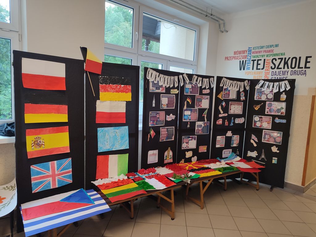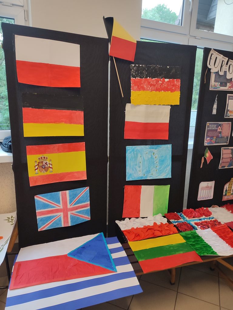 Kreatywną częścią obchodów było przygotowanie przez każdą klasę flag wybranego kraju europejskiego w formacie A3. Prace wykonano w różnorodnych technikach, a efekty były zachwycające, pokazując zarówno talent, jak i staranność uczniów. Każdy zespół klasowy wziął udział w tej inicjatywie, co potwierdziło wielkie zaangażowanie młodzieży i współpracę w klasie.