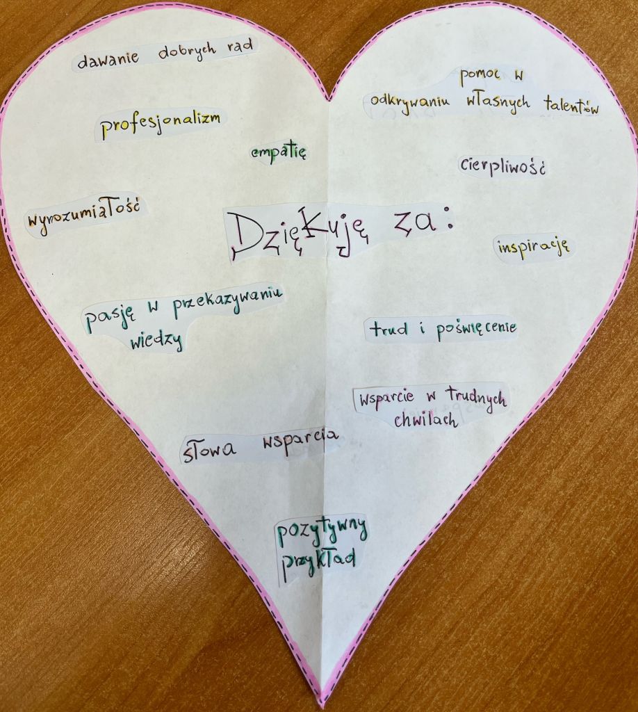 Następnie uczniowie otrzymali papierowe serca, na których napisali, za co są wdzięczni swoim nauczycielom. Wśród odpowiedzi pojawiły się słowa: „za cierpliwość”, „za pomoc w odkrywaniu własnych talentów”, „za poświęcony czas”, „za dobre rady”, „za wsparcie w trudnych chwilach”. Serduszka zostały zebrane i stworzyły wspólną tablicę wdzięczności.