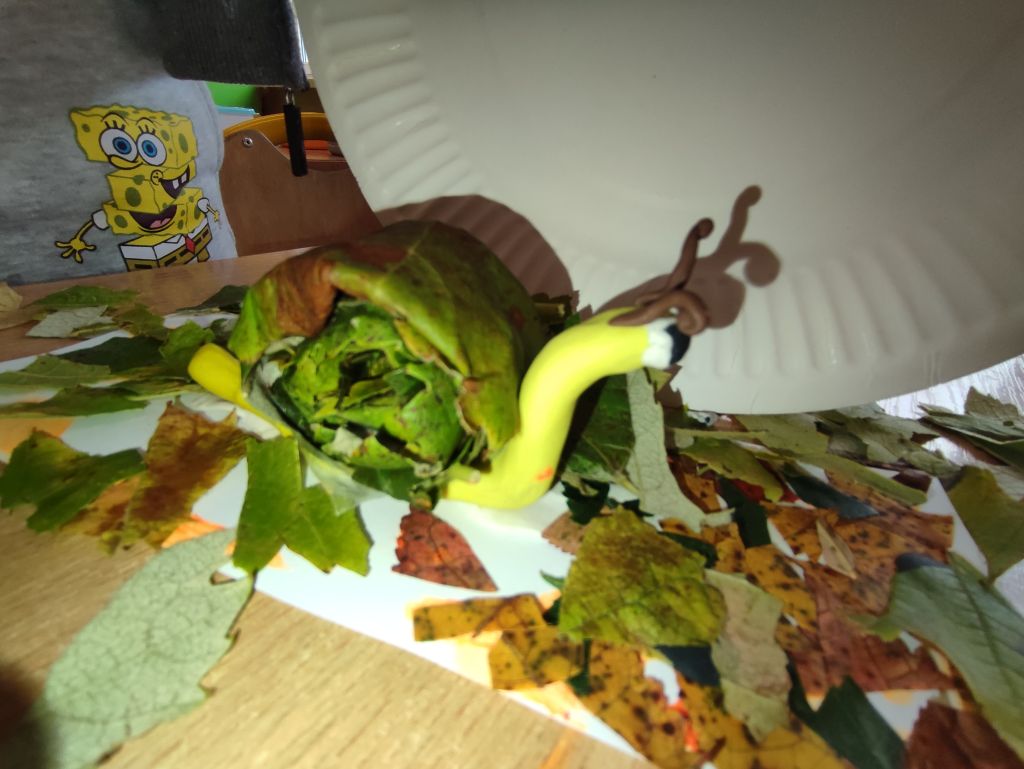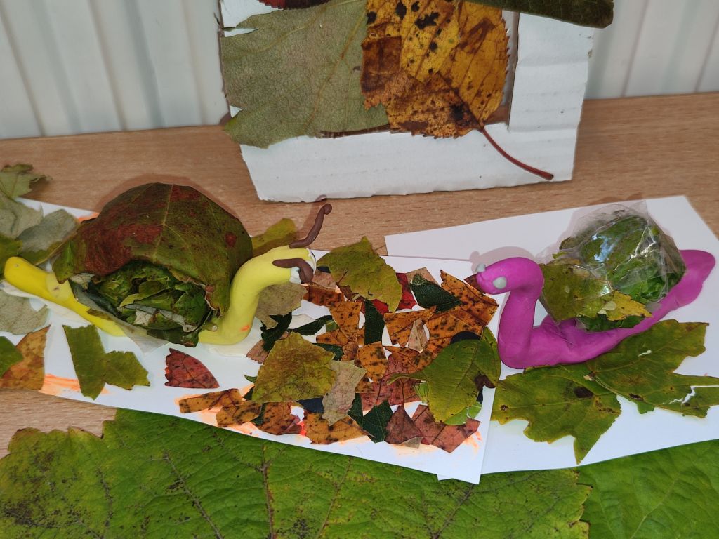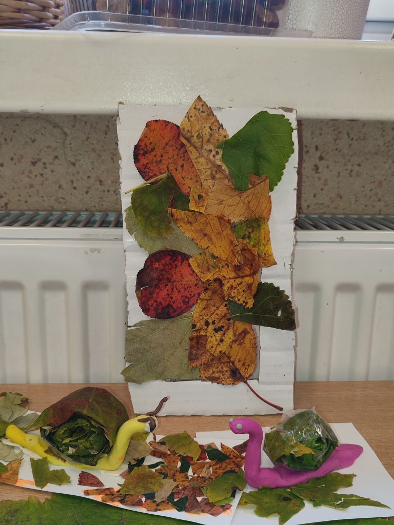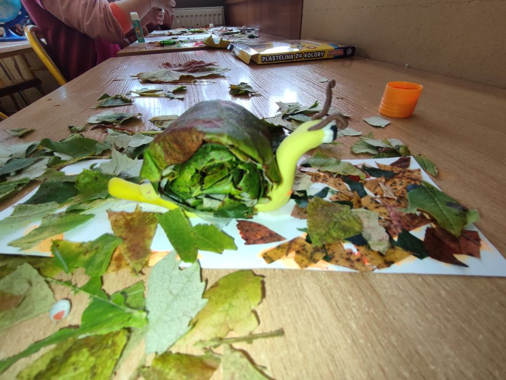 Na początku dzieci obserwowały jesienne liście, porównywały ich kształty, kolory i wielkość, uczyły się liczyć, porządkować, tworzyć zbiory i wzory. Zwykłe liście stały się punktem wyjścia do nauki i odkrywania świata. Potem wydarzyła się magia – stoły zamieniły się w warsztaty pełne barw, wycinania, klejenia i odbijania. W ruch poszły kredki, mazaki, nożyczki, kartony i plastelina. Z liści powstały ślimaki, ramki na zdjęcia, kolorowe kolaże i wspaniałe postacie „Pani Jesień moich marzeń”. Dzieci z entuzjazmem tworzyły także jesienne drzewa z tektury i odbitych dłoni – każde inne, wyjątkowe i pełne wyobraźni.