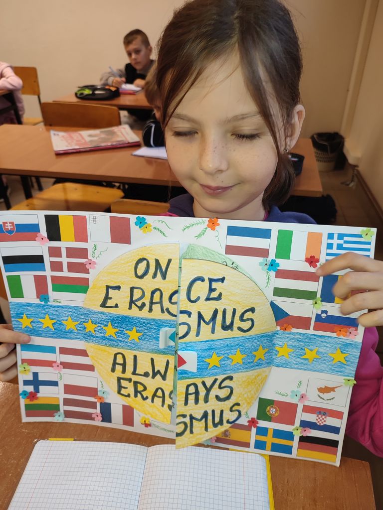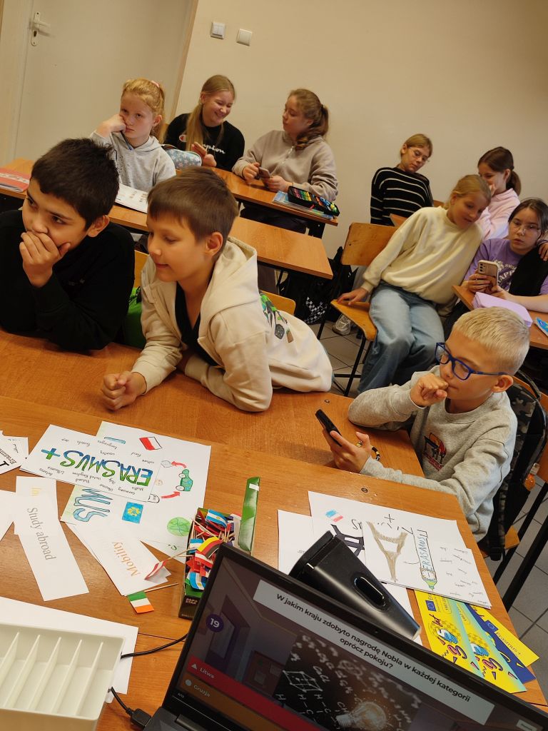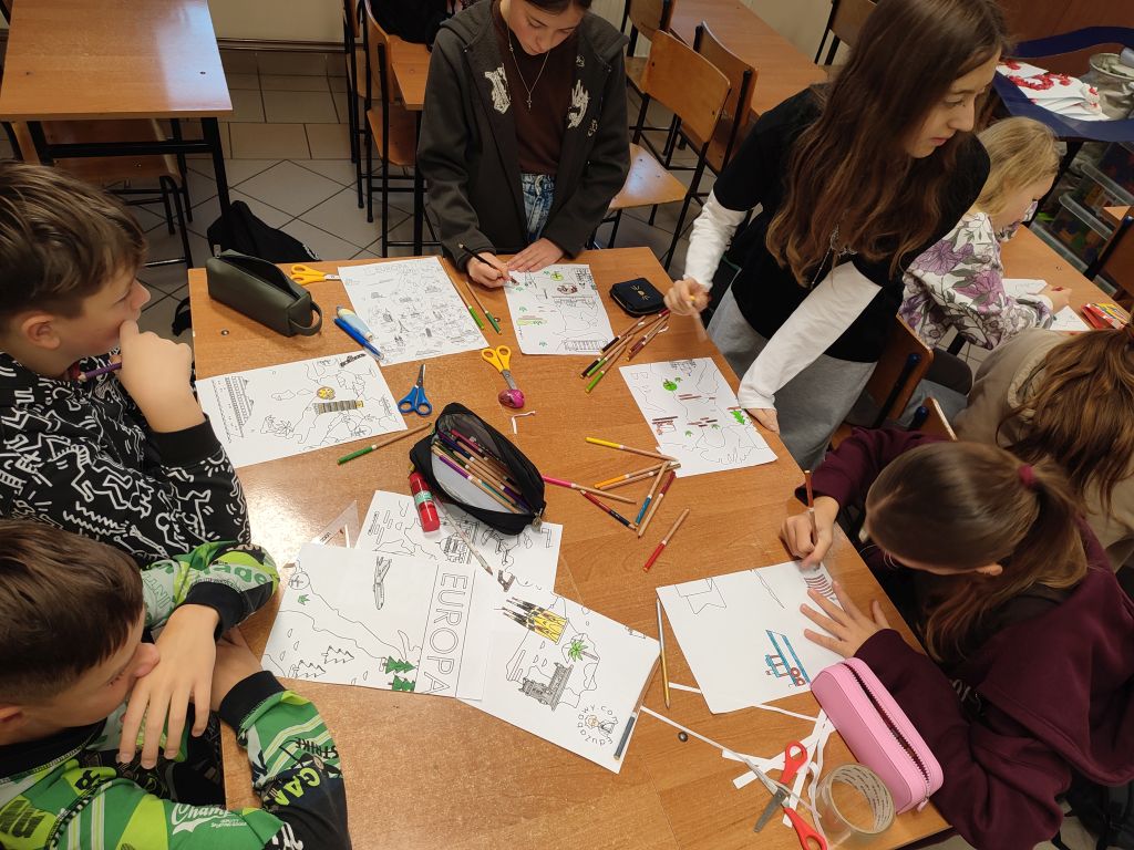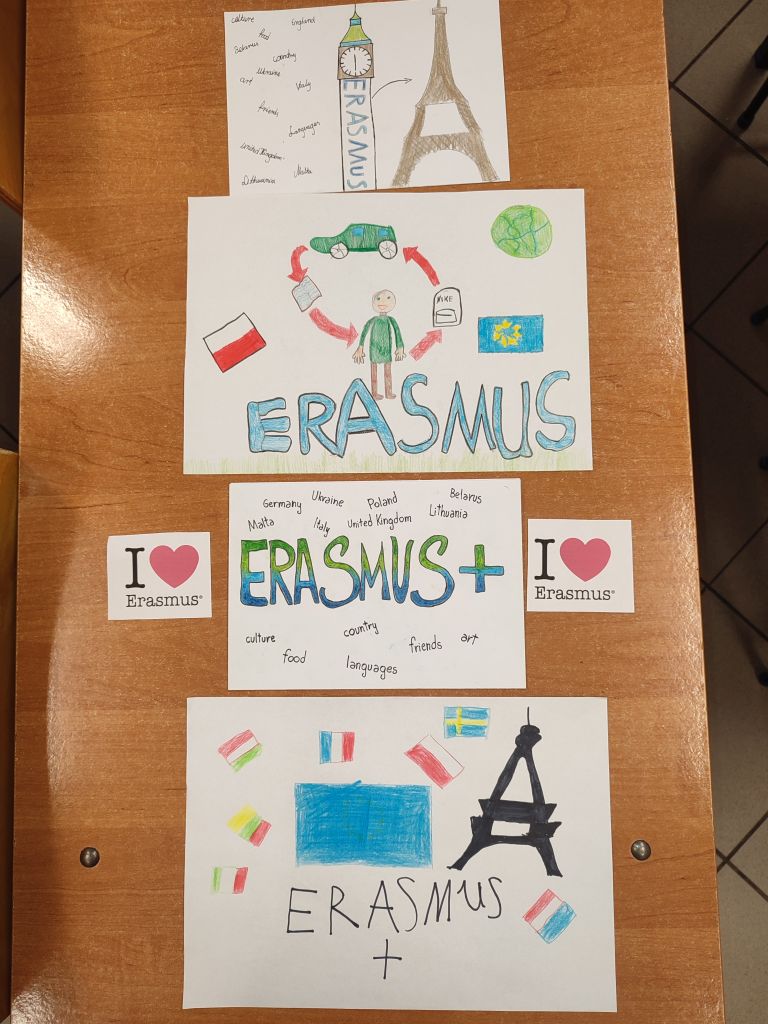 Podczas tygodnia Erasmus Days p. Katarzyna Guzior poprowadziła liczne lekcje tematyczne i warsztaty, w trakcie których uczniowie nie tylko rozwiązywali quizy i krzyżówki, tworzyli plakaty i prace plastyczne, ale także przygotowywali mini-prezentacje o krajach europejskich, opowiadali o ich kulturze, tradycjach i ciekawostkach. Młodzież brała udział w symulowanych europejskich debatach i dyskusjach, podczas których rozwijali umiejętności komunikacyjne, argumentacyjne i współpracy w grupie. Były też zajęcia typu “Erasmus w praktyce” – uczniowie projektowali własne krótkie projekty wymiany szkolnej, ucząc się planowania działań, współpracy i podejmowania decyzji. Zainteresowani programem uczniowie przygotowywali prace plastyczne i plakaty promujące różne kraje Europy – z mapami, flagami, zabytkami i ciekawostkami.