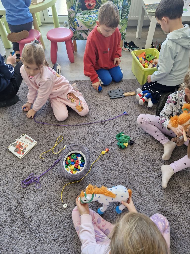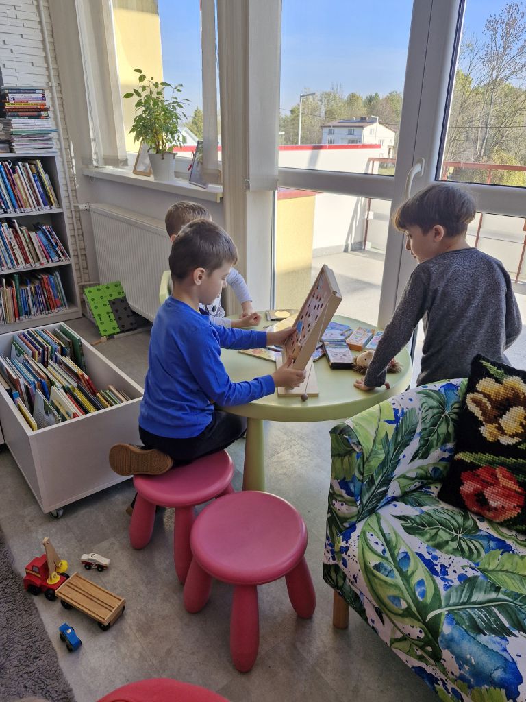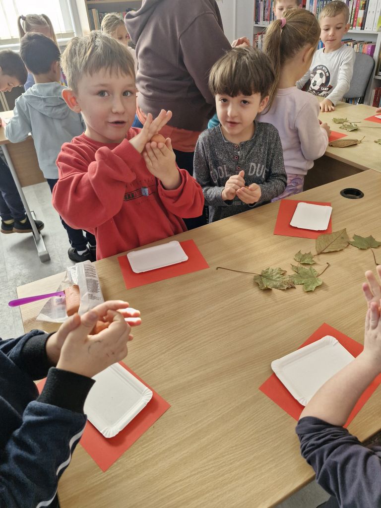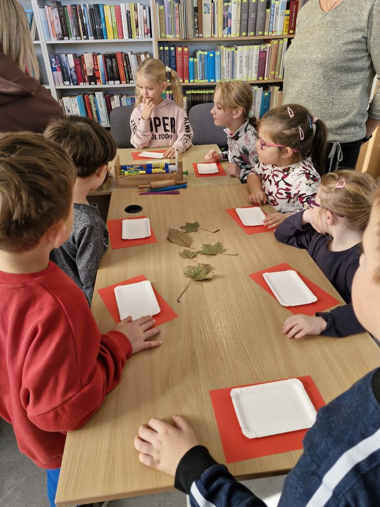 23 października dzieci z grupy „Pszczółki” wybrały się do Biblioteki Publicznej w Libuszy. Pani Ewelina przywitała wszystkich bardzo serdecznie i zaprosiła na jesienne zajęcia. Na początku przedszkolaki wysłuchały historii o zwierzętach z książki pt. ”Puszcza opowieści karpackich buków” Jolanty Richter Magnuszewskiej. Następnie uczyły się rozpoznawać tropy zwierząt na podstawie kształtu, wielkości i sposobu rozmieszczenia śladów. Uczestnicy spotkania mogli zmierzyć się z ciekawymi łamigłówkami, a na koniec wziąć udział w warsztatach odciskania faktury liści w glinie.