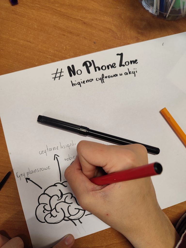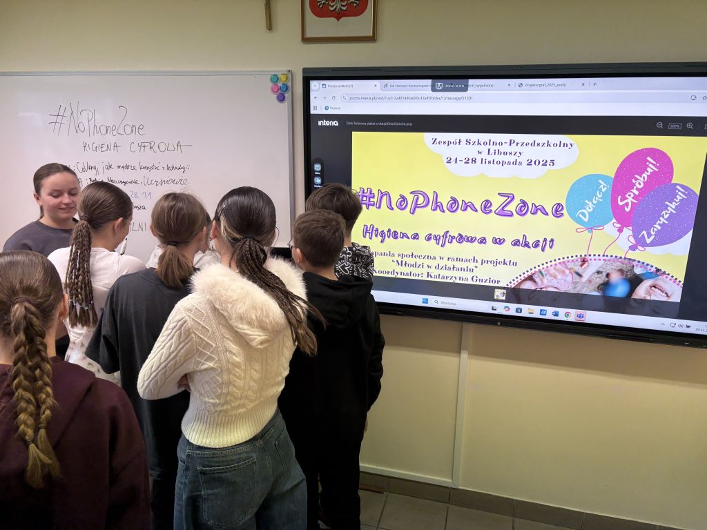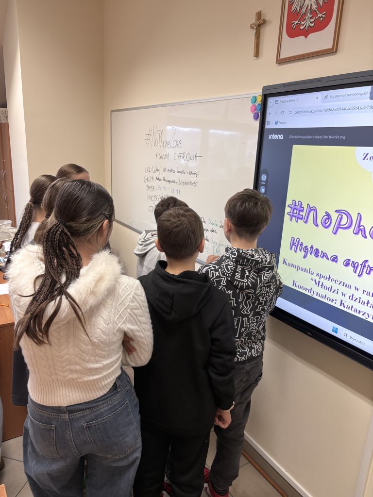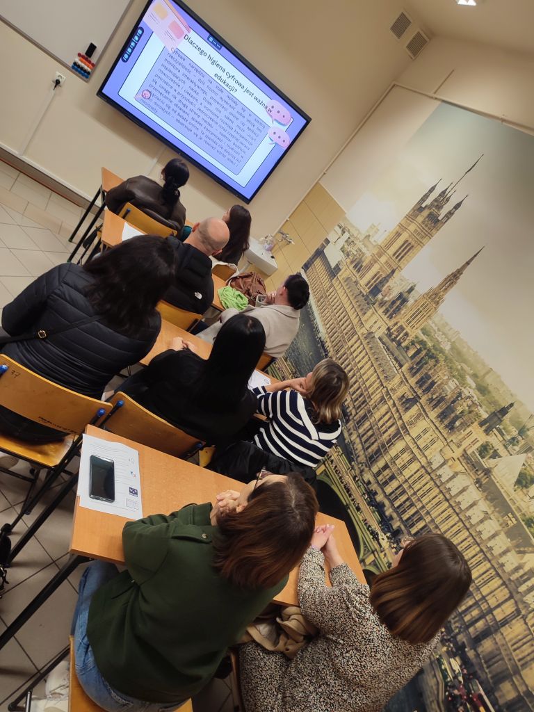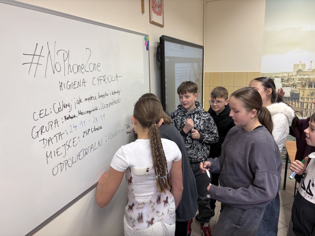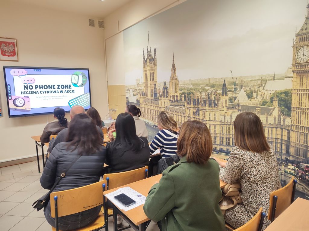Integralną częścią projektu oraz działań profilaktycznych i wychowawczych szkoły jest współpraca z rodzicami. 18 listopada odbyła się pedagogizacja rodziców – spotkanie poświęcone zagadnieniom higieny cyfrowej, cyberprzemocy oraz zagrożeń wynikających z niewłaściwego korzystania z telefonów i sieci. Tematyka ta jest wyjątkowo aktualna, ponieważ dotyka problemów, z którymi coraz częściej mierzą się dzieci, młodzież i rodzice. Podczas spotkania rodzice aktywnie włączyli się w rozmowę, dzielili się refleksjami, analizowali przykłady i pracowali z mini-poradnikiem przygotowanym specjalnie na tę okazję. Wspólnie zastanawiali się nad strategiami wspierania dzieci w bezpiecznym, mądrym i zrównoważonym korzystaniu z nowych technologii. Prowadząca spotkanie, pani Katarzyna Guzior, przedstawiła liczne praktyczne wskazówki dotyczące budowania zdrowych relacji, zachowania równowagi cyfrowej oraz towarzyszenia dzieciom w świecie pełnym dynamicznych bodźców.
