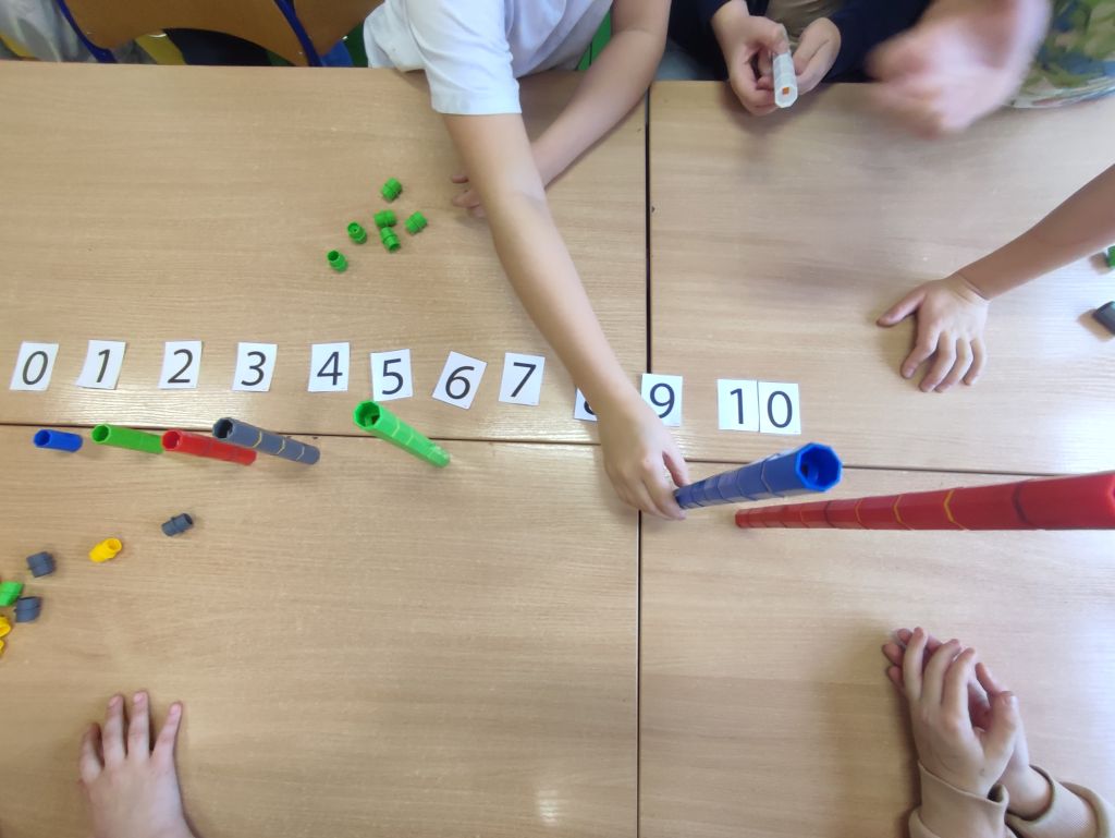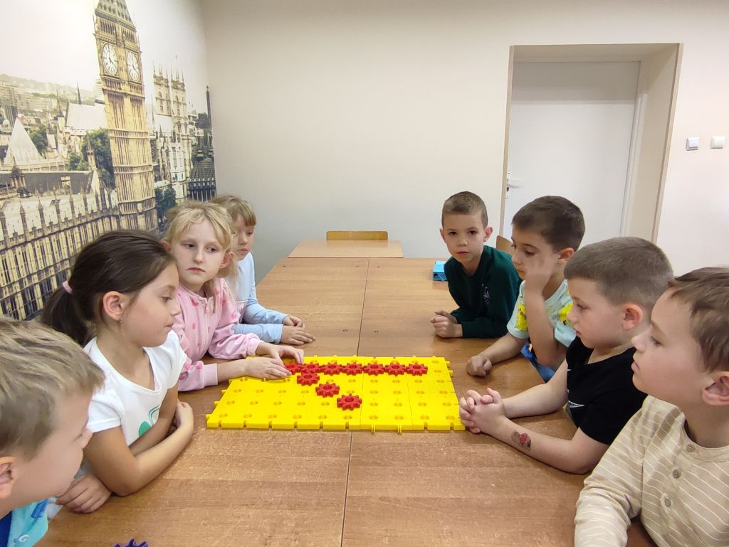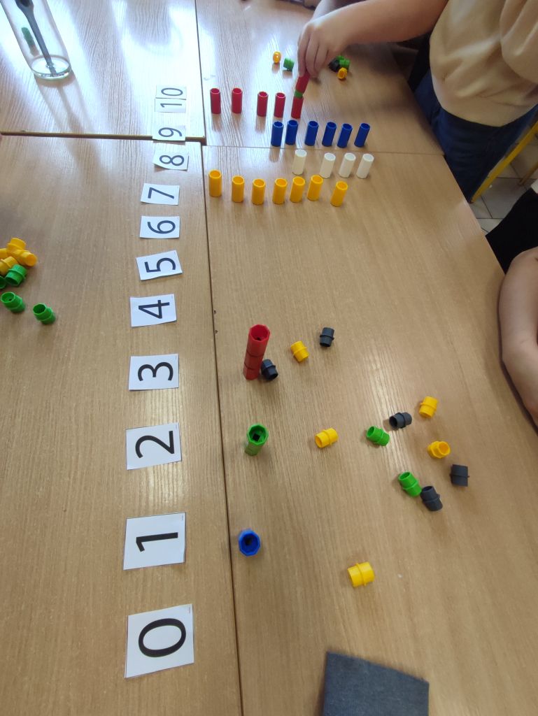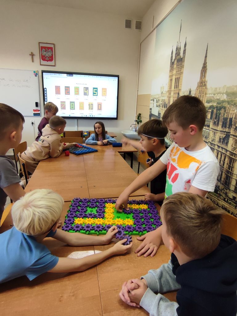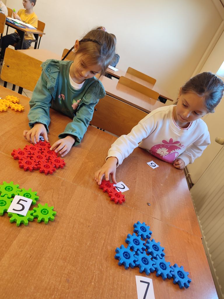 Uczniowie Zespołu Szkolno-Przedszkolnego w Libuszy po raz kolejny udowodnili, że matematyka może być prawdziwą przygodą. Pod kierunkiem pani Katarzyny Guzior pierwszoklasiści biorą udział w innowacyjnych zajęciach „Kolorowa matematyka z Korbo i językiem angielskim”, które w pełni łączyły edukację matematyczną, językową oraz twórczą pracę w duchu STEAM. Kolorowe klocki Korbo stały się głównym narzędziem odkrywania, pozwalając dzieciom liczyć, budować, eksperymentować i uczyć się w praktyce. Podczas zajęć uczniowie opanowali cyfry od jeden do dziesięciu w języku angielskim – one, two, three, four, five, six, seven, eight, nine, ten – a także podstawowe kolory: red, blue, yellow, green, orange, black, white…. Dzieci aktywnie posługują się językiem angielskim w codziennych sytuacjach, ucząc się pytać o klocki, prosić o nie, zliczać je i określać, ile mają oraz ile im brakuje. Równocześnie poznają pojęcia przestrzenne, określając położenie elementów w przestrzeni, korzystając z takich słów jak up, down, left, right, in front of, behind czy next to, oraz ćwicząc porównania i cechy przedmiotów, np. tall, short, long, big, small. Dzięki takim praktycznym zadaniom uczniowie utrwalają liczenie elementów, porównują liczebność zbiorów, układają figury geometryczne z osi, kół i trybików, a następnie tworzą z nich obrazki, konstrukcje odpowiadające realnym przedmiotom oraz prace plastyczne, takie jak domki, pojazdy czy inne kreatywne formy, rozwijając jednocześnie wyobraźnię artystyczną. Tworzą również figury geometryczne całym ciałem, aby potem odwzorować je z klocków Korbo, porównując kształt, wielkość i orientację.