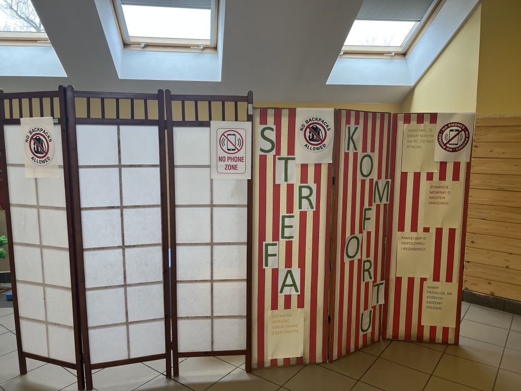 W efekcie listopadowych rozmów powstała Strefa Komfortu – wyjątkowe miejsce na II piętrze szkoły, zaprojektowane przez klasy biorące udział w programie. To przestrzeń, która ma służyć wyciszeniu, odpoczynkowi i spokojnym rozmowom.