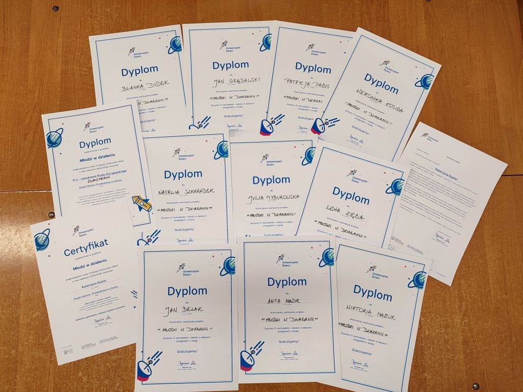 Wszystkie działania projektowe były na bieżąco dokumentowane i skrupulatnie raportowane do Fundacji Uniwersytet Dzieci w Klasie. Po zakończeniu realizacji potwierdzono, że projekt został przeprowadzony z pełnym sukcesem. Uczniowie otrzymali imienne certyfikaty potwierdzające ich zaangażowanie i aktywny udział, szkoła oraz koordynator projektu zostali uhonorowani certyfikatami realizacji, a na ręce dyrekcji wpłynął list gratulacyjny z informacją o wzorowym wywiązaniu się ze wszystkich zobowiązań projektowych.