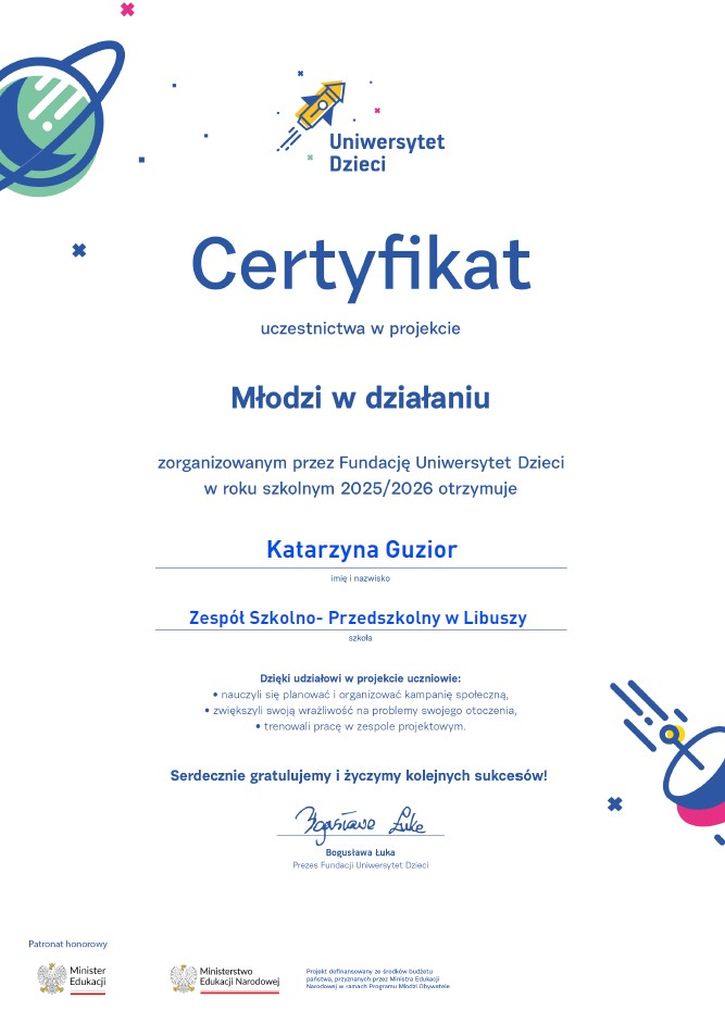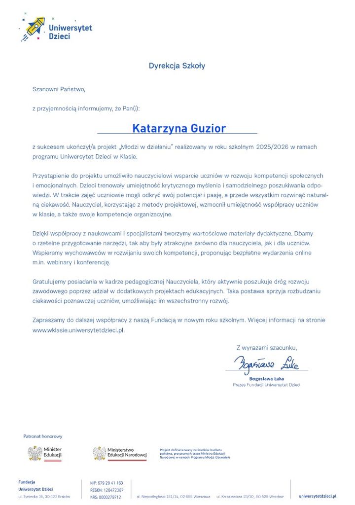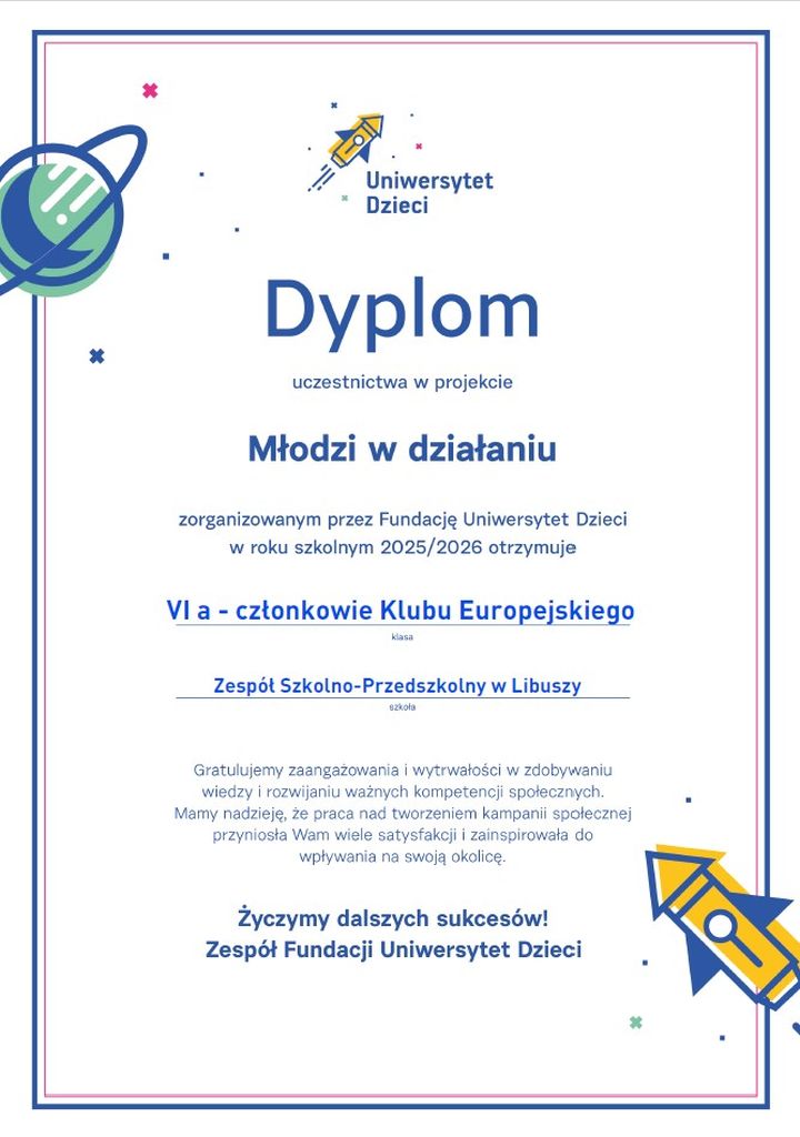 Po kilku miesiącach intensywnej, systematycznej zakończyła się realizacja projektu „Młodzi w działaniu”, prowadzonego we współpracy z Fundacją Uniwersytet Dzieci w Klasie, pod patronatem Ministerstwa Edukacji Narodowej, w ramach Programu Młodzi Obywatele, finansowanego ze środków budżetu państwa. Projekt skierowany był do uczniów klasy VIa i stanowił odpowiedź na aktualne kierunki polityki oświatowej, kładące nacisk na kształtowanie kompetencji obywatelskich, społecznych, krytycznego myślenia oraz umiejętności współpracy i odpowiedzialnego działania. W realizację projektu zaangażowani byli uczniowie należący do Szkolnego Klubu Europejskiego EuroTeam, co dodatkowo wzmocniło europejski i obywatelski wymiar podejmowanych inicjatyw. Działania prowadzone były pod opieką pani Katarzyny Guzior, która czuwała nad przebiegiem projektu, wspierała uczniów merytorycznie i organizacyjnie, dokumentowała działania oraz koordynowała realizację zaplanowanych przedsięwzięć.