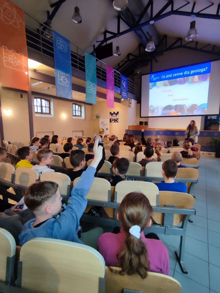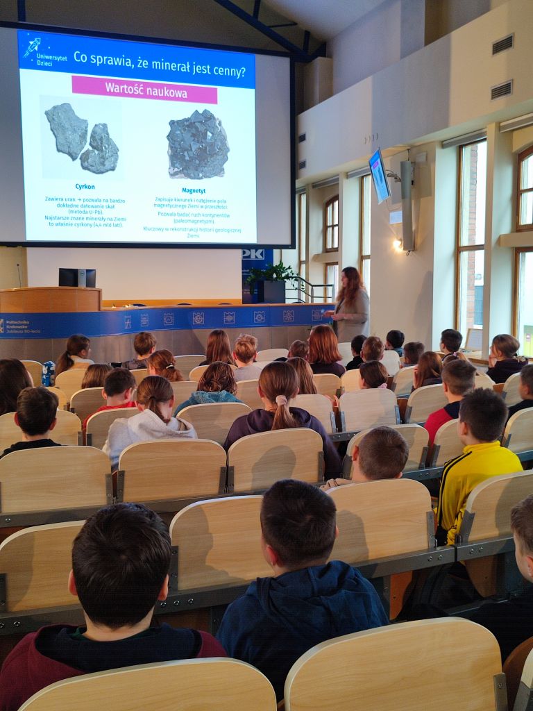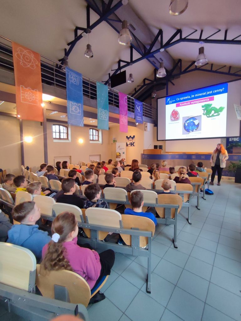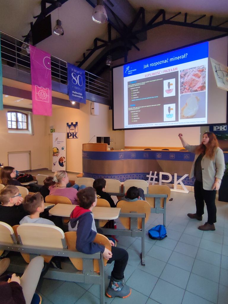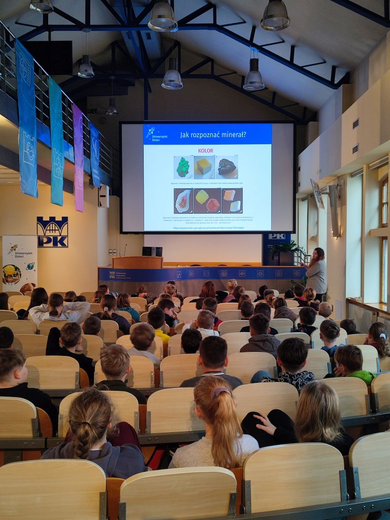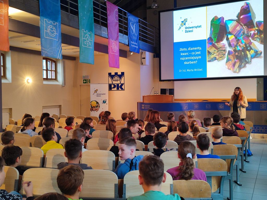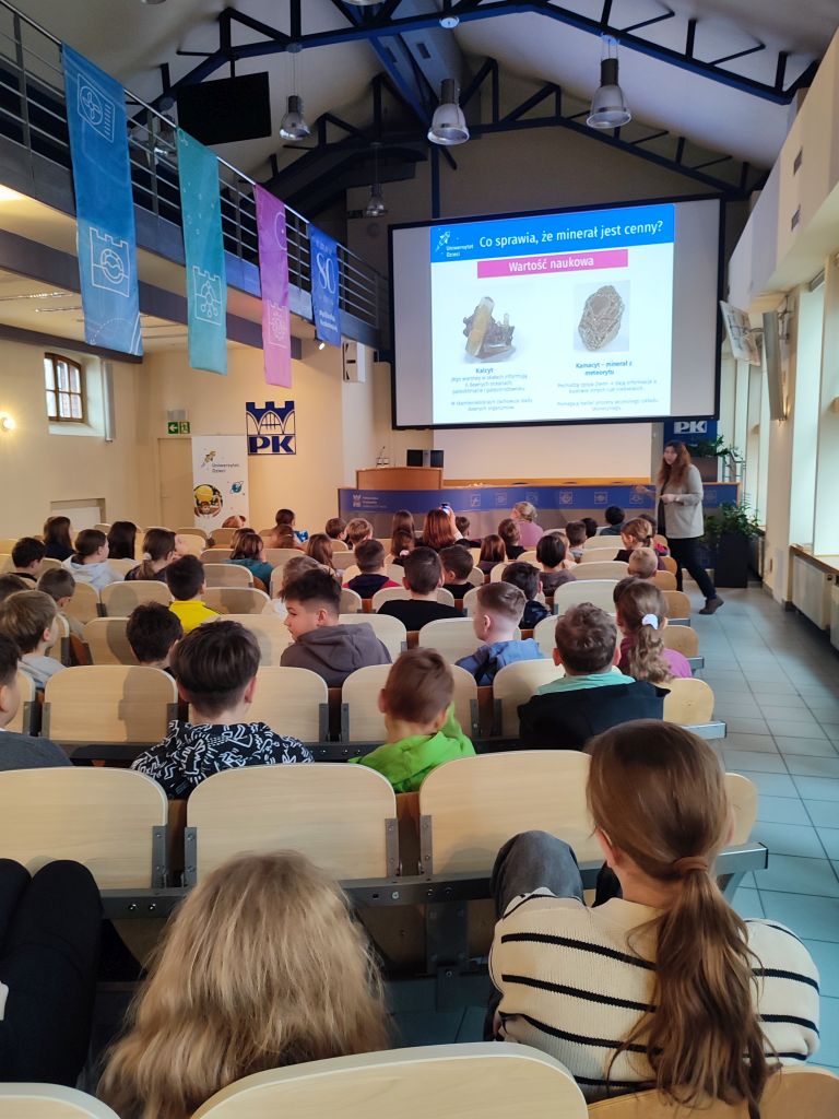 Pobyt na Politechnice Krakowskiej został włączony w realizację projektu „Młodzi w działaniu”, którego celem jest kształtowanie postaw obywatelskich, rozwijanie ciekawości poznawczej oraz budowanie świadomości, że nauka i wiedza są fundamentem odpowiedzialnego uczestnictwa w życiu społecznym. Uczniowie uczestniczyli w wykładzie prowadzonym przez dr inż. Martę Wróbel, zatytułowanym „Złoto, diamenty, kwarc – co jest najcenniejszym skarbem?”. Już sama obecność na uczelni technicznej, możliwość wejścia do auli i bezpośredni kontakt z naukowcem pozwoliły dzieciom poczuć atmosferę świata akademickiego i wcielić się w rolę młodych studentów.