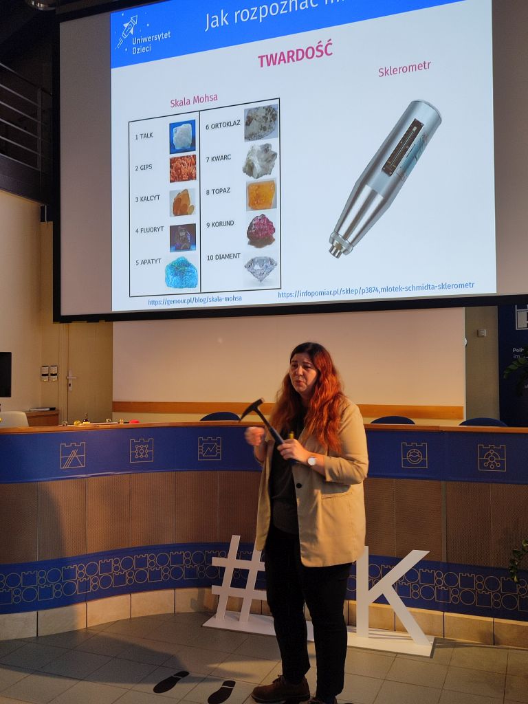 Podczas wykładu uczniowie poznali podstawowe pojęcia z zakresu nauk o Ziemi, dowiedzieli się, czym różni się skała od minerału, jak rozpoznać prawdziwe złoto oraz dlaczego zwykły kwarc bywa cenniejszy niż diament. Prowadząca w przystępny sposób wyjaśniła, jakie cechy decydują o identyfikacji minerałów – kolor, połysk, twardość czy łupliwość – i zachęcała uczniów do refleksji nad tym, co naprawdę stanowi o wartości: wygląd, rzadkość czy wiedza. Wykład nie tylko poszerzył wiedzę uczniów, ale także rozwijał umiejętność zadawania pytań, logicznego myślenia i wyciągania wniosków, co doskonale wpisuje się w cele projektu „Młodzi w działaniu”.