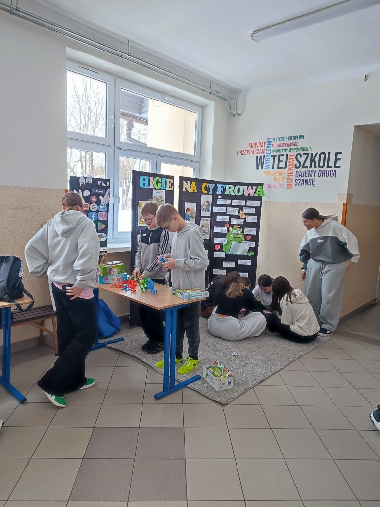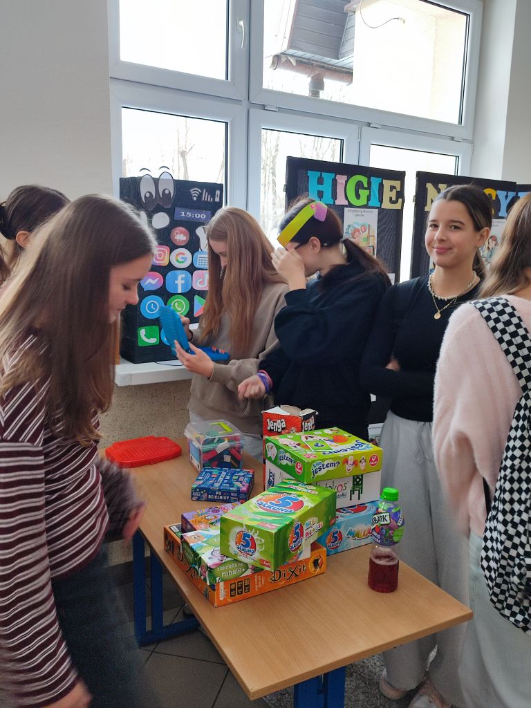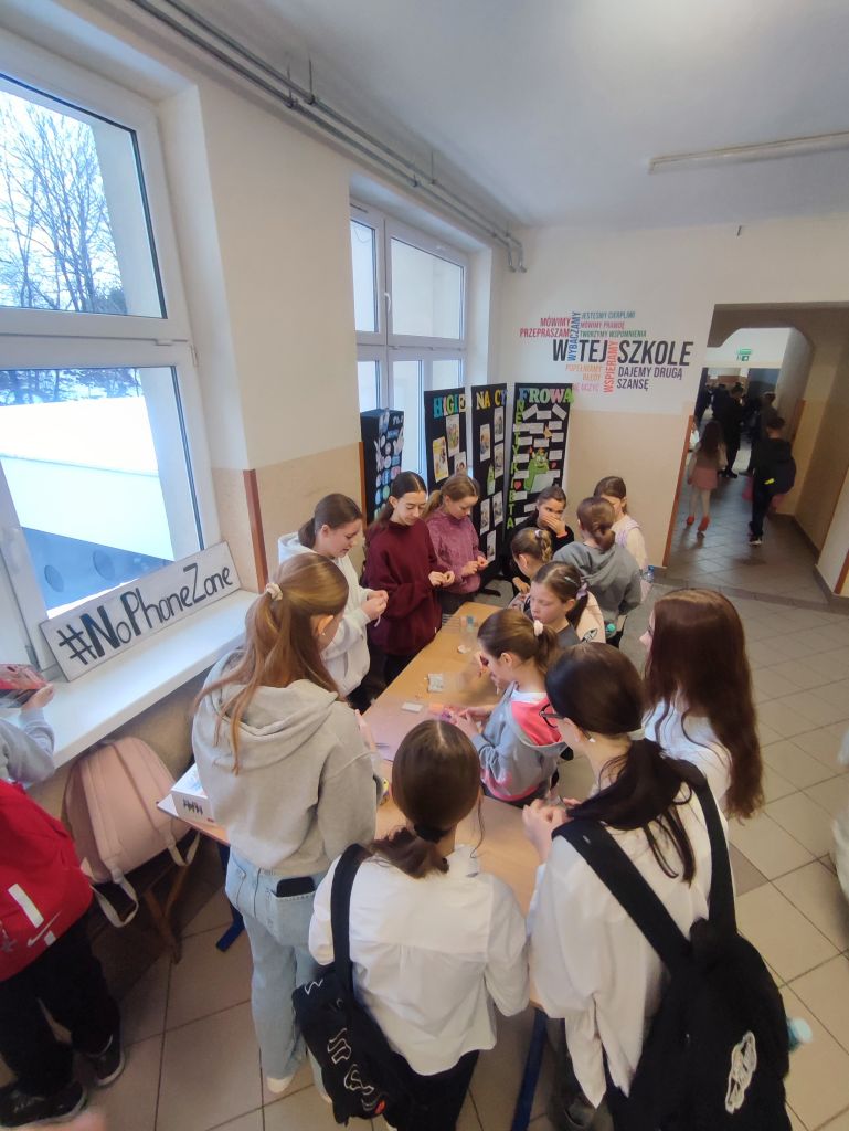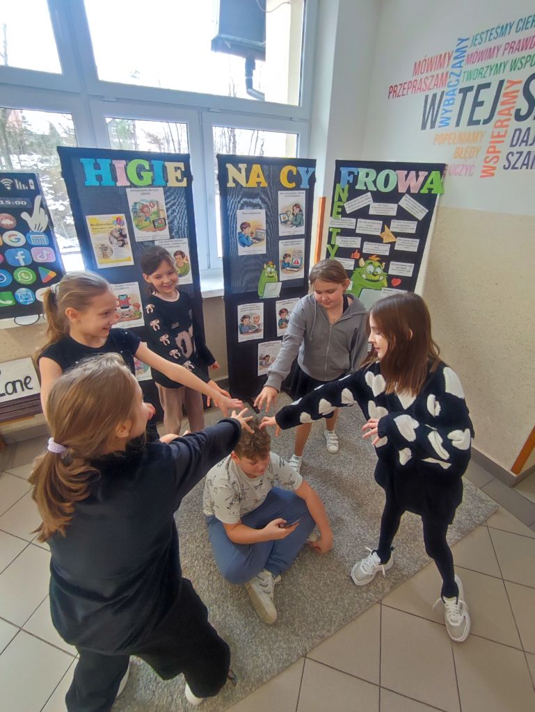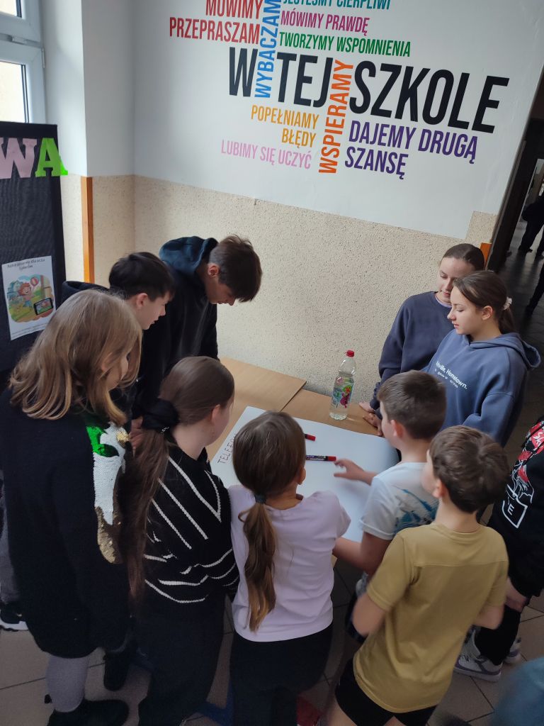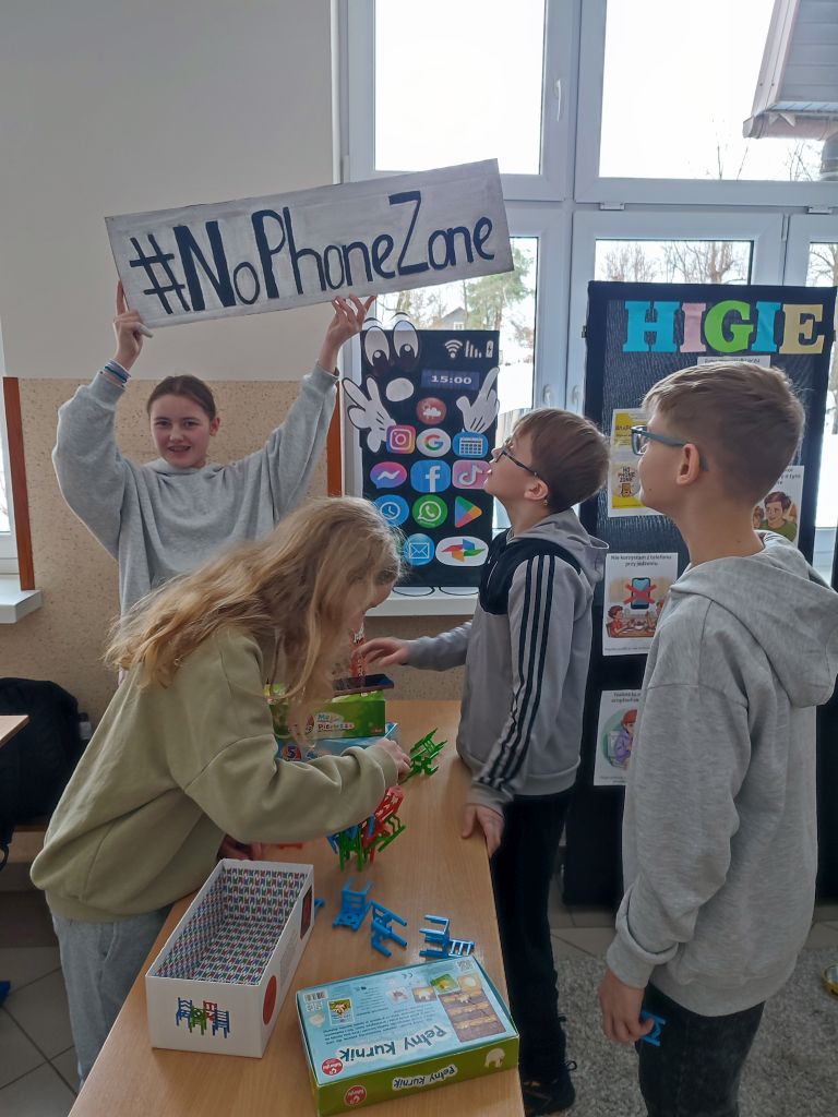 W ramach kampanii uczniowie przygotowali także piosenkę oraz krótkie scenki, zawierające mądre przesłanie – że liczy się chwila, relacje i drugi człowiek, który jest obok nas. Odbyło się również spotkanie z policjantem, dotyczące cyberbezpieczeństwa i zagrożeń wynikających z korzystania z telefonów, oraz spotkanie ze szkolną pielęgniarką, która omówiła wpływ telefonu na zdrowie. Najmłodsi uczniowie i członkowie szkolnej świetlicy zaangażowali się w grę Eliksir Przyjaźni. Celem gry było wzmacnianie relacji rówieśniczych oraz nauka współpracy i wzajemnej życzliwości wśród najmłodszych uczniów. Gra pomogła dzieciom rozwijać umiejętności komunikacyjne, empatię oraz pokazała, jak ważna jest rozmowa i wspólne spędzanie czasu bez telefonu. Dzięki udziałowi w zabawie najmłodsi uczniowie doświadczyli radości bycia razem, poczucia przynależności i budowania pozytywnych relacji w szkolnej społeczności. W klasach starszych wychowawcy przeprowadzili godziny wychowawcze poświęcone tematyce higieny cyfrowej i bezpieczeństwa w sieci.
