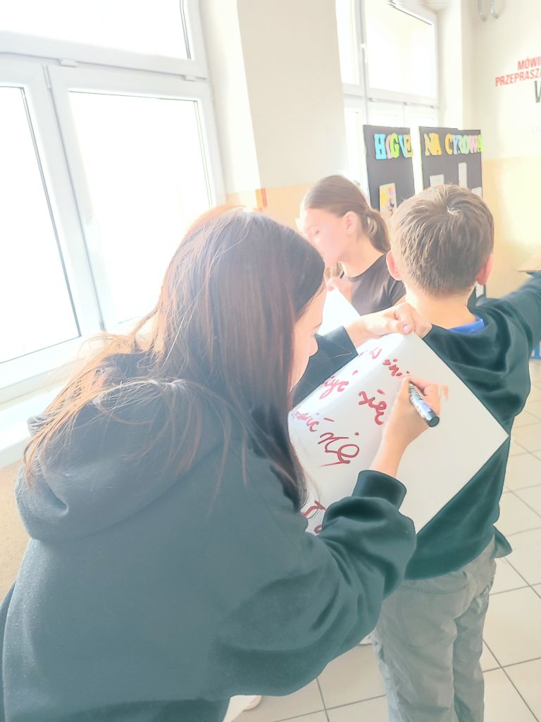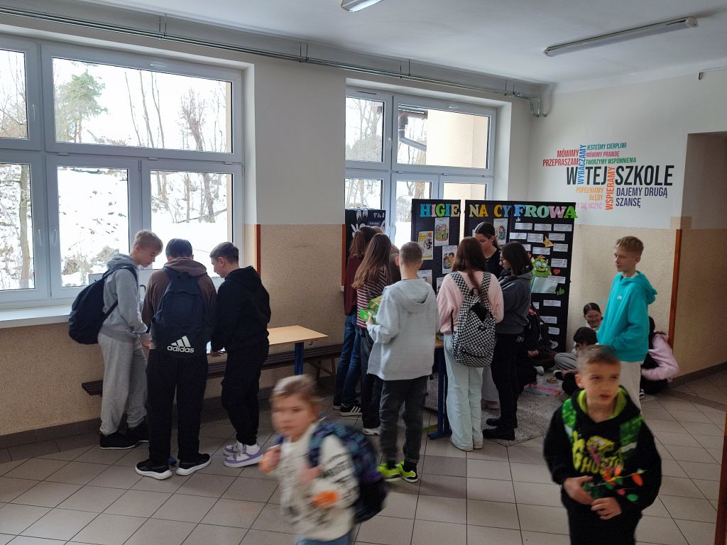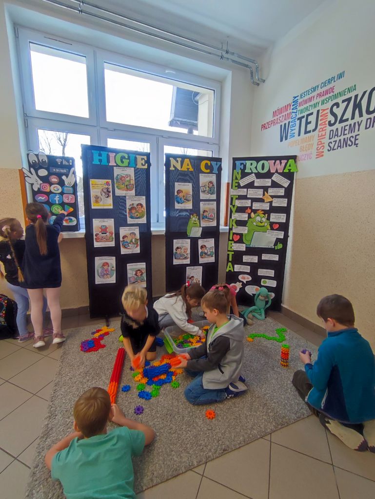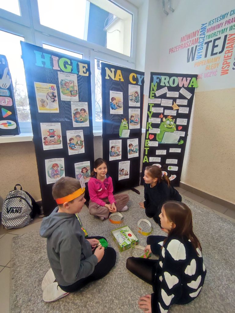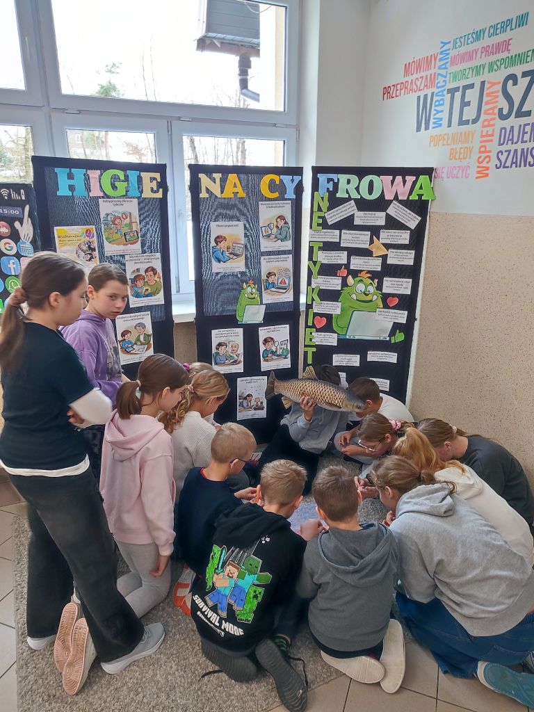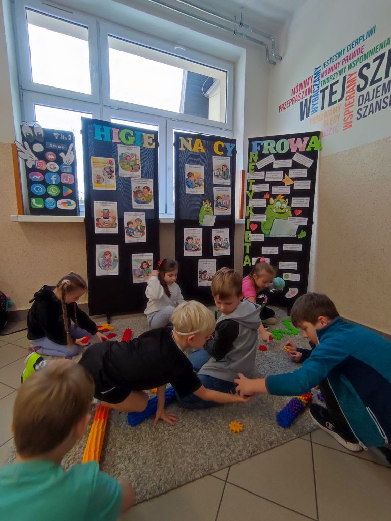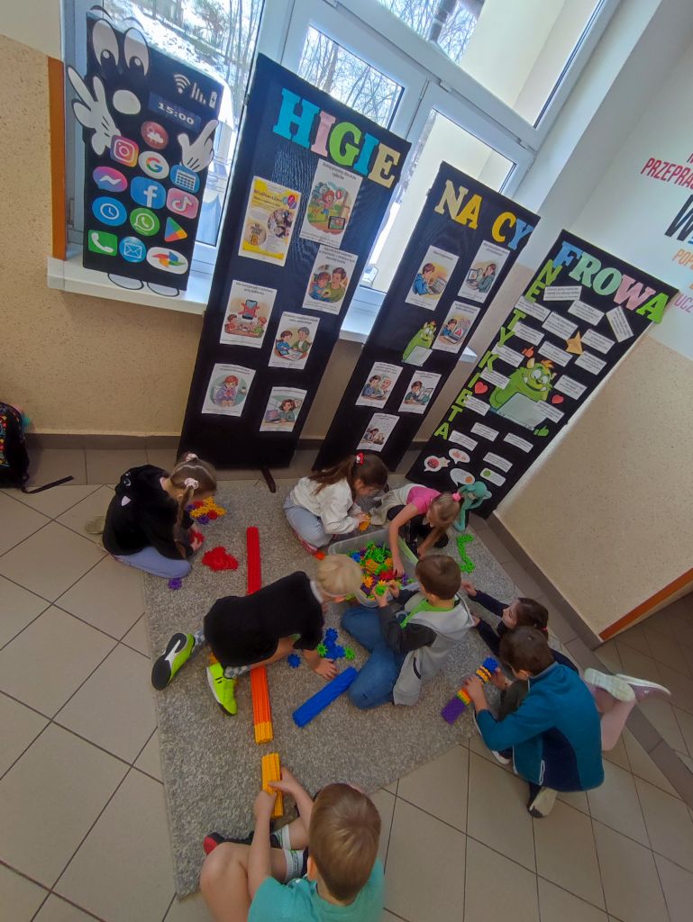 W ramach kampanii uczniowie przygotowali także piosenkę oraz krótkie scenki, zawierające mądre przesłanie – że liczy się chwila, relacje i drugi człowiek, który jest obok nas. Odbyło się również spotkanie z policjantem, dotyczące cyberbezpieczeństwa i zagrożeń wynikających z korzystania z telefonów, oraz spotkanie ze szkolną pielęgniarką, która omówiła wpływ telefonu na zdrowie. Najmłodsi uczniowie i członkowie szkolnej świetlicy zaangażowali się w grę Eliksir Przyjaźni. Celem gry było wzmacnianie relacji rówieśniczych oraz nauka współpracy i wzajemnej życzliwości wśród najmłodszych uczniów. Gra pomogła dzieciom rozwijać umiejętności komunikacyjne, empatię oraz pokazała, jak ważna jest rozmowa i wspólne spędzanie czasu bez telefonu. Dzięki udziałowi w zabawie najmłodsi uczniowie doświadczyli radości bycia razem, poczucia przynależności i budowania pozytywnych relacji w szkolnej społeczności. W klasach starszych wychowawcy przeprowadzili godziny wychowawcze poświęcone tematyce higieny cyfrowej i bezpieczeństwa w sieci.