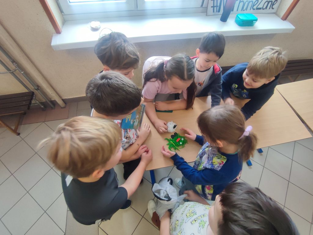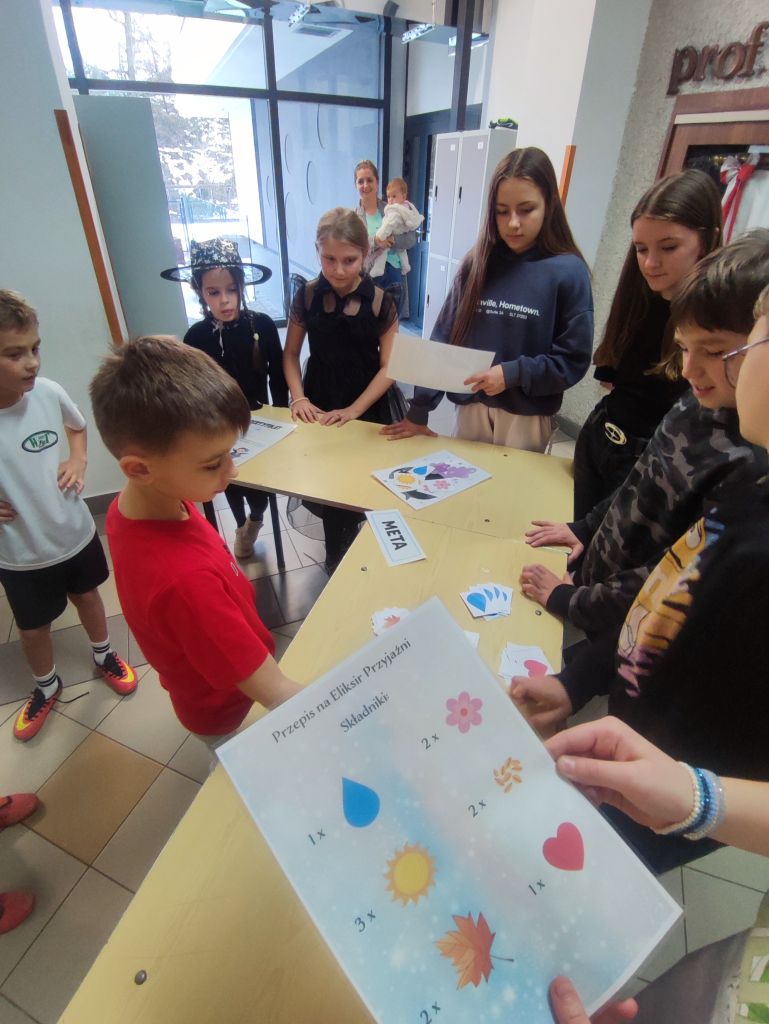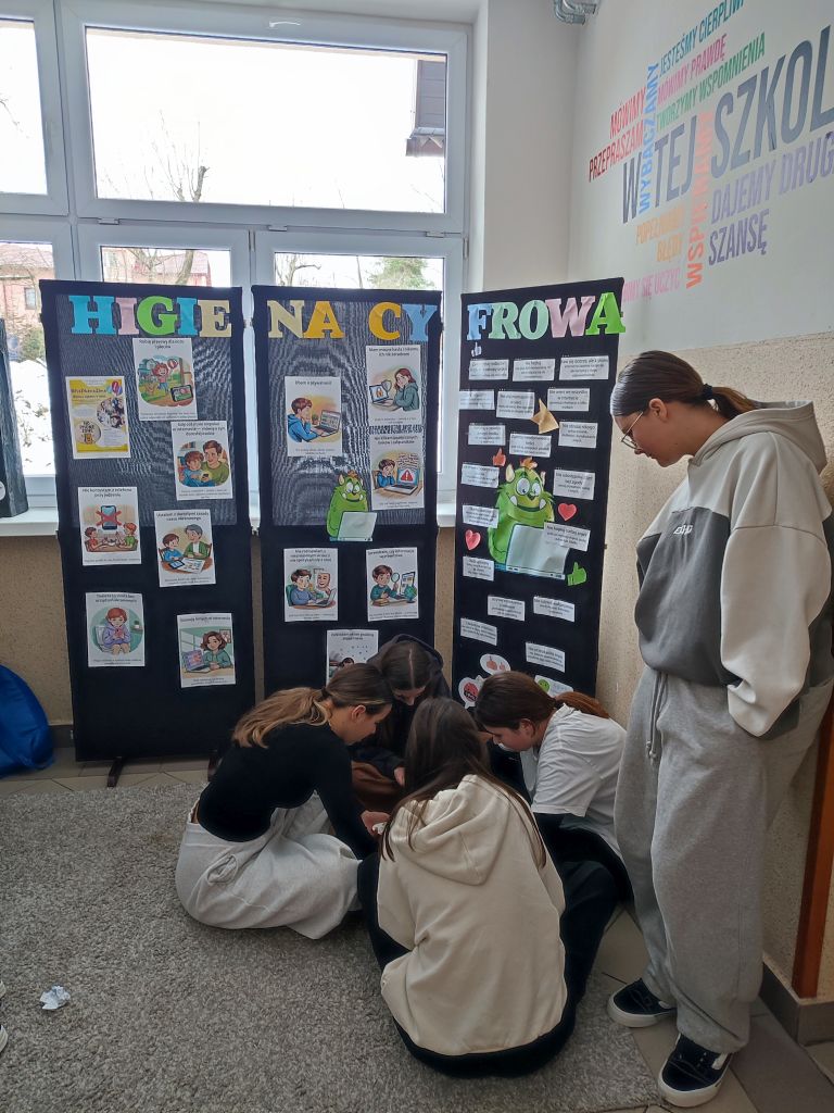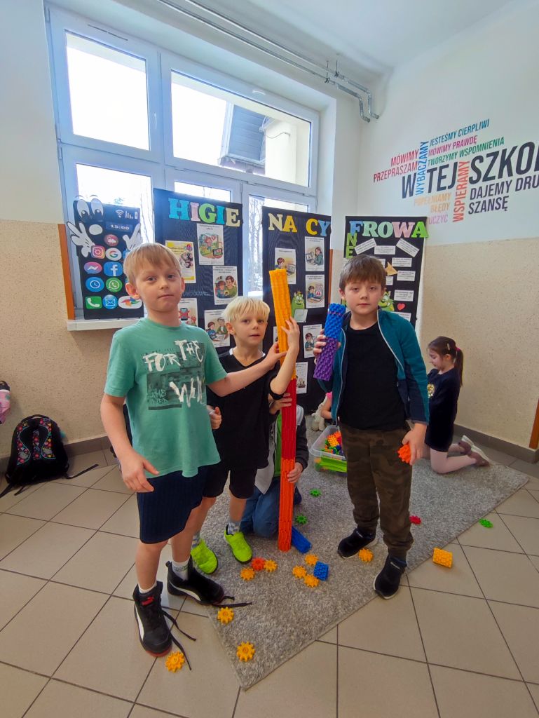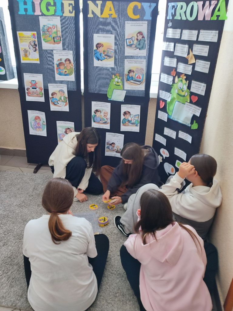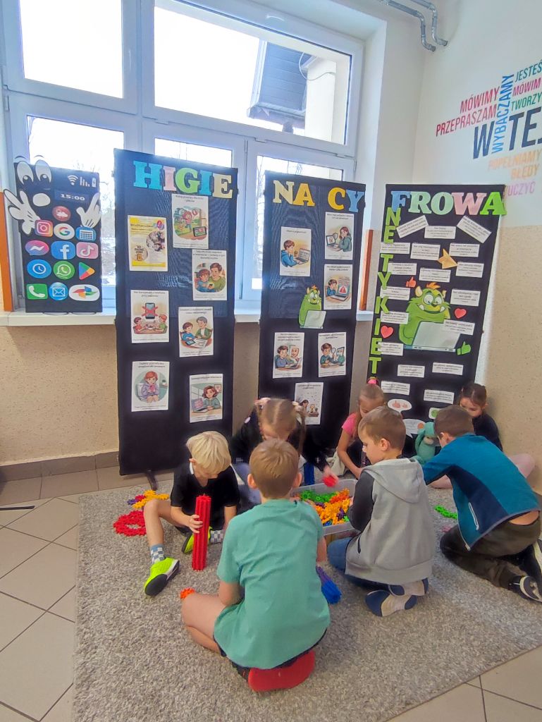 W ramach kampanii uczniowie przygotowali także piosenkę oraz krótkie scenki, zawierające mądre przesłanie – że liczy się chwila, relacje i drugi człowiek, który jest obok nas. Odbyło się również spotkanie z policjantem, dotyczące cyberbezpieczeństwa i zagrożeń wynikających z korzystania z telefonów, oraz spotkanie ze szkolną pielęgniarką, która omówiła wpływ telefonu na zdrowie. Najmłodsi uczniowie i członkowie szkolnej świetlicy zaangażowali się w grę Eliksir Przyjaźni. Celem gry było wzmacnianie relacji rówieśniczych oraz nauka współpracy i wzajemnej życzliwości wśród najmłodszych uczniów. Gra pomogła dzieciom rozwijać umiejętności komunikacyjne, empatię oraz pokazała, jak ważna jest rozmowa i wspólne spędzanie czasu bez telefonu. Dzięki udziałowi w zabawie najmłodsi uczniowie doświadczyli radości bycia razem, poczucia przynależności i budowania pozytywnych relacji w szkolnej społeczności. W klasach starszych wychowawcy przeprowadzili godziny wychowawcze poświęcone tematyce higieny cyfrowej i bezpieczeństwa w sieci.