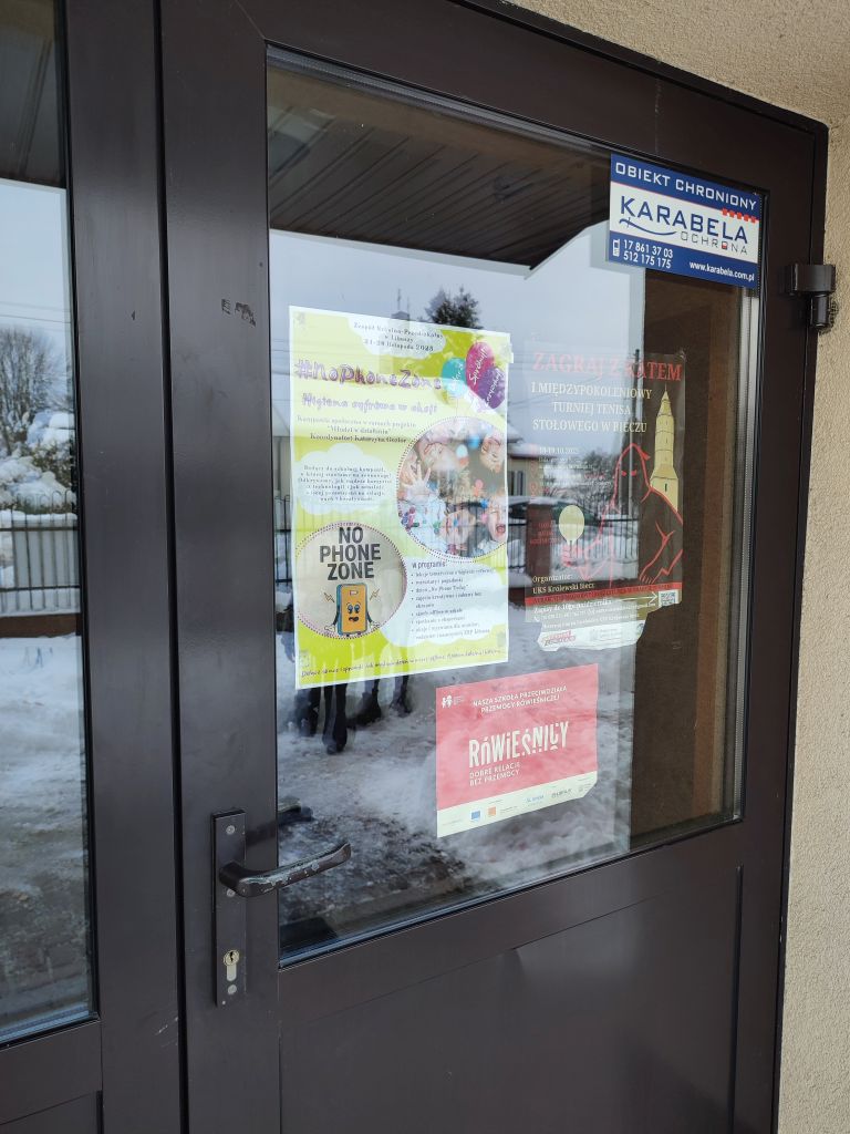 Aby upowszechniać działania kampanii, wspólnie opracowaliśmy plakat informacyjny, zawierający najważniejsze treści i hasła #NoPhoneZone. Plakat został zamieszczony na stronie internetowej szkoły, na szkolnym Facebooku oraz pojawił się na korytarzach i drzwiach klasowych, stając się widocznym symbolem kampanii.