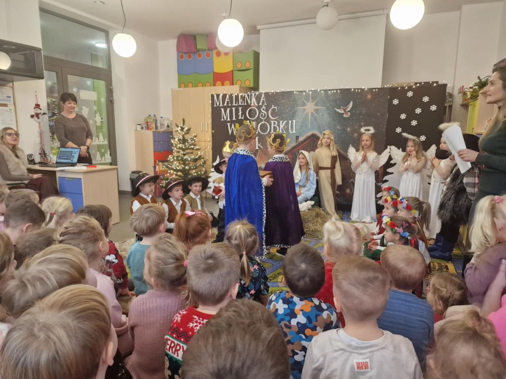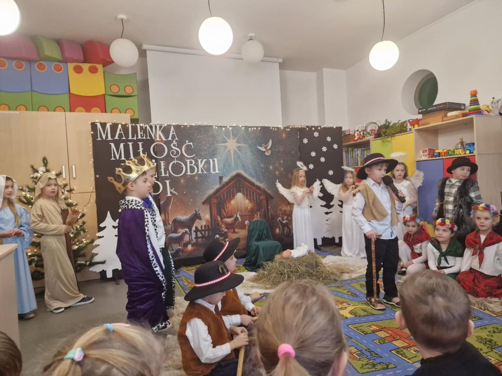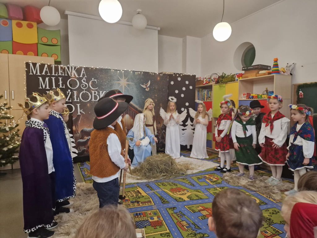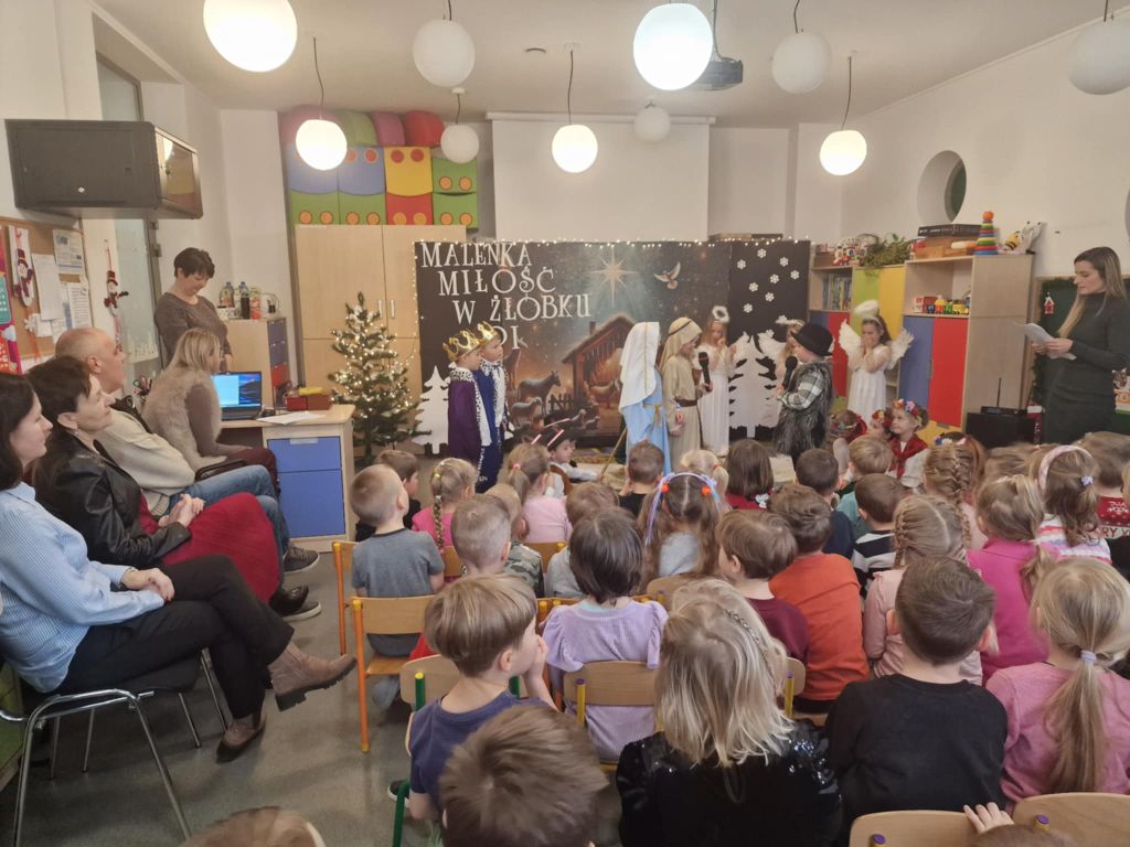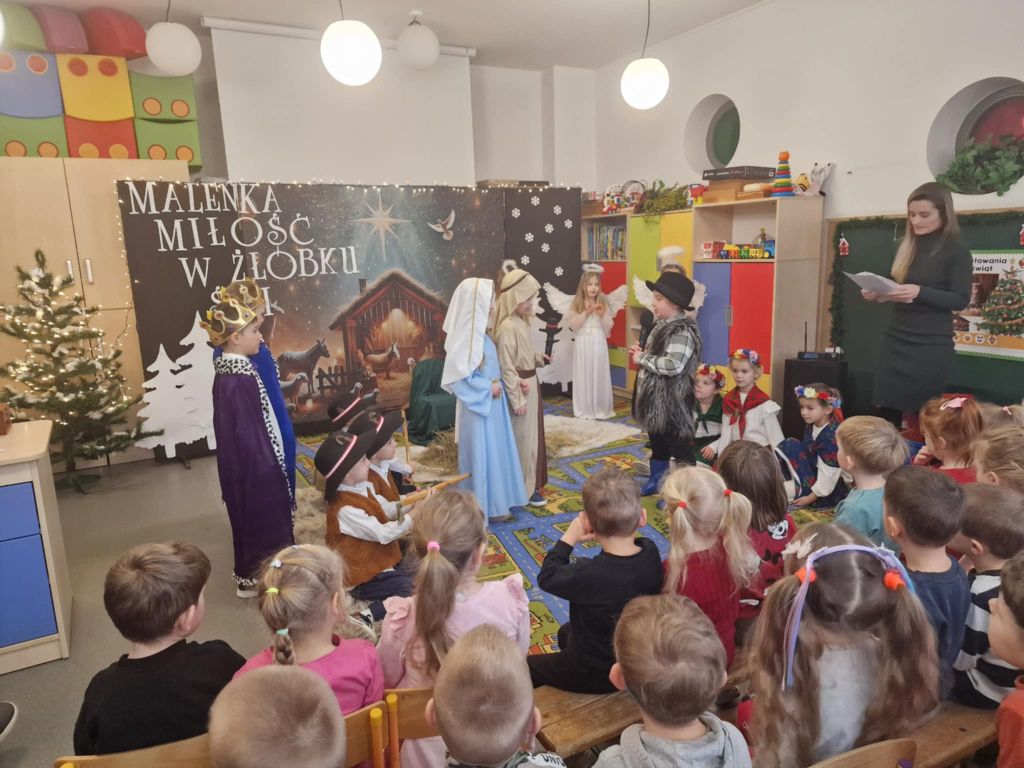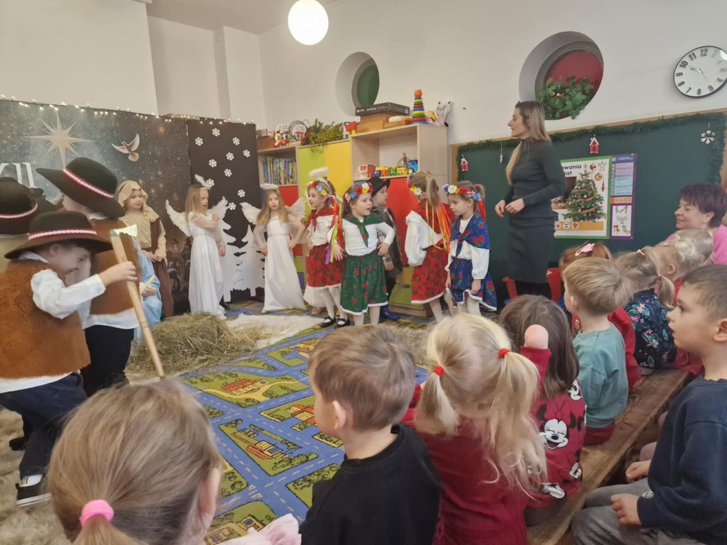 w wykonaniu dzieci z grupy „Pszczółki”. Mali artyści z dużym zaangażowaniem i powagą wcielili się w swoje role, wprowadzając gości w wyjątkowy, świąteczny nastrój. Przedstawienie było krótkim przypomnieniem historii Bożego Narodzenia, przeplatane kolędami i wesołymi pastorałkami. Dzieciom dziękujemy za wspaniały występ a zaproszonym gościom za obecność i wspólne przeżywanie tej wyjątkowej chwili.