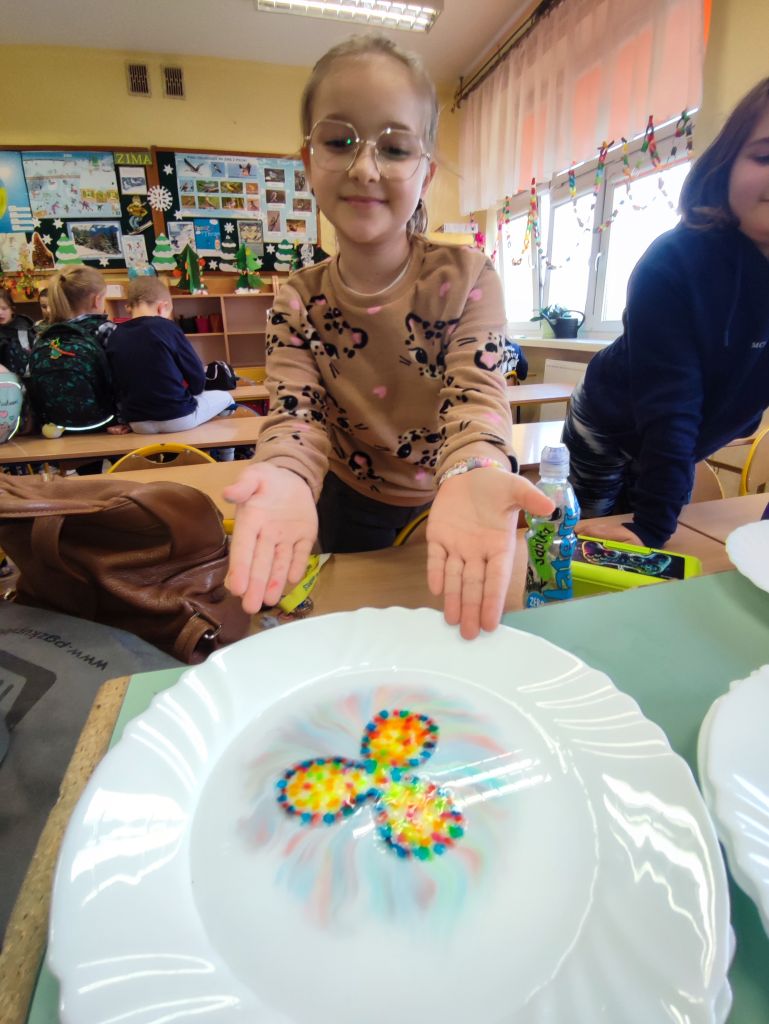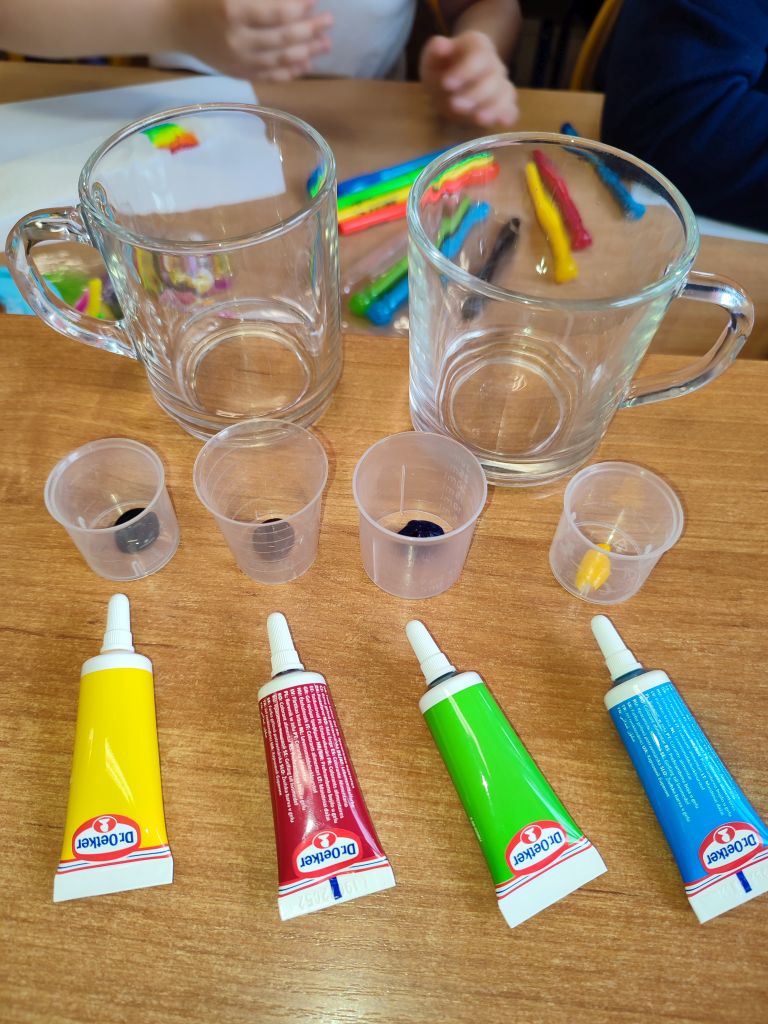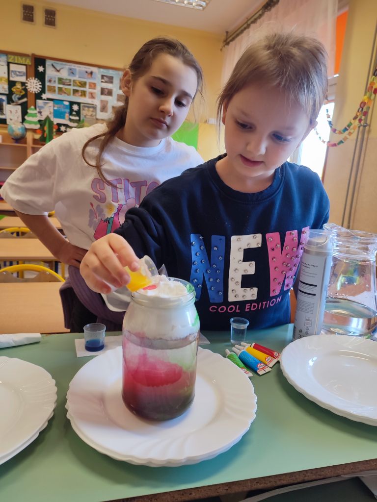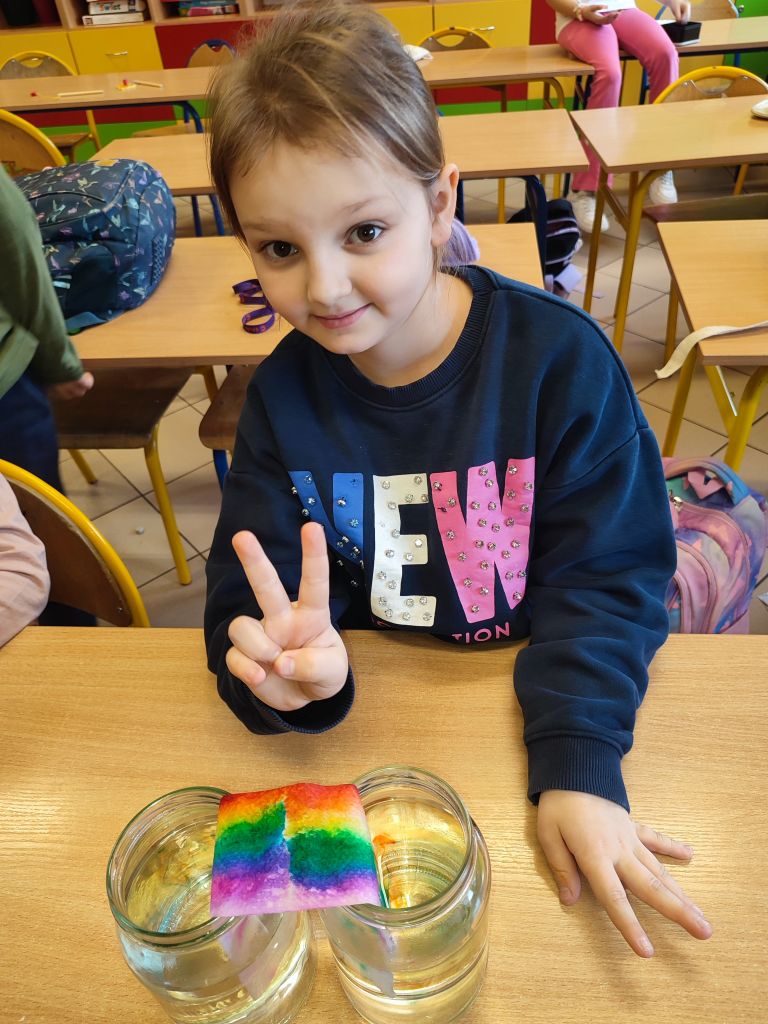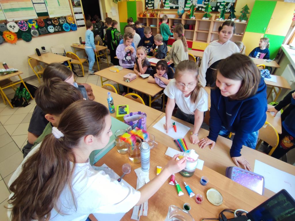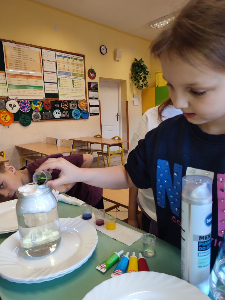 2.    Kolorowa chemia w wodzie – uczniowie dodawali różne barwniki do wody i obserwowali, jak mieszają się kolory, tworząc nowe odcienie. Eksperyment uczył przewidywania efektów i zrozumienia zależności przyczynowo-skutkowych w reakcjach fizyczno-chemicznych.
