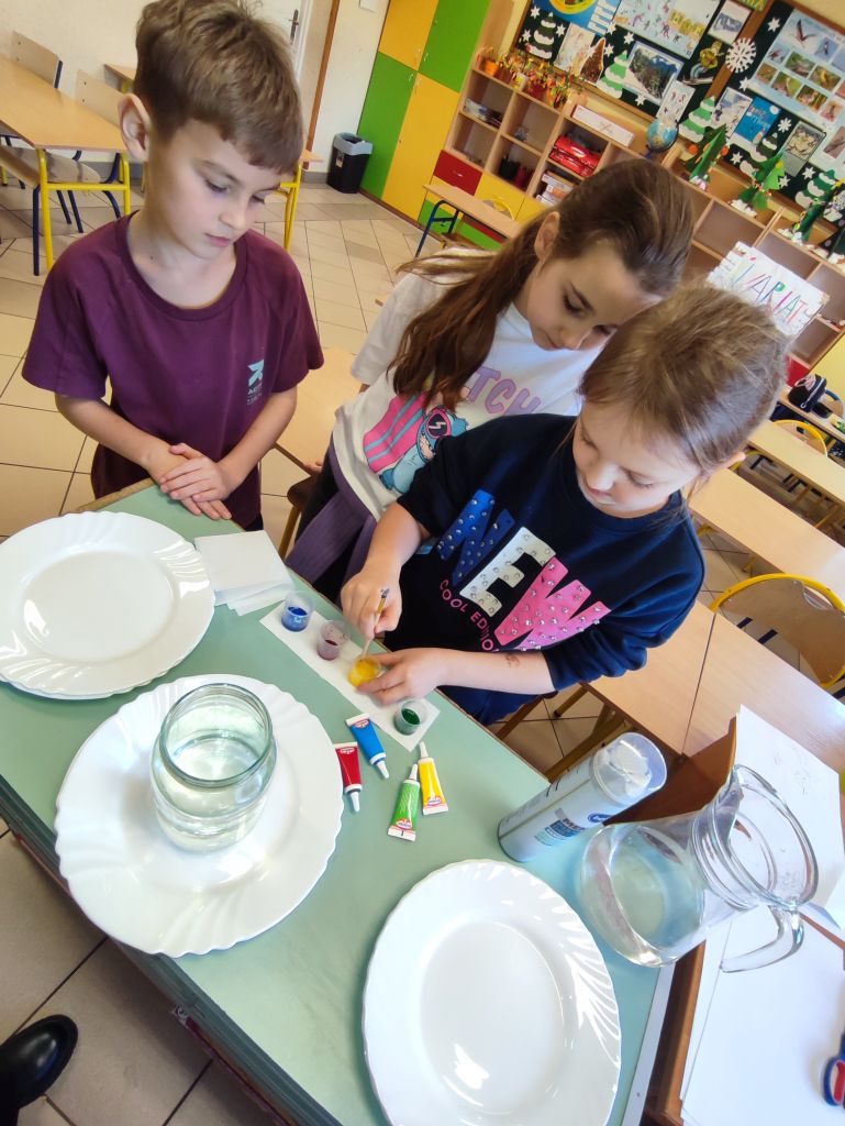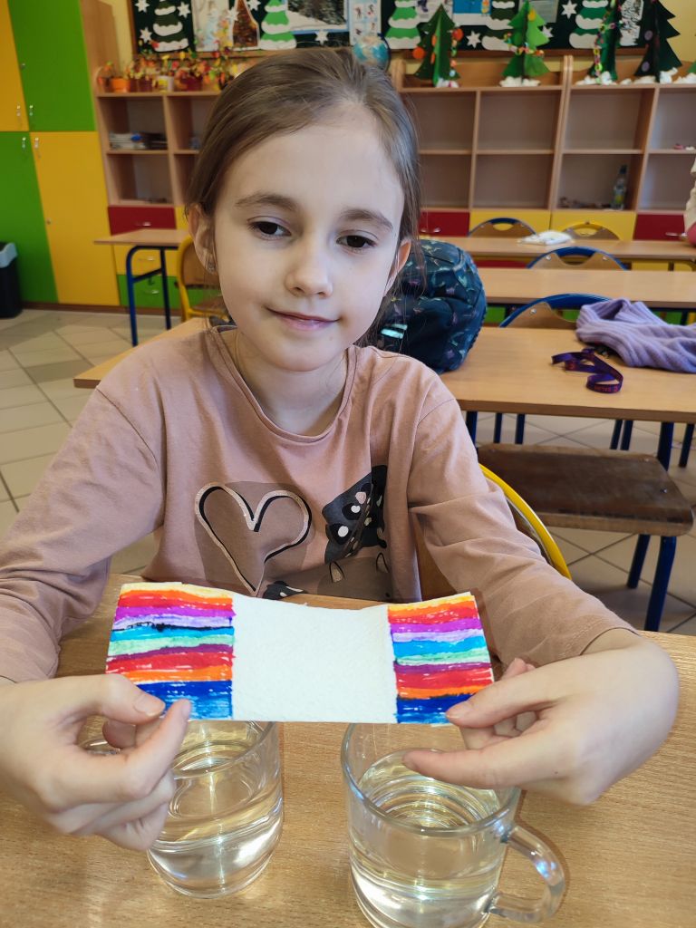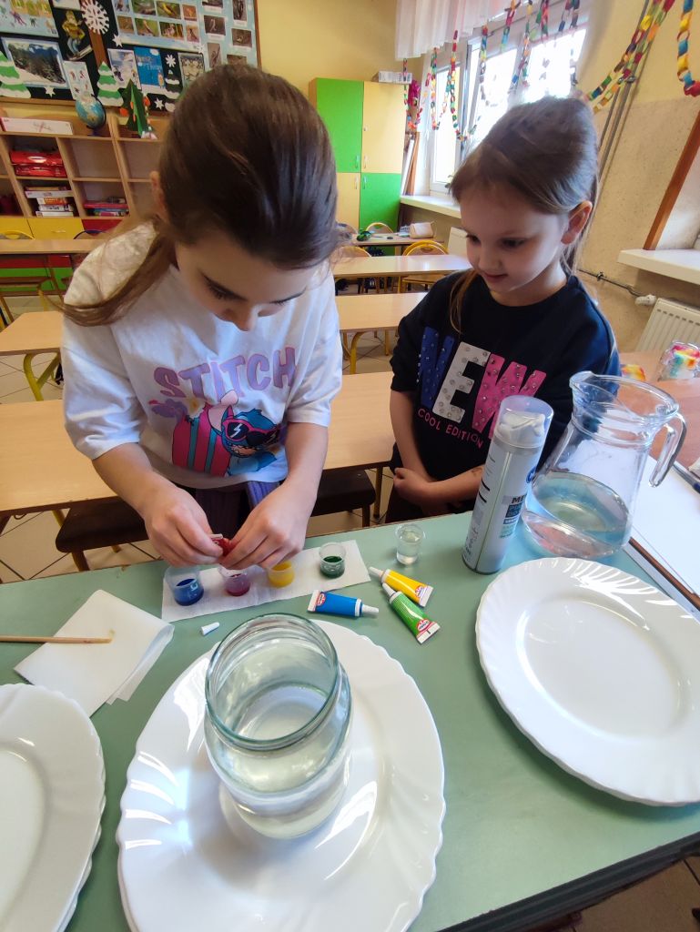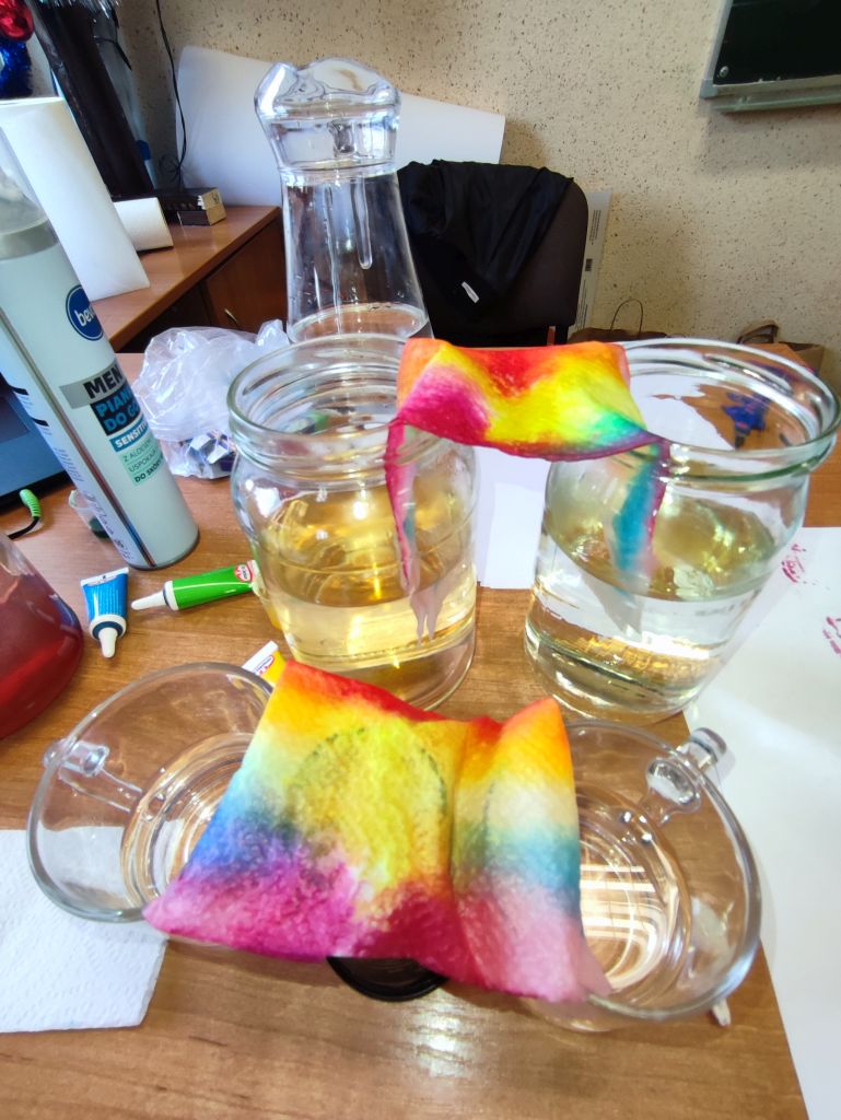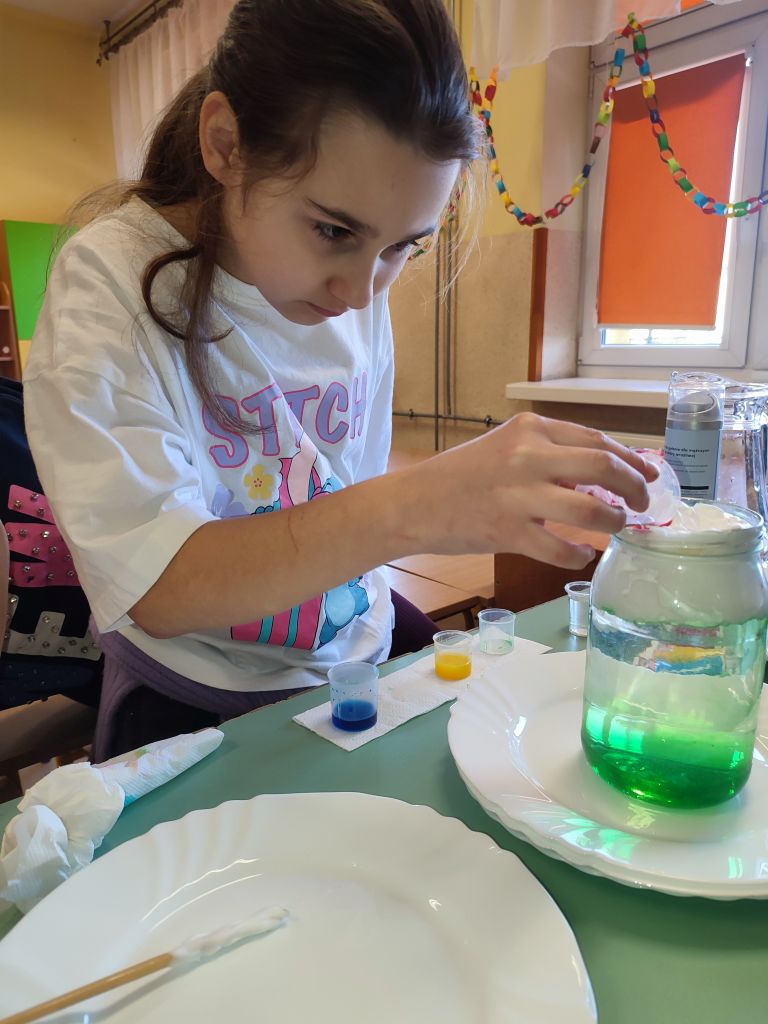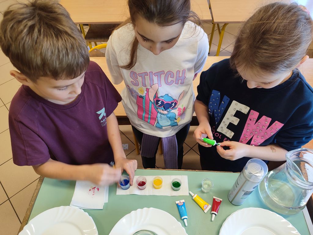 2.    Kolorowa chemia w wodzie – uczniowie dodawali różne barwniki do wody i obserwowali, jak mieszają się kolory, tworząc nowe odcienie. Eksperyment uczył przewidywania efektów i zrozumienia zależności przyczynowo-skutkowych w reakcjach fizyczno-chemicznych.