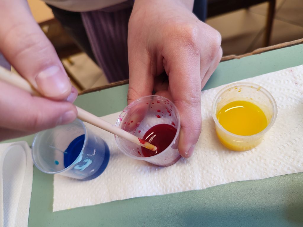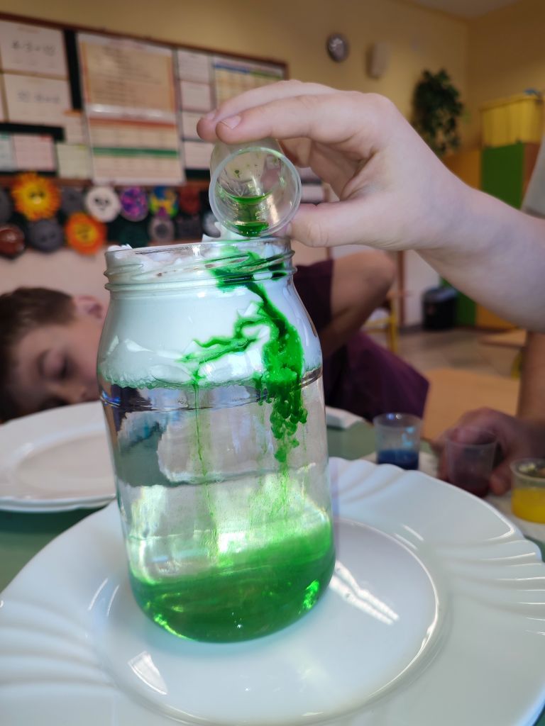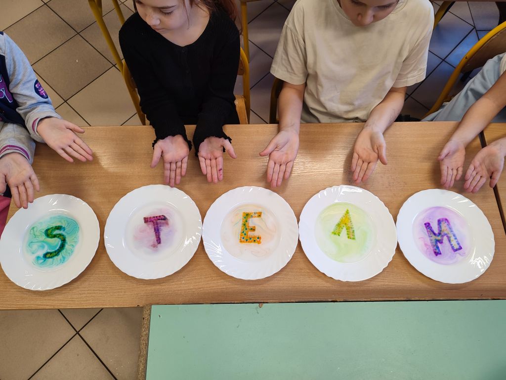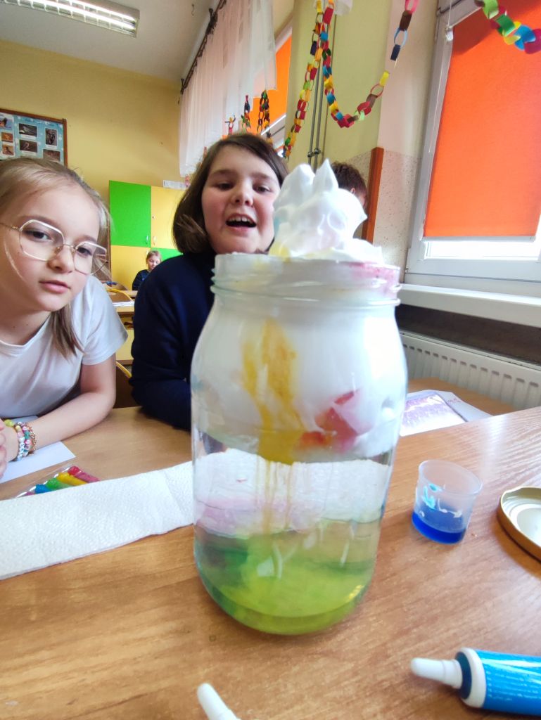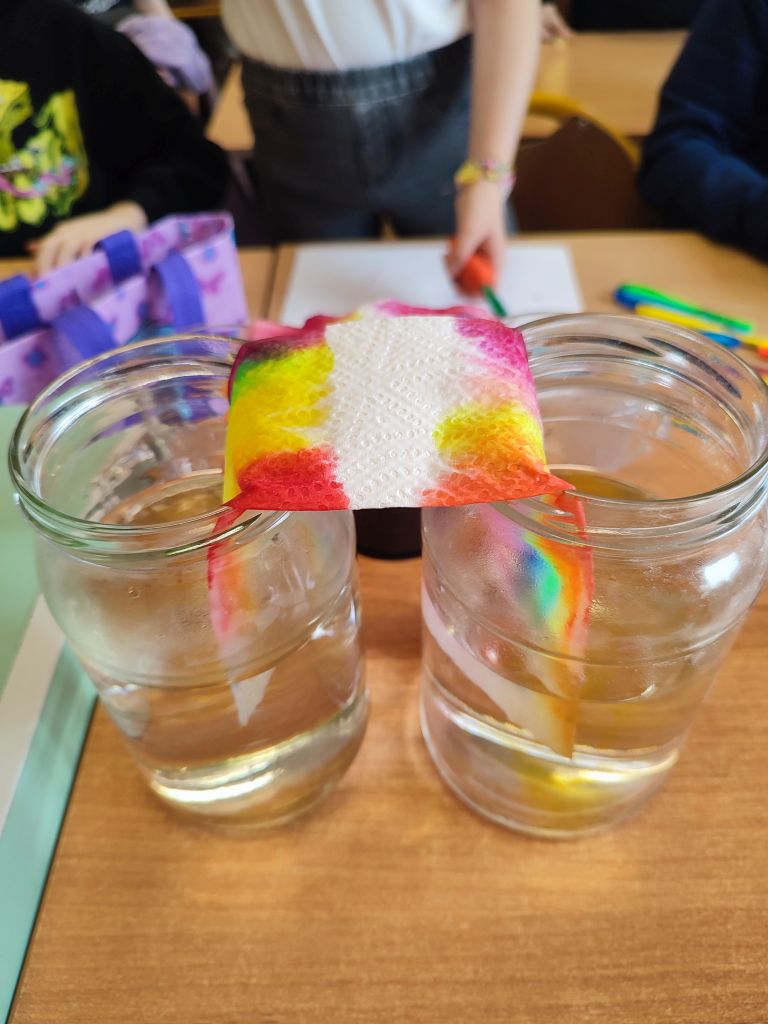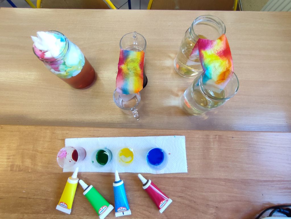 2.    Kolorowa chemia w wodzie – uczniowie dodawali różne barwniki do wody i obserwowali, jak mieszają się kolory, tworząc nowe odcienie. Eksperyment uczył przewidywania efektów i zrozumienia zależności przyczynowo-skutkowych w reakcjach fizyczno-chemicznych.