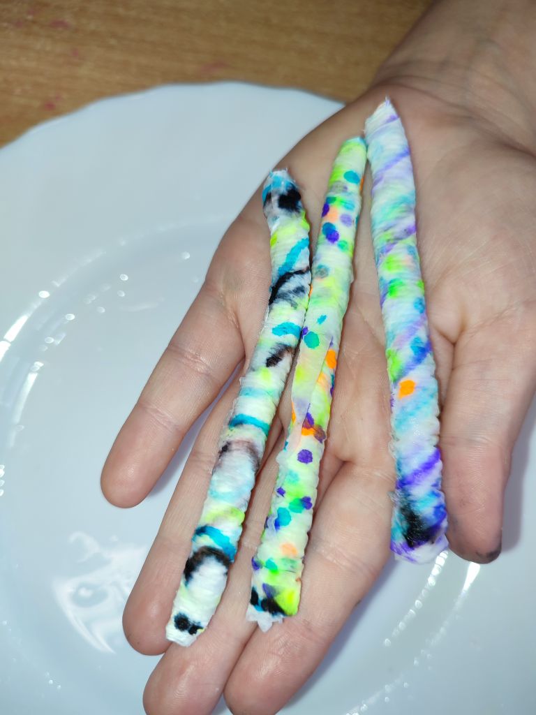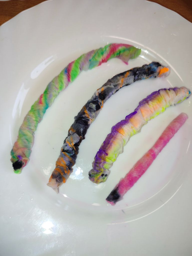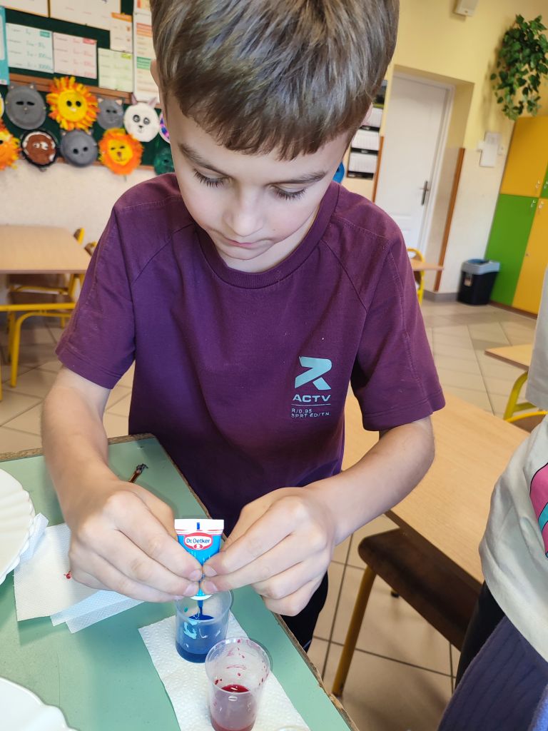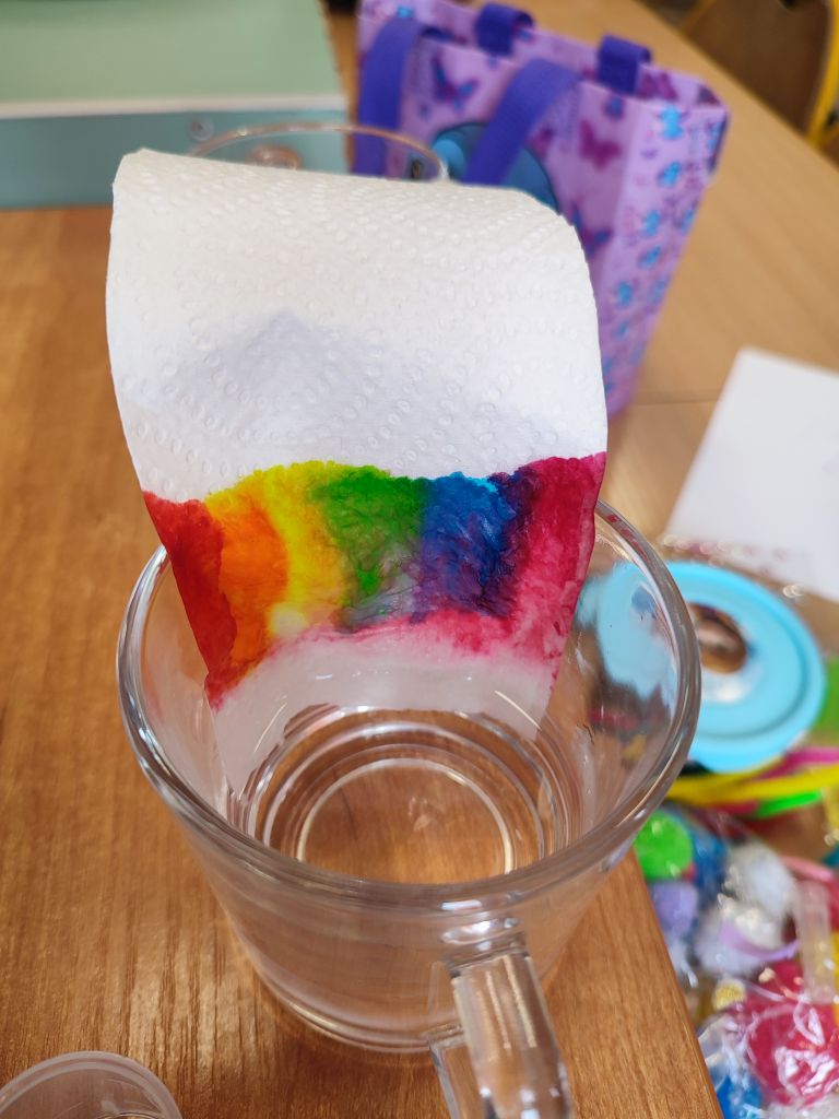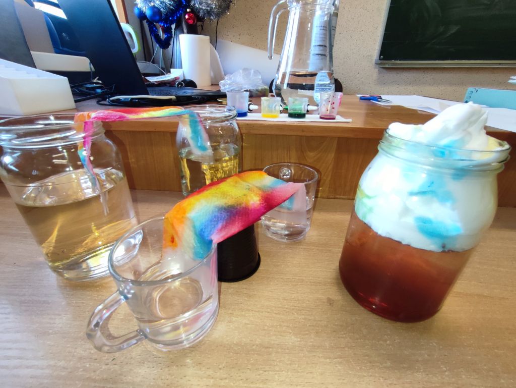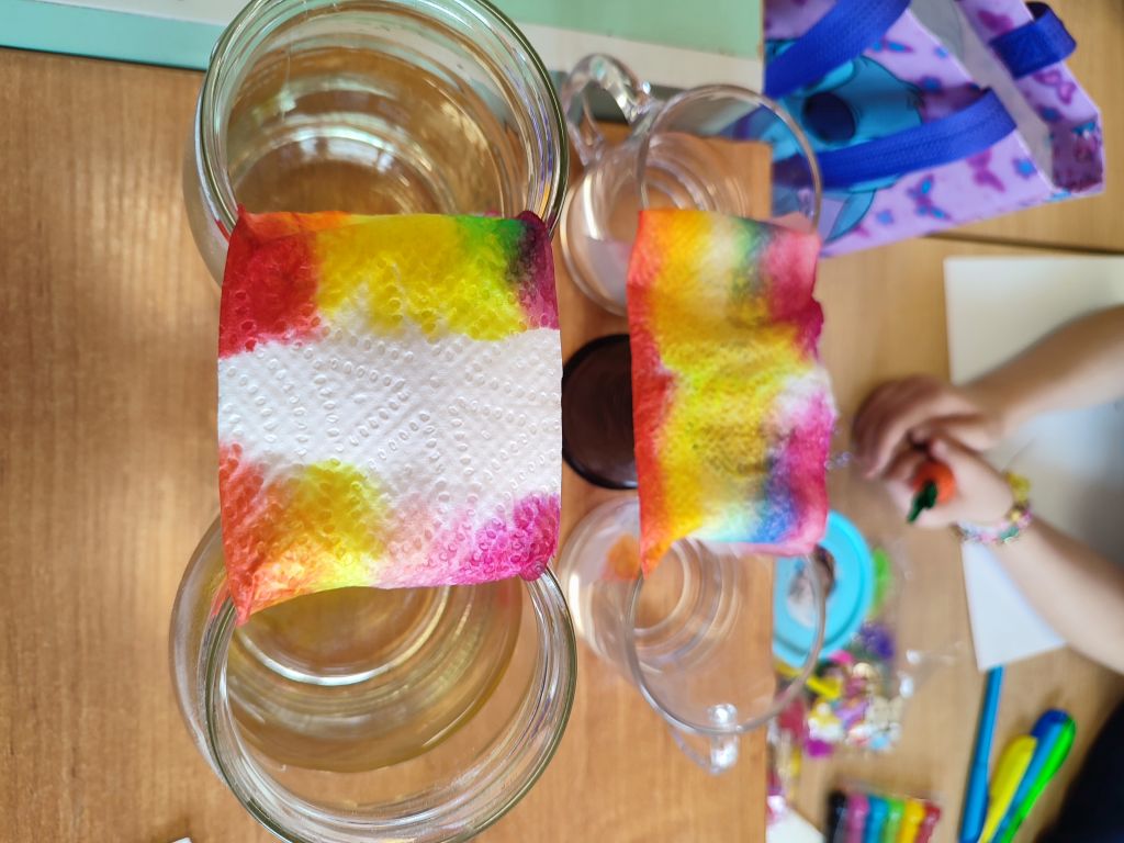 2.    Kolorowa chemia w wodzie – uczniowie dodawali różne barwniki do wody i obserwowali, jak mieszają się kolory, tworząc nowe odcienie. Eksperyment uczył przewidywania efektów i zrozumienia zależności przyczynowo-skutkowych w reakcjach fizyczno-chemicznych.