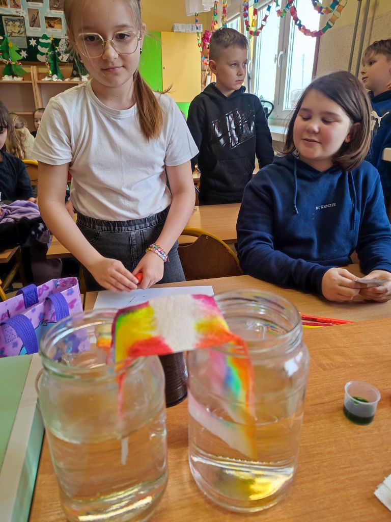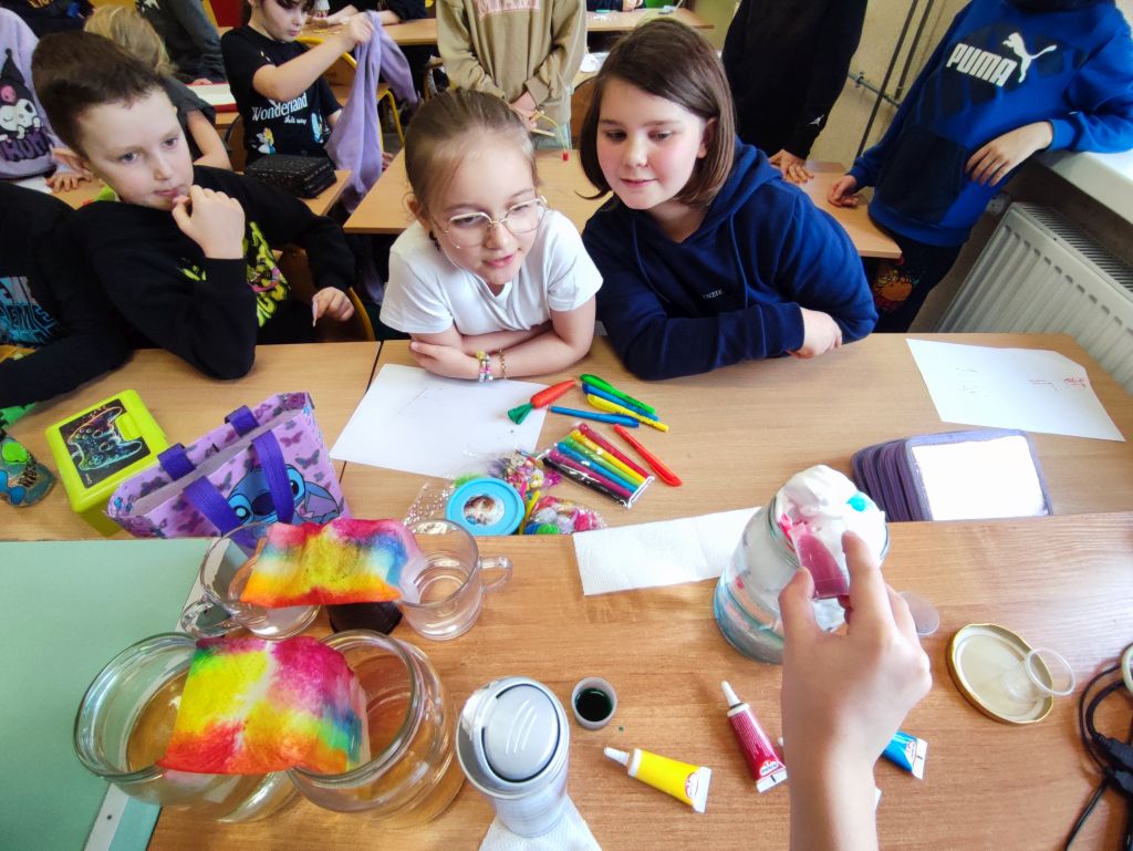 Podczas zajęć eksperymentalnych - Mini warsztaty chemiczne z barwnikami - uczniowie mieli okazję przeprowadzić proste doświadczenia chemiczne, które rozwijały obserwację, logiczne myślenie i wyciąganie wniosków: