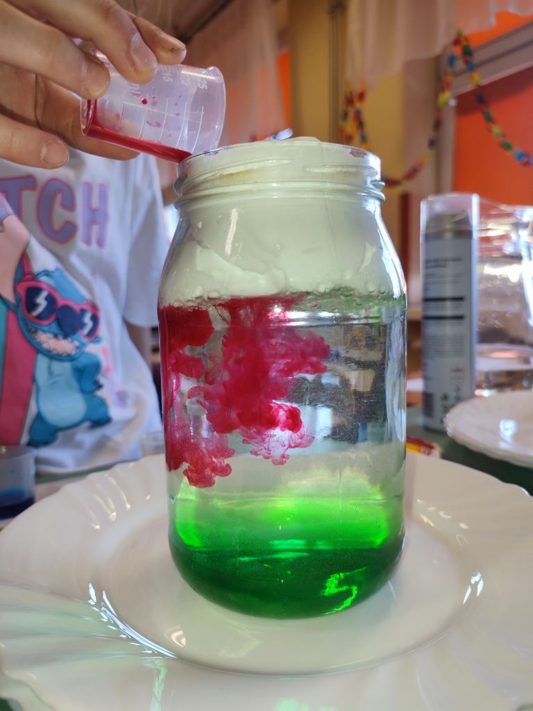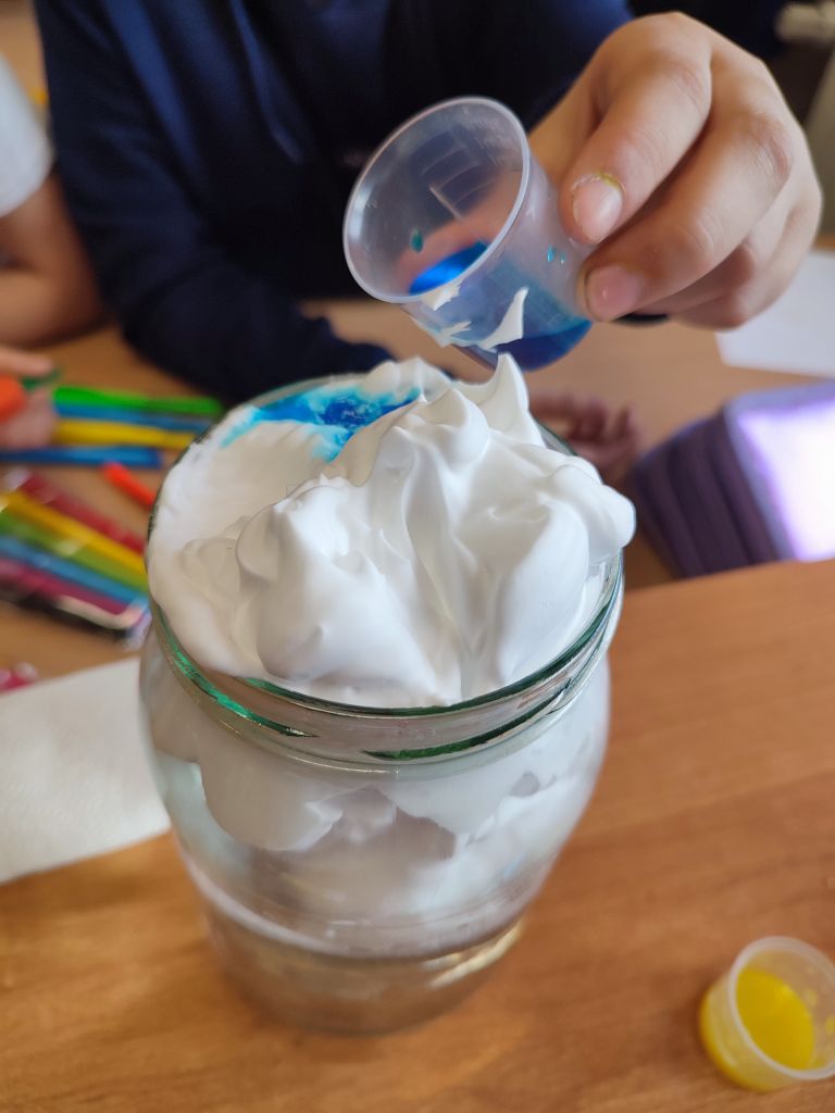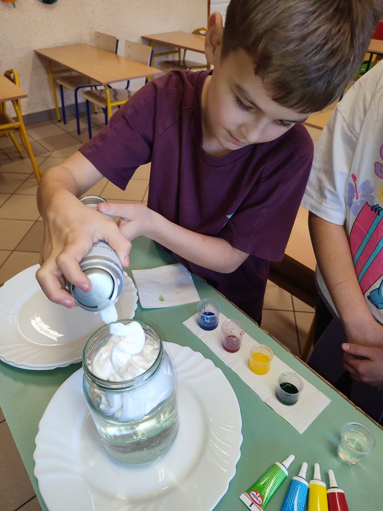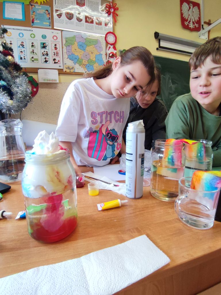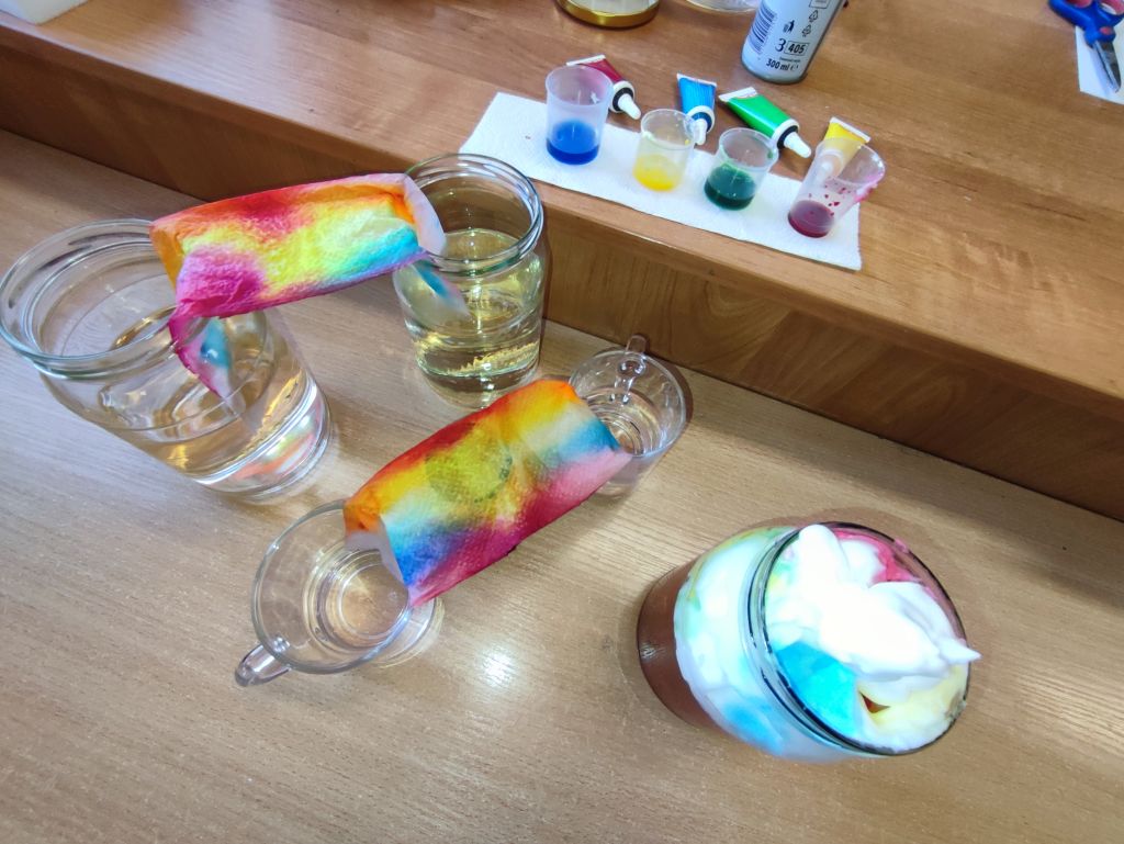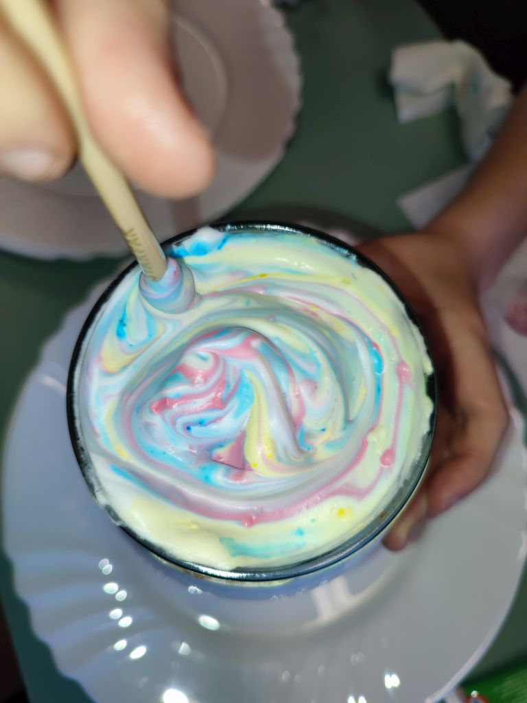 1.    Tęcza w piance do golenia – dzieci wlewały barwniki spożywcze na powierzchnię pianki do golenia i obserwowały, jak kolory się mieszają, tworząc dynamiczne wzory. Doświadczenie pokazywało ruch cząsteczek i proces dyfuzji w zabawny, wizualny sposób.