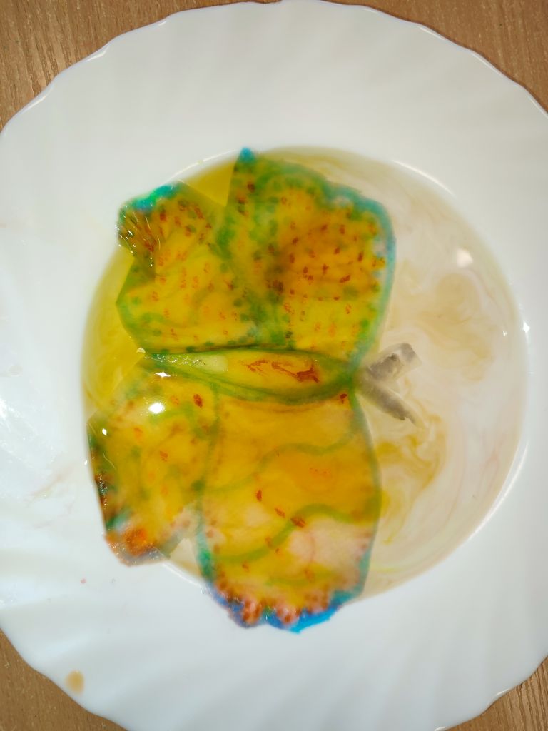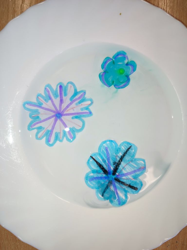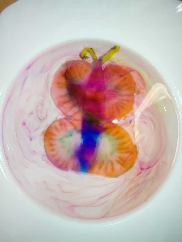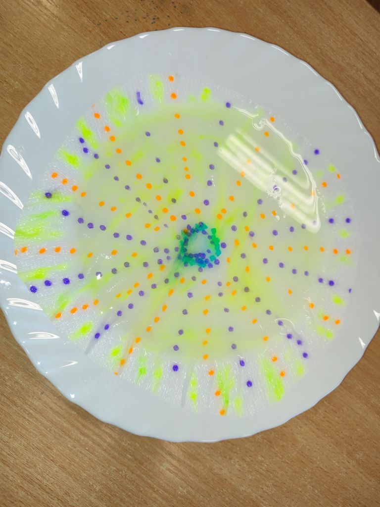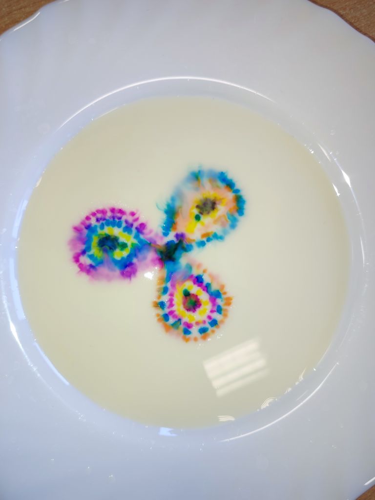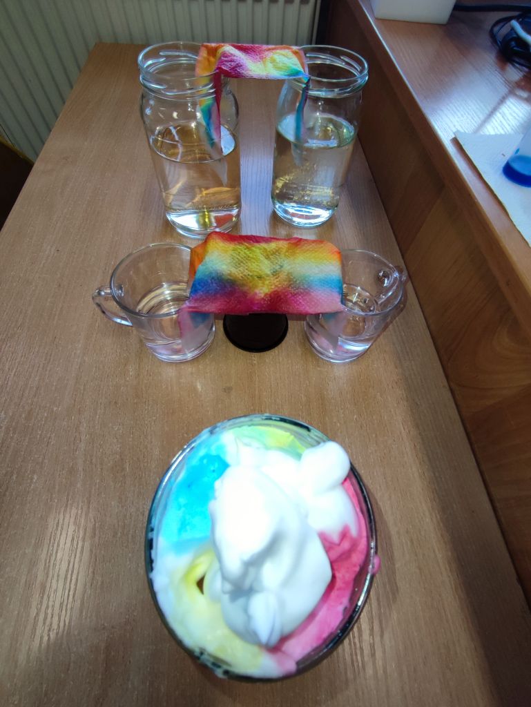 1.    Tęcza w piance do golenia – dzieci wlewały barwniki spożywcze na powierzchnię pianki do golenia i obserwowały, jak kolory się mieszają, tworząc dynamiczne wzory. Doświadczenie pokazywało ruch cząsteczek i proces dyfuzji w zabawny, wizualny sposób.