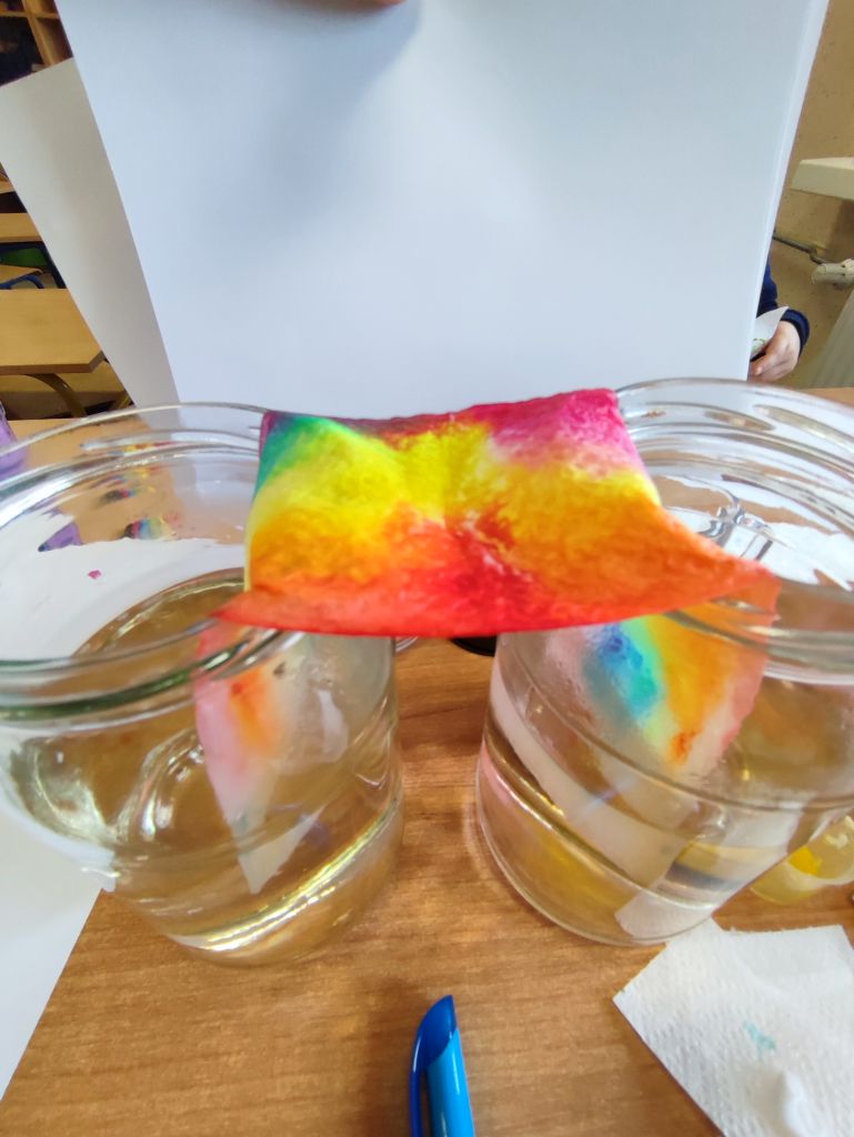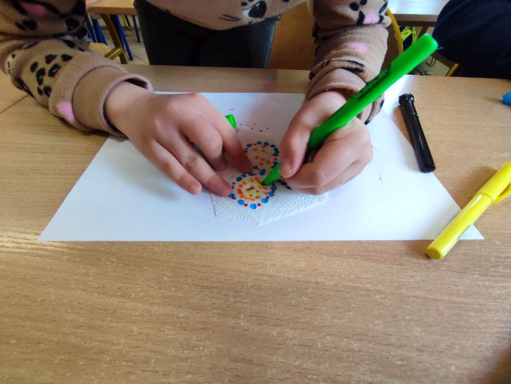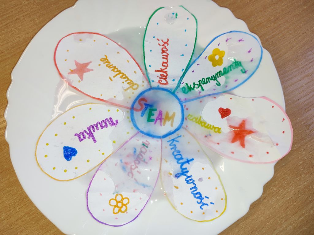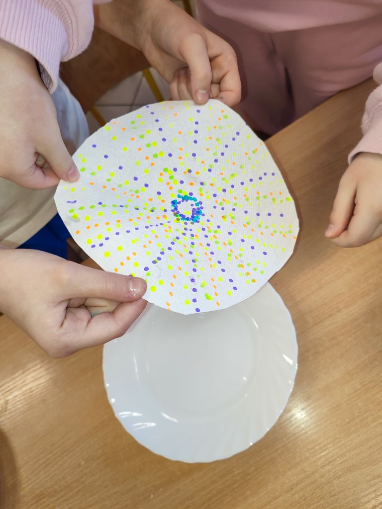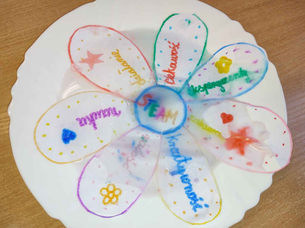 W zajęciach Gdy materia reaguje oraz Kolor w ruchu uczniowie odkrywali zależności między materiałem, wodą i ruchem, obserwowali dyfuzję i mieszanie barw oraz łączyli zjawiska fizyczne z ekspresją plastyczną. Dzięki temu rozwijali ciekawość poznawczą, umiejętność wyciągania wniosków, przewidywania efektów i formułowania prostych hipotez.