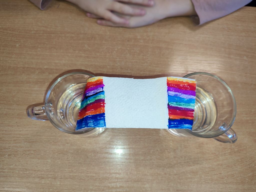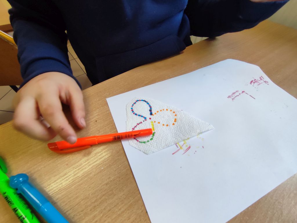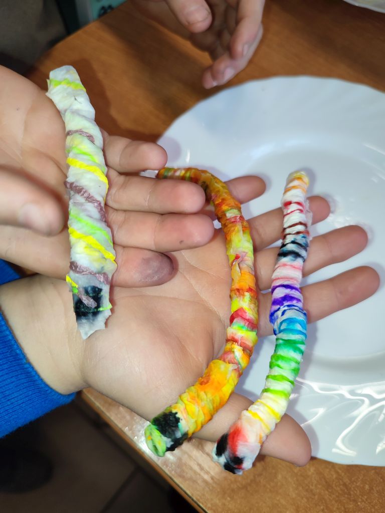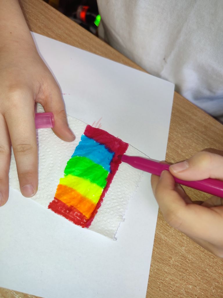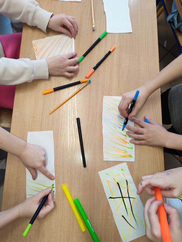 W zajęciach Gdy materia reaguje oraz Kolor w ruchu uczniowie odkrywali zależności między materiałem, wodą i ruchem, obserwowali dyfuzję i mieszanie barw oraz łączyli zjawiska fizyczne z ekspresją plastyczną. Dzięki temu rozwijali ciekawość poznawczą, umiejętność wyciągania wniosków, przewidywania efektów i formułowania prostych hipotez.