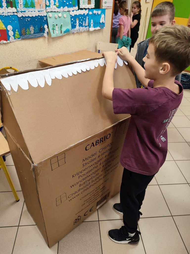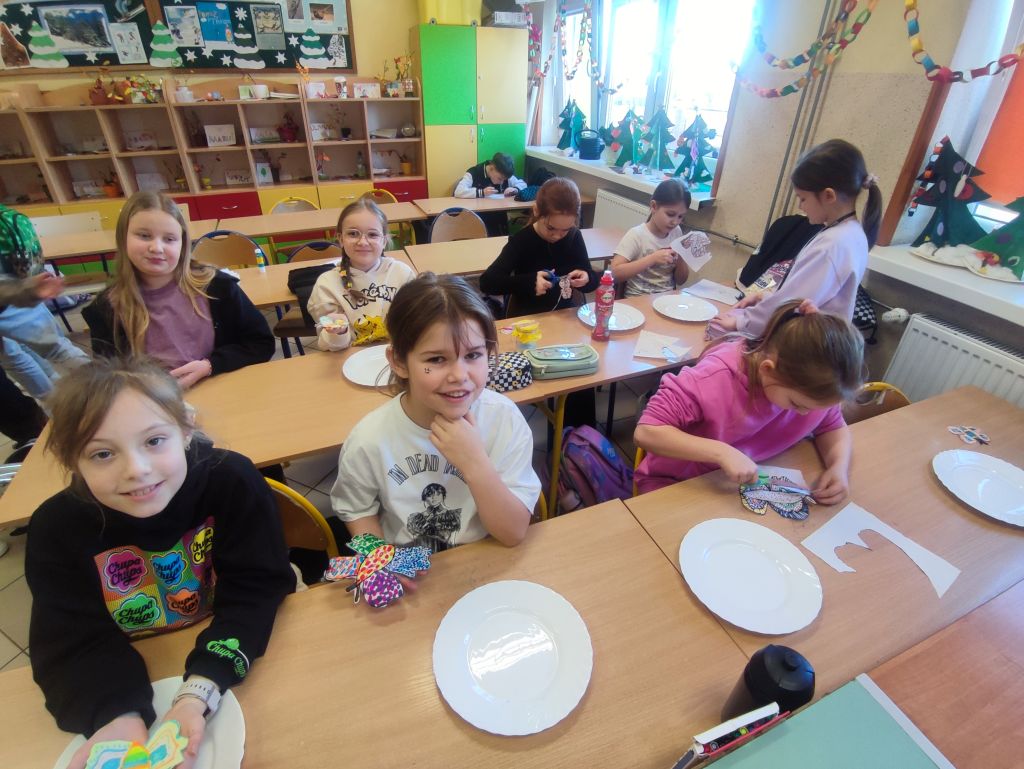 Piernikowa Fabryka z Tektury pozwoliła dzieciom poznać tradycję pieczenia pierników oraz samodzielnie tworzyć świąteczne ozdoby. Uczniowie przygotowywali tekturowe kształty, korzystając z foremek, szablonów i własnych pomysłów, a następnie malowali je i dekorowali farbami, brokatem, cekinami i kolorowym papierem. Gotowe „pierniczki” trafiły na wspólną, nastrojową wystawę, rozwijając sprawność manualną, estetykę i poczucie satysfakcji z efektu własnej pracy.