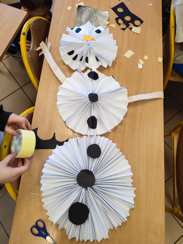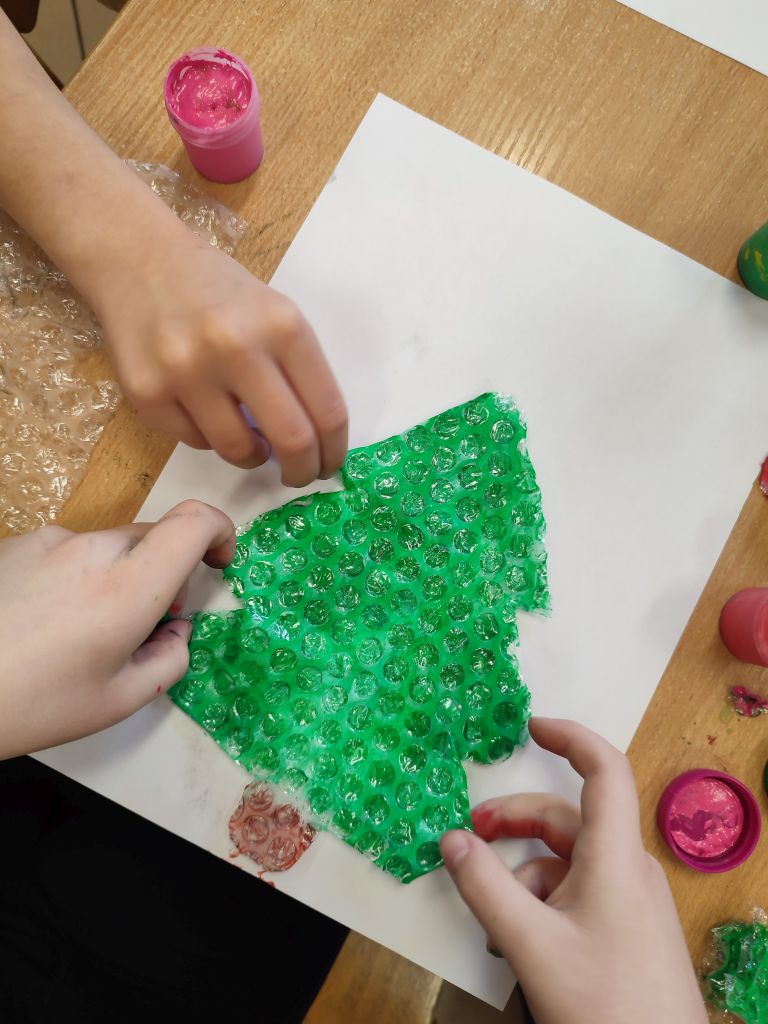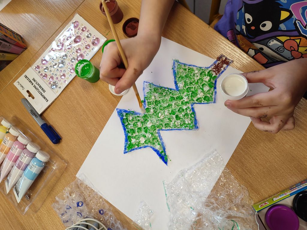 W ramach Świątecznych Inspiracji – kreatywnych technik plastycznych i działań STEAM dzieci malowały farbami na folii bąbelkowej, tworzyły choinki, bombki, prezenty, wycinanki i śnieżynki z tektury oraz prace przestrzenne. Każde zadanie pozwalało eksperymentować z materiałami, rozwijać wyobraźnię przestrzenną, umiejętność projektowania i łączenia elementów plastyki z nauką.