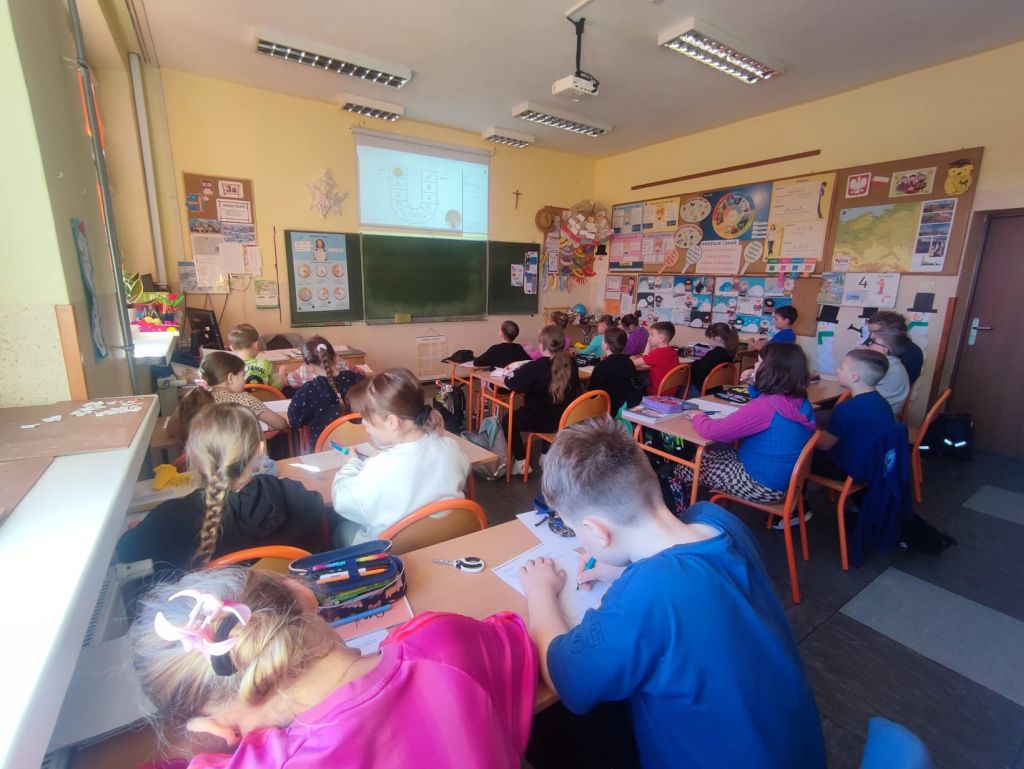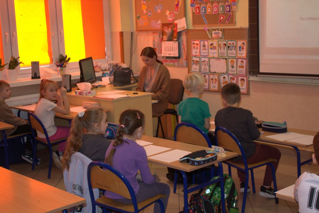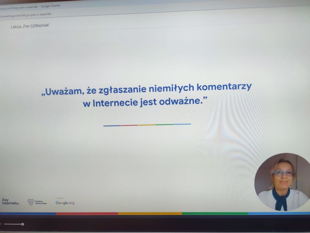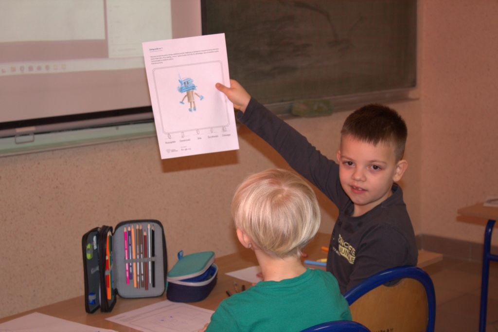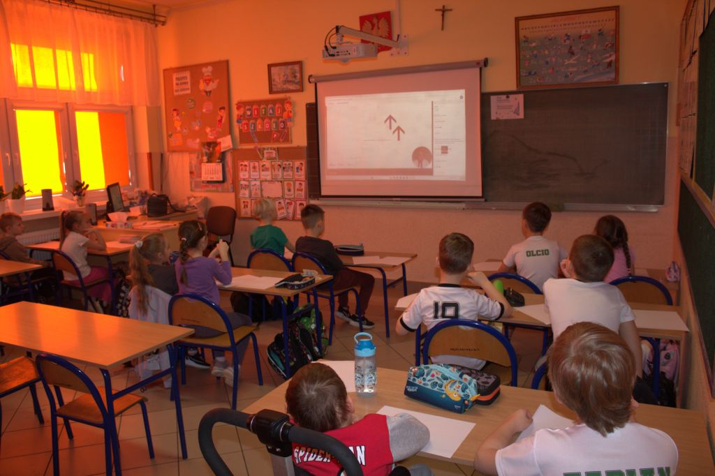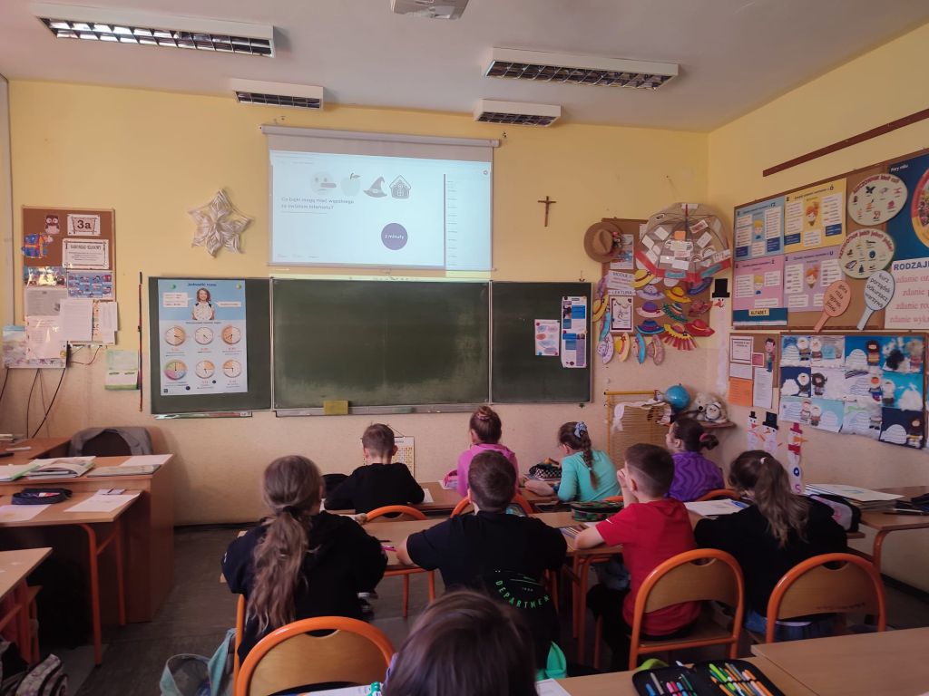 Uczniowie klas 1–3 uczestniczyli w lekcji „Pan (U)Ważniak”, podczas której poznali historię bohatera odkrywającego zasady bezpiecznego korzystania z Internetu. Dzieci rozwiązywały zadania i zagadki, które pokazywały, jak ważna jest uważność w świecie cyfrowym. W trakcie zajęć uczniowie dowiedzieli się, że dzięki współpracy, rozwadze i wzajemnej pomocy można bezpiecznie poruszać się w sieci.