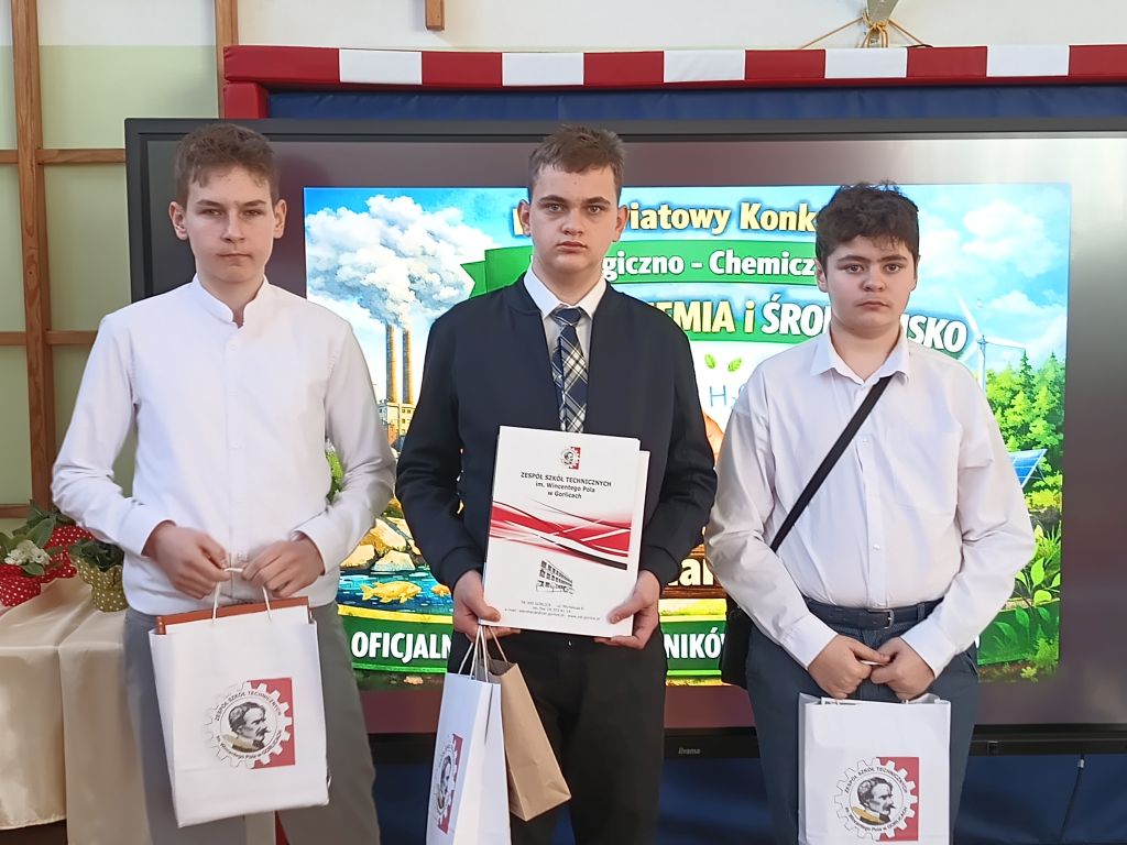 Przypomnijmy, że konkurs odbył się 4 marca 2026 r. w Zespole Szkół Technicznych im. Wincentego Pola w Gorlicach. W wydarzeniu wzięli udział uczniowie z wielu szkół powiatu, a naszą szkołę reprezentowali uczniowie klasy 8b: Wojciech Dąbrowski, Mikołaj Ducal oraz Maciej Dyląg.