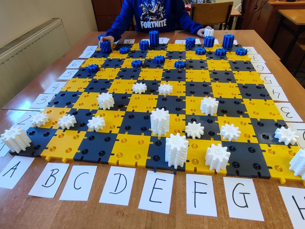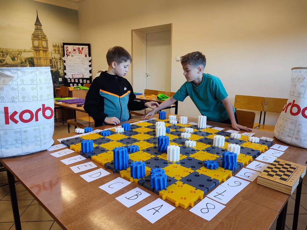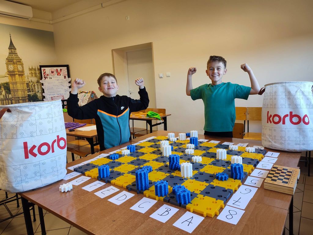 Wszystko zaczęło się od rozmowy o szachach. Uczniowie – pasjonaci tej gry – zgodnie stwierdzili, że tradycyjna plansza i figury są zbyt małe. Chcieli czegoś większego, bardziej wyrazistego i… własnoręcznie stworzonego. Pomysł pojawił się natychmiast: skoro standardowa plansza nie spełnia oczekiwań, zbudujmy własną – w większym formacie – z klocków Korbo.