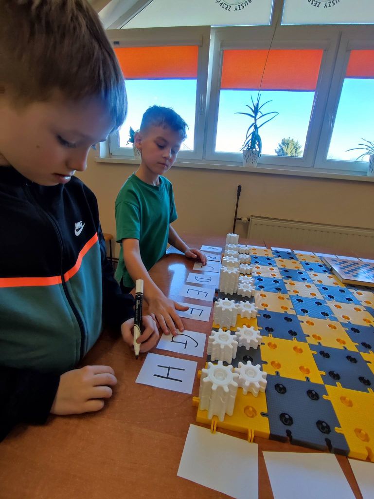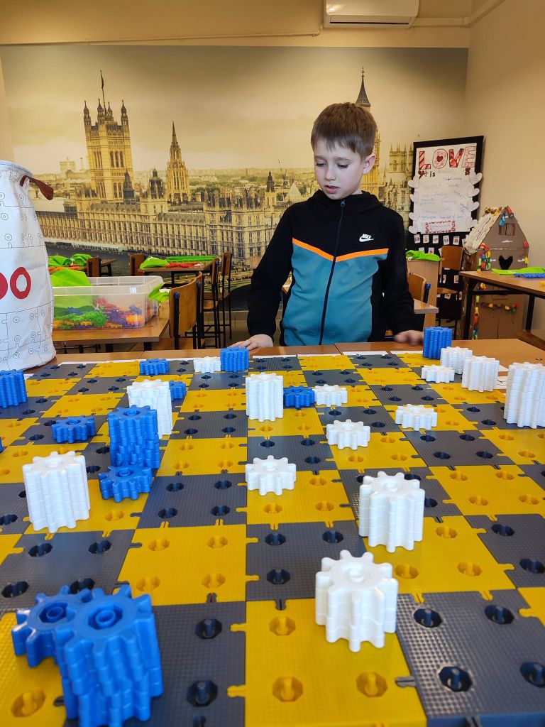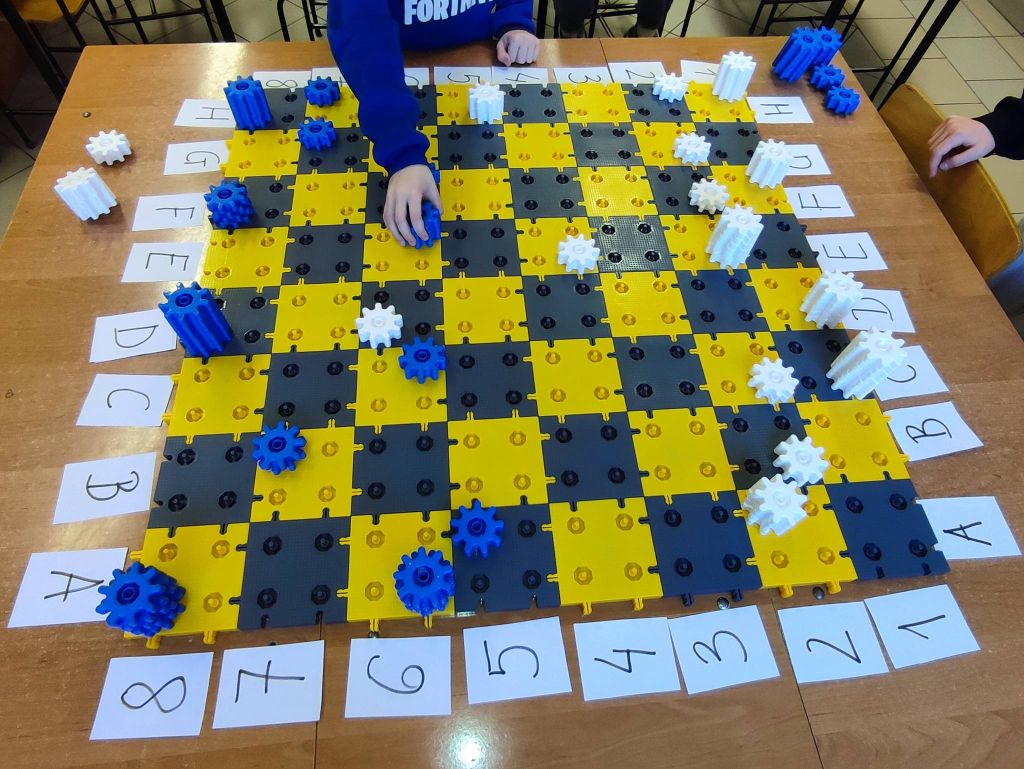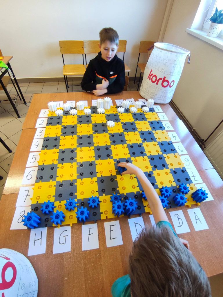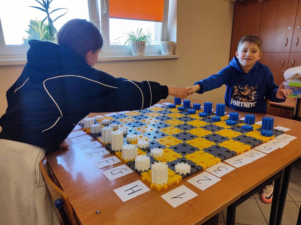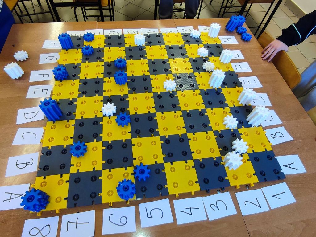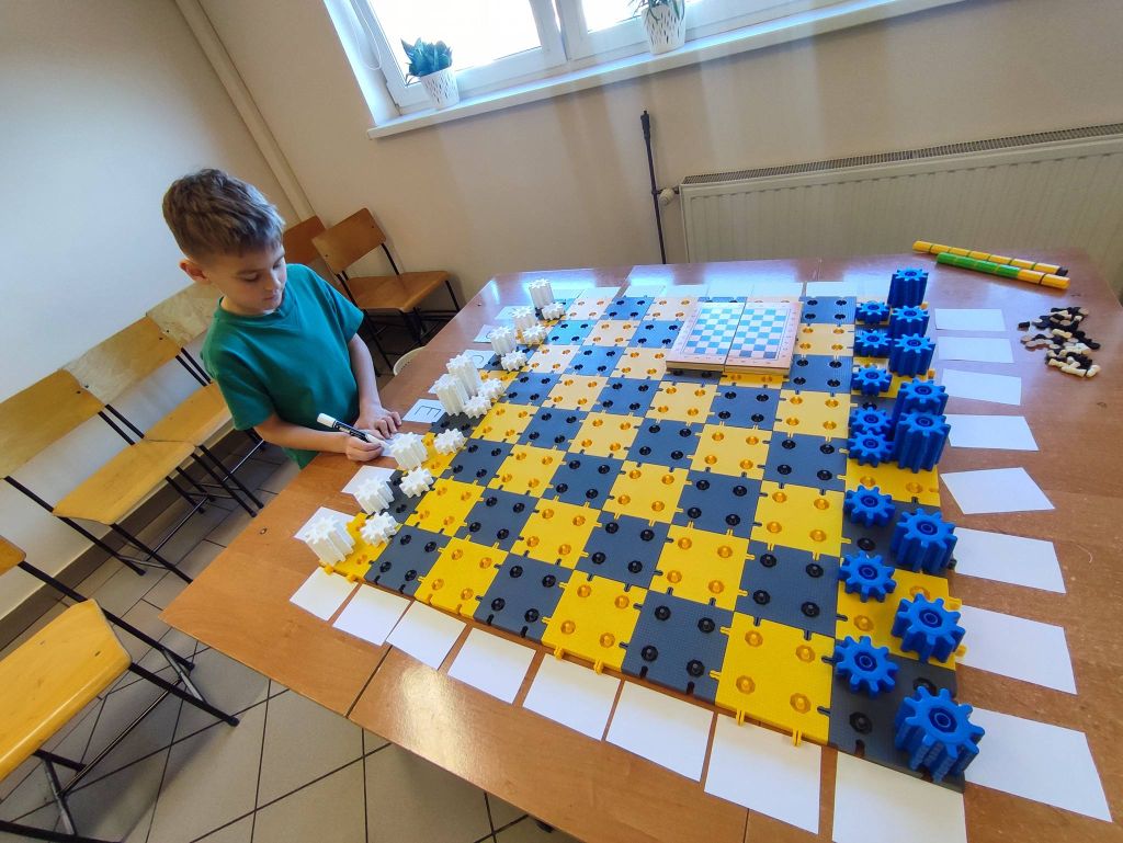 Budowa planszy była jednocześnie ćwiczeniem orientacji przestrzennej i logicznego myślenia. Uczniowie dbali o naprzemienny układ pól oraz stabilność konstrukcji, a każdy element musiał znaleźć swoje dokładnie zaplanowane miejsce.