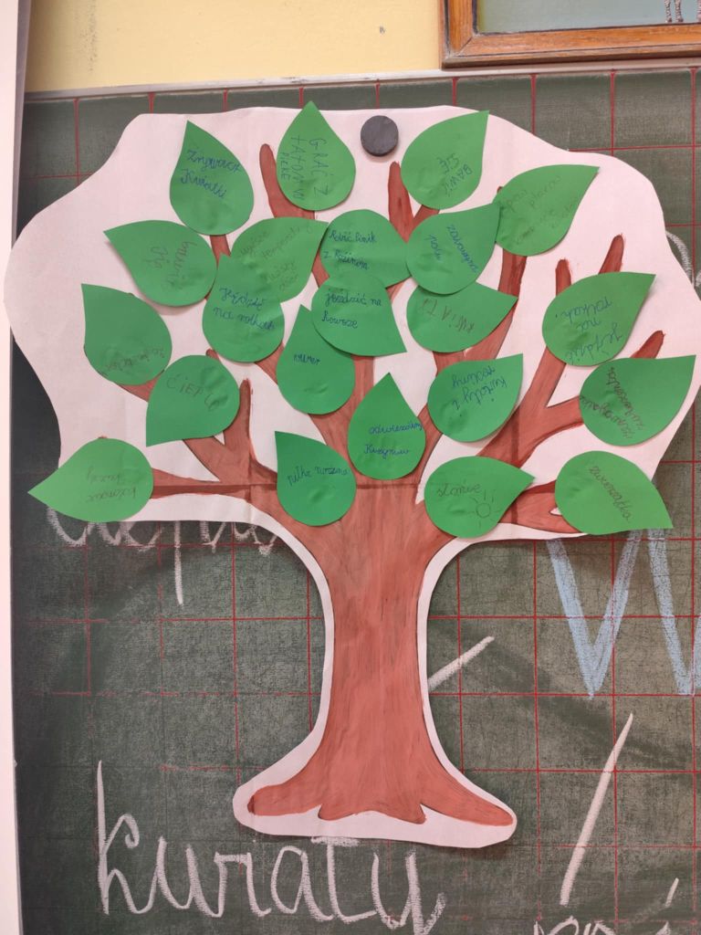 Kolejnym etapem zajęć było wykonanie wspólnej pracy plastycznej „Wiosenne drzewo”. Każdy uczeń otrzymał papierowy liść, na którym zapisał, co najbardziej podoba mu się wiosną. Liście zostały przyklejone do przygotowanego drzewa, tworząc barwną dekorację klasy.
