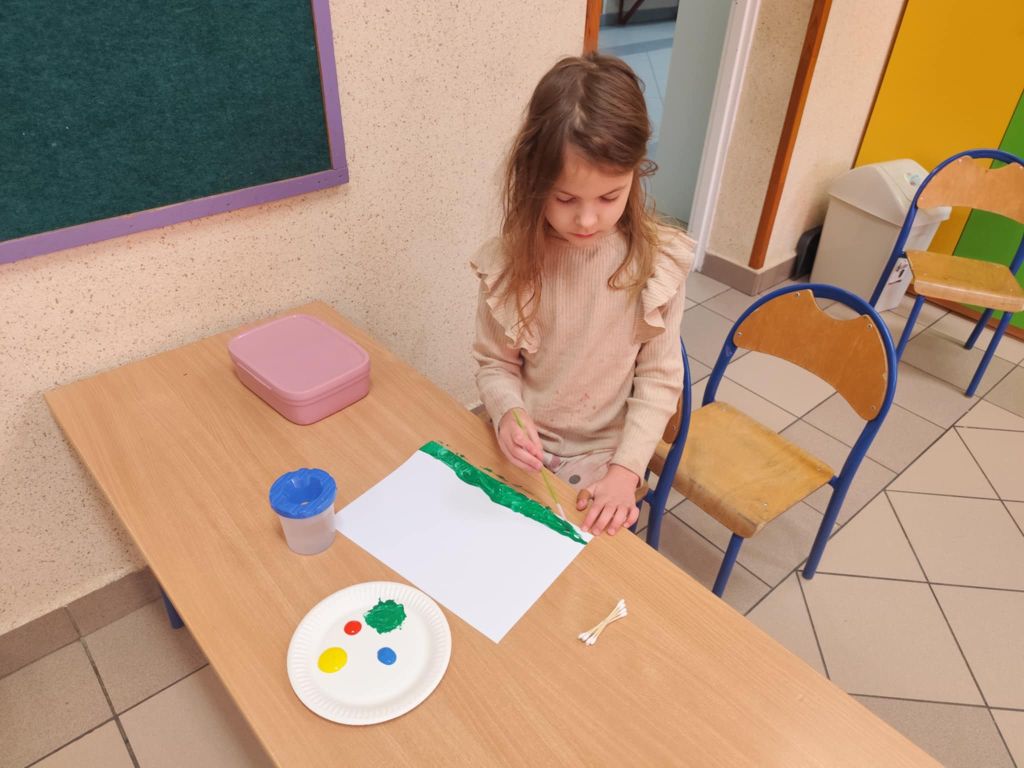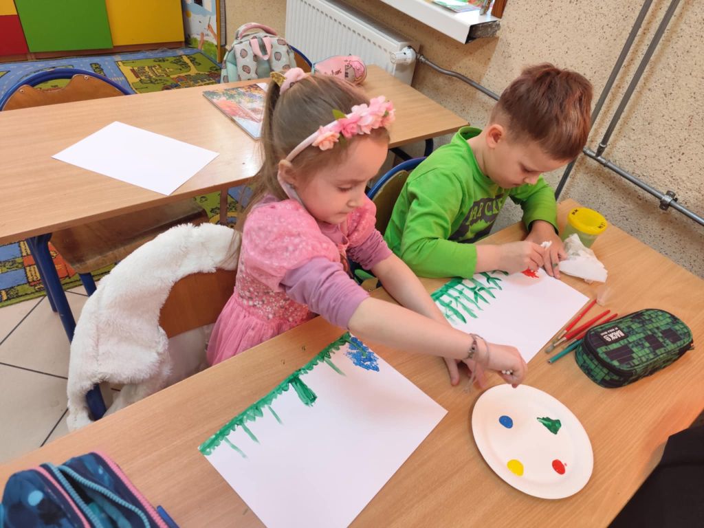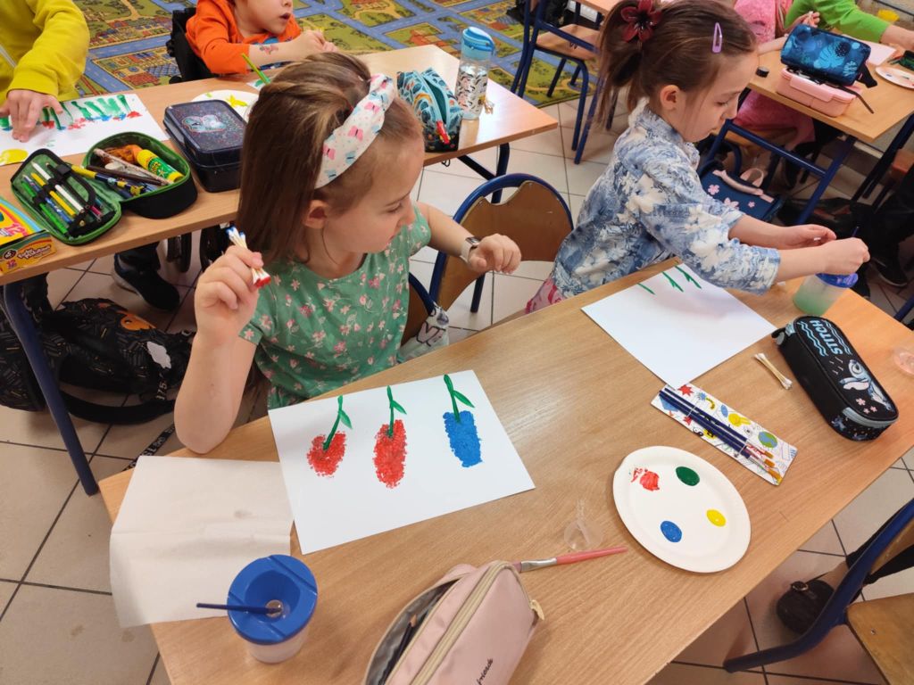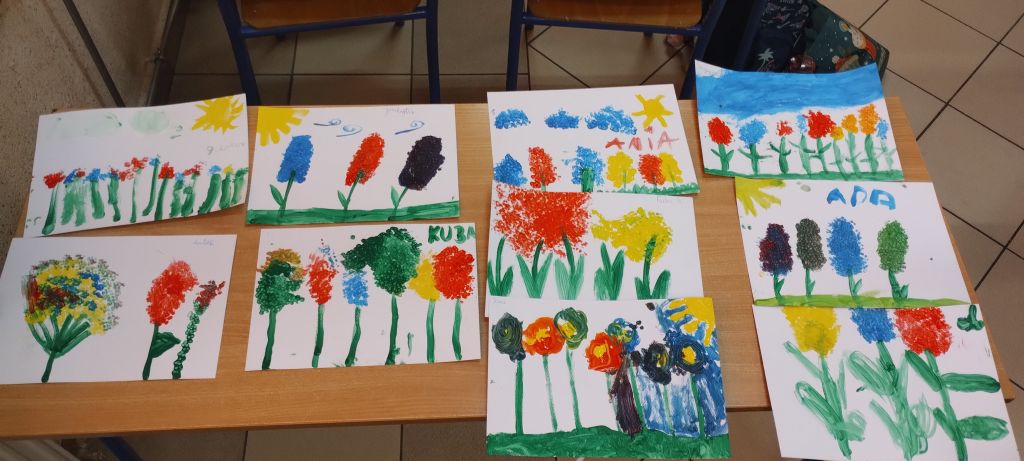 Dużo radości sprawiło dzieciom również wykonanie pracy plastycznej przedstawiającej wiosenne kwiaty – hiacynty. Uczniowie tworzyli je przy użyciu patyczków do uszu oraz farb plakatowych, rozwijając swoją wyobraźnię i sprawność manualną.