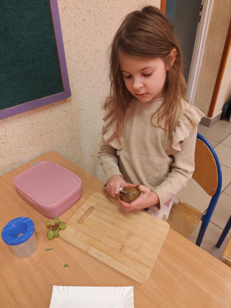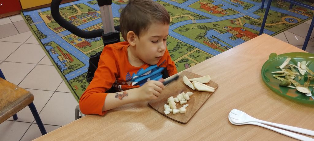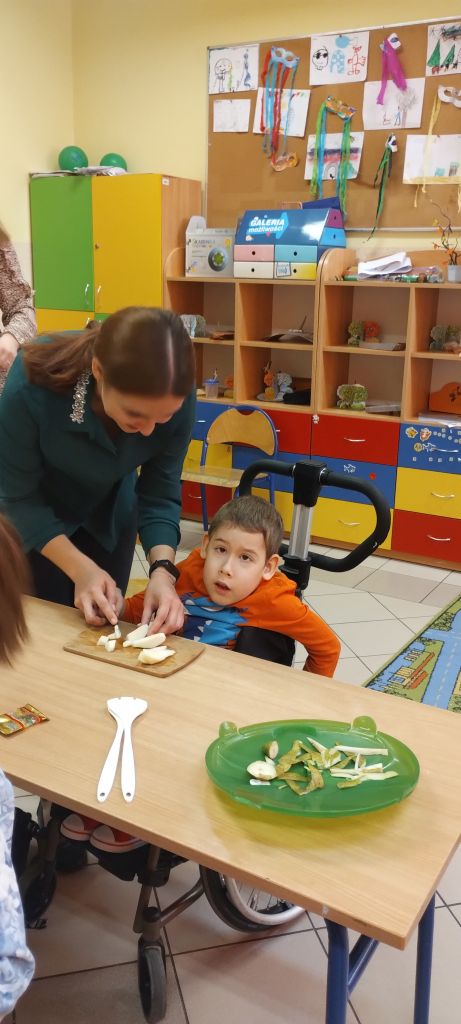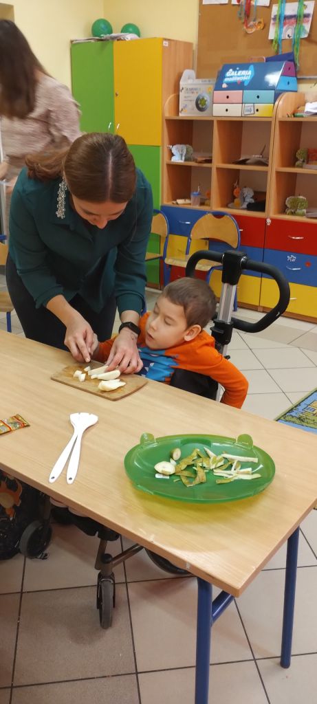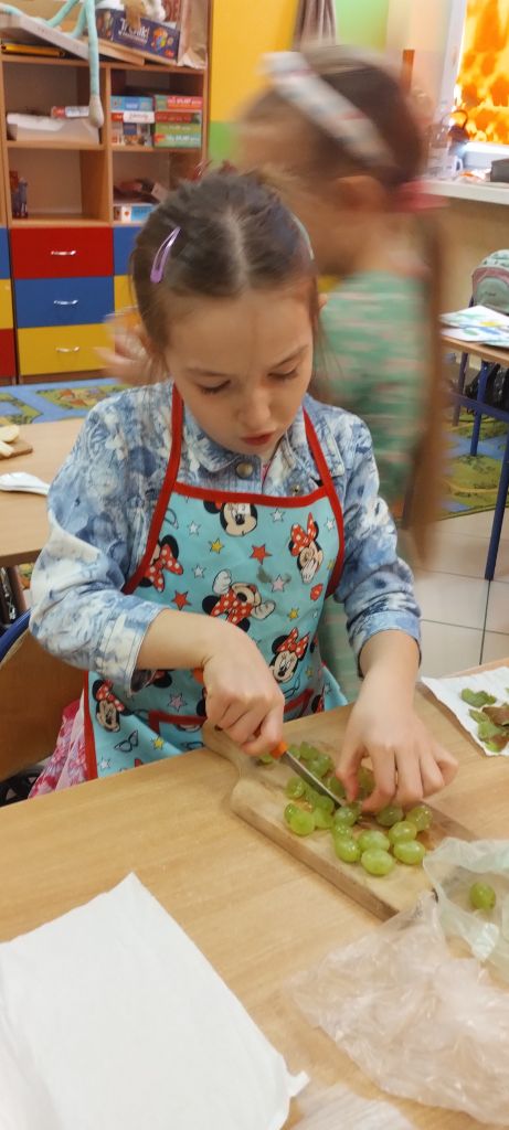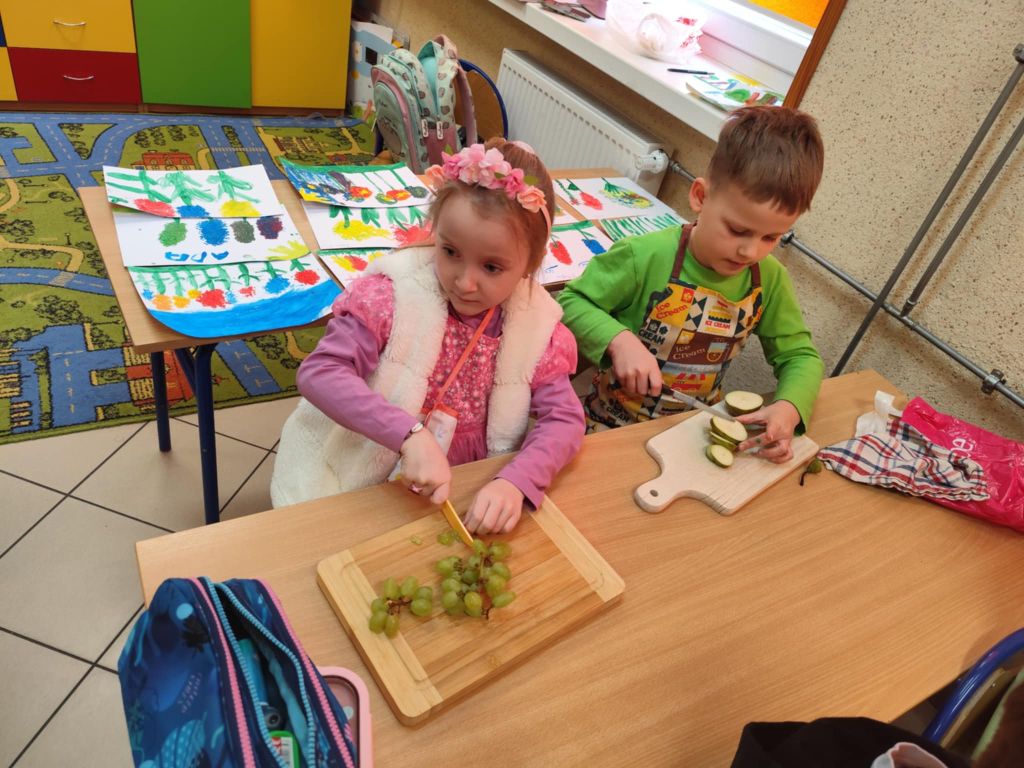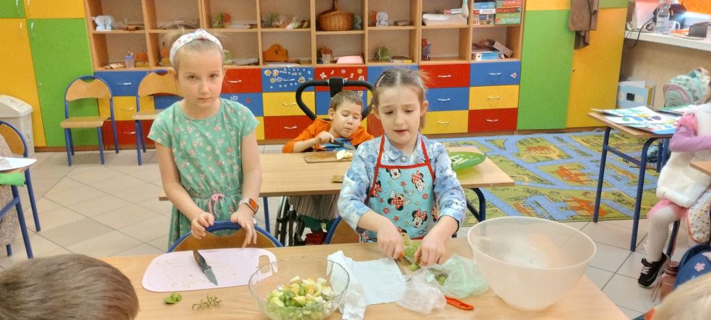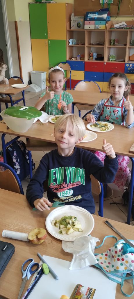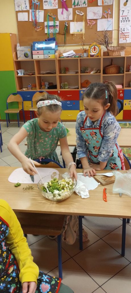 Na zakończenie zajęć dzieci przygotowały kolorową wiosenną sałatkę owocową. Po przypomnieniu zasad higieny wspólnie dodały do miski różne owoce, które następnie zostały wymieszane i z apetytem zjedzone.