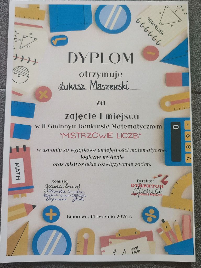 Sukces ucznia naszej szkoły w II Gminnym Konkursie Matematycznym w Binarowej