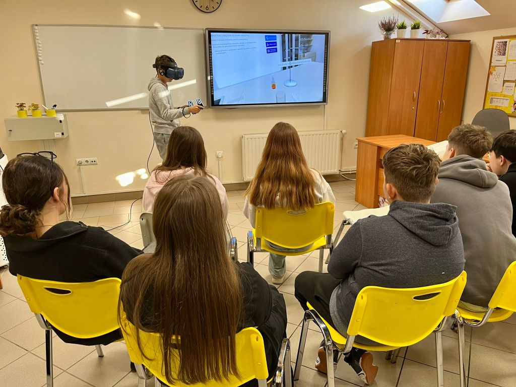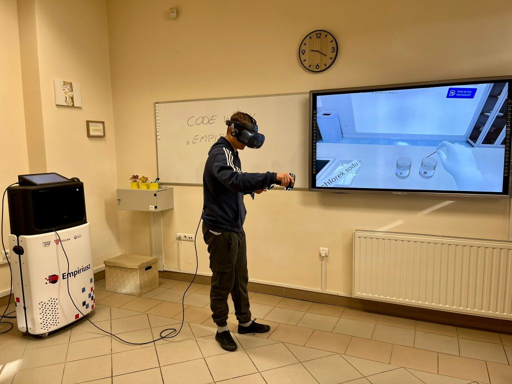 Na lekcjach chemii uczniowie mieli okazję przenieść się do wirtualnego laboratorium „Empiriusz”. Dzięki goglom VR i kontrolerom uczniowie przeprowadzali eksperymenty w środowisku 3D, obserwując zachodzące reakcje i procesy chemiczne. Dzięki połączeniu wiedzy teoretycznej z nowoczesnymi technologiami młodzież mogła w praktyczny sposób obserwować efekty swoich działań i zrozumieć procesy zachodzące w laboratorium. To nowatorskie podejście do nauki okazało się niezwykle inspirujące – uczniowie z entuzjazmem odkrywali, że nauka przedmiotów ścisłych może być nie tylko pożyteczna, ale też ekscytująca.
