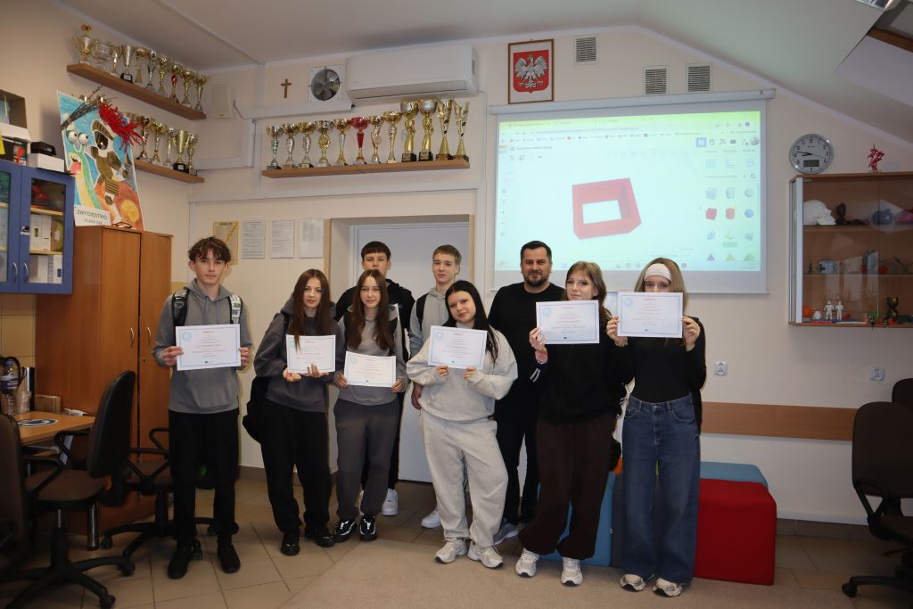Starsze klasy poznawały świat modelowania przestrzennego. Uczniowie zobaczyli przykłady gotowych modeli i wydruków 3D, nauczyli się obsługi programów do grafiki trójwymiarowej, a na platformie Tinkercad wykonali swoje pierwsze projekty. Podczas warsztatów zdobyli wiedzę z zakresu: